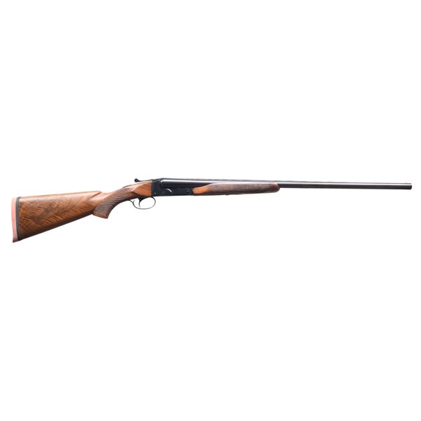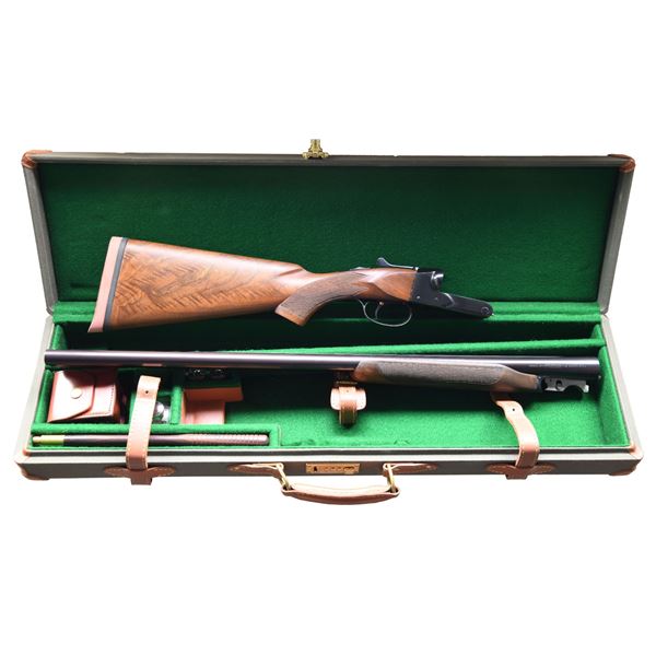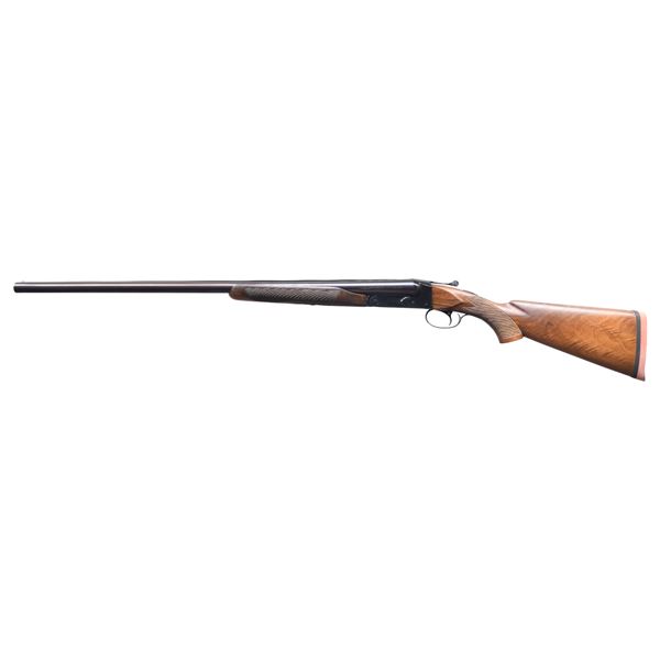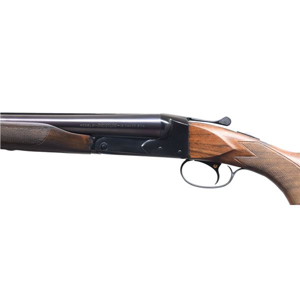 Cal. 12 ga. 2 3/4". S# 24856. Bbls. 28" w/ steel bead. Fixed Mod & Full chokes. Blued boxlock action w/ ejectors & single selective trigger. Beavertail forearm w/ kidney pattern checkering & uncapped pistol grip stock of checkered walnut. LOP: 14 5/16" over an aftermarket solid red pad. UNATTACHED ACCESSORIES: modern canvas covered leather trimmed takedown luggage case w/ green velour fitted interior. Case contains 3 piece ebony cleaning rod, leather pouch of cleaning brushes/accessories, silver finished oil bottle, snap caps & an original Model 21 catalog. Also included in an invoice dated 12/28/2009 from Simmons of Olathe, KS. Invoice lists work completed as reblue, install reproduction pad & refinished stock/forearm. Total cost: $795. CONDITION: over 99% refinished wood & metal. Bores show some light pitting. Action is tight. (24-2937/DS). MODERN. $1,500-2,500.
