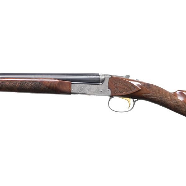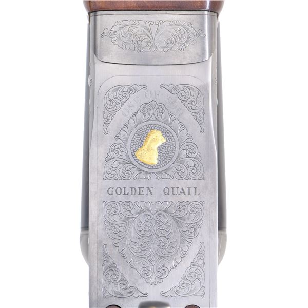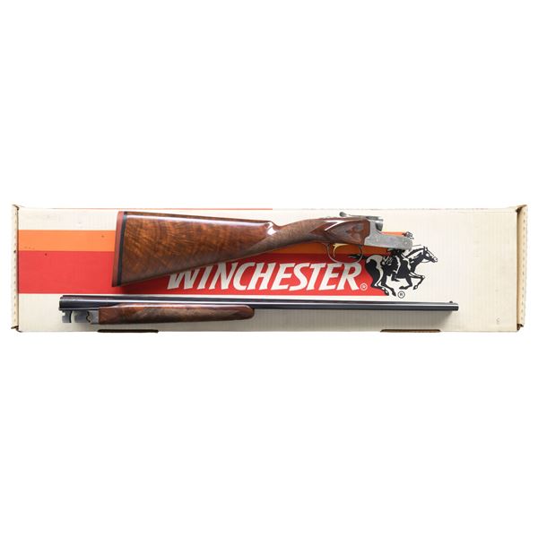 Cal. 410 ga. 2 1/2" & 3". S# GQ410-82E. Bbls. 25 1/2" w/ fixed Mod & Full chokes. White target front sight w/ white mid bead. Satin silver boxlock action w/ scroll engraving surrounding prairie chickens on the right side & pointer w/ flushing quail on the left side. Floorplate has a raised gold bust of a quail. Gold finished SST. Ejectors. Trim beavertail forearm & straight grip stock of gloss finished fancy black walnut having fleur-de-lis checkering. LOP: 14 1/8" over a solid red Winchester pad. DAC: 1 1/2". DAH: 2 1/2". Neutral cast. WEIGHT: 6lbs, 5.8 oz. Mfg. 1987. UNATTACHED ACCESSORIES: original box containing service center list. CONDITION: near new, retaining 99% finish. Stock shows small scratches & marks. Bright near excellent bores. (25-781/DS). MODERN. $3,000-5,000.