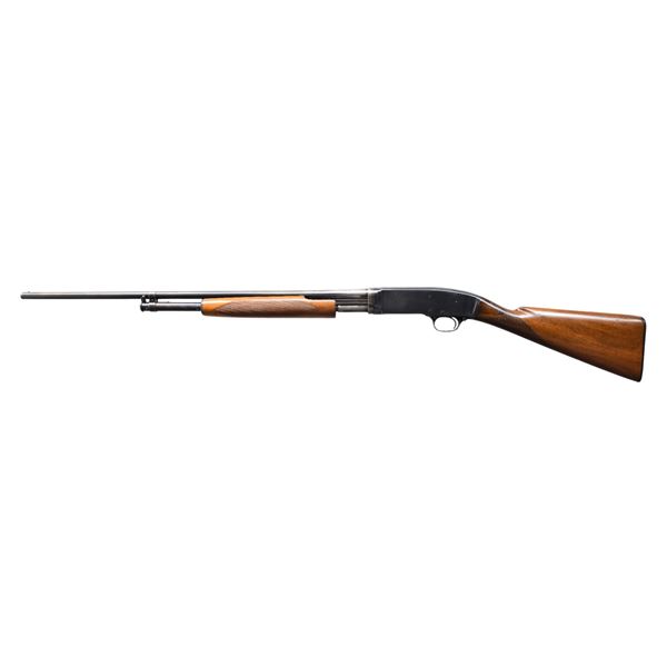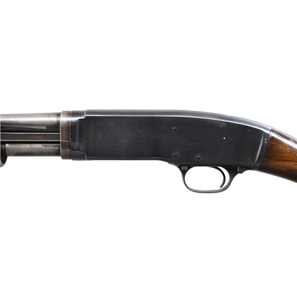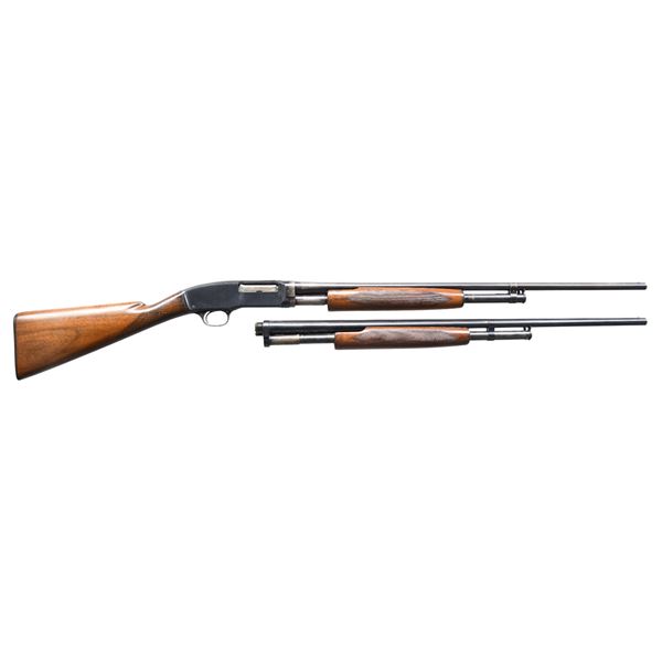 BARREL. Cal. 410 3". S# 10762. Bbl. 1: original 26" plain w/ Skeet choke & steel bead. Bbl. 2: added 28" solid rib w/ Full choke & steel bead. Both bbl. assemblies have beavertail forearms w/ Skeet checkering. Straight grip walnut Skeet stock w/ checkered wrist & original buttplate. Mfg. 1934. CONDITION: receiver retains 95% reblued finish showing spots of remaining pitting. Bbl. set 1 has 70% lightly faded blue w/ extension fading to gray & showing scattered spots of corrosion & light pitting. Bbl. number 2 has 90% reblued finish w/ receiver extension fading to gray & showing surface corrosion. Both bbls. have good bright bores. Both forearms have lightly worn finish & checkering showing scattered light marks. Heavily sanded & refinished stock has thinned checkering w/ small crack extending from receiver tang. Buttplate is cracked through the center. PROVENANCE: The estate collection of Don "Duck" Combs. (24-2485/DS). CURIO. $3,000-4,500.