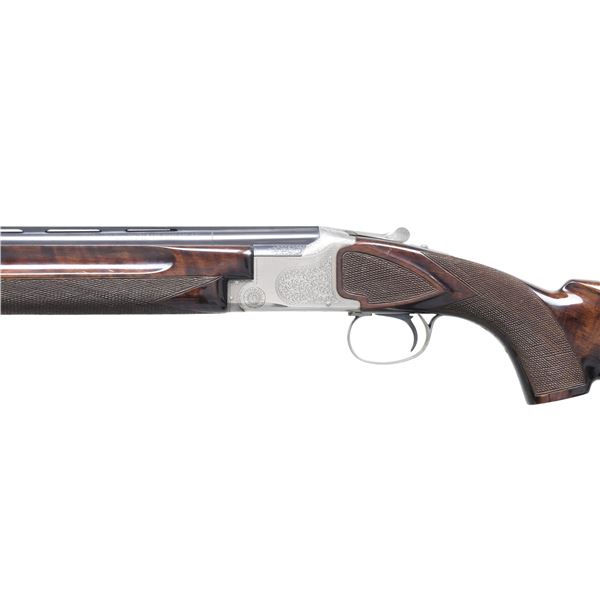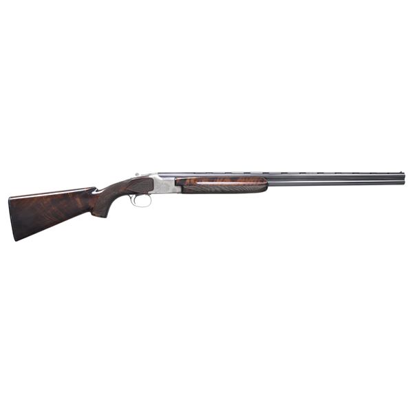 LIGHTWEIGHT O/U SHOTGUN. Cal. 20 Ga., 2 3/4" & 3". S# PK250820. Mfg. in Japan between 1974-1987. VR 28" barrels with white front bead. Rib engraved "PIGEON GRADE". Fixed Full over Mod chokes. Deluxe engraved silver finished receiver with scroll engraving on sides & pigeon on bottom. SST & ejectors. Field style checkered select walnut forearm & Select walnut buttstock with checkering at wrist & ears. LOP: 14.5" to Win. buttplate. WEIGHT: 6.5 lbs. CONDITION: very good original blue with occasional pinprick patina & light handling marks. Very good silver finish with peppery oxidation on triggerguard tang. Good gloss wood finish with numerous handling marks. Very good shiny bores with light fouling. (25-214/MD). MODERN. $1,500-2,500.