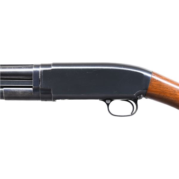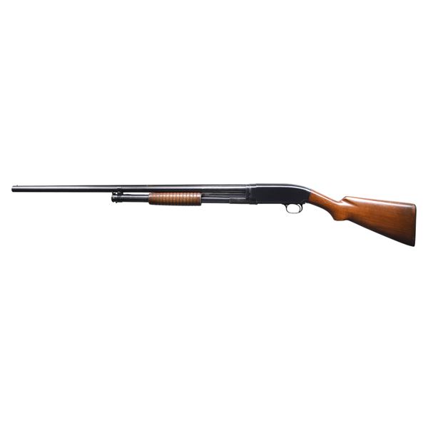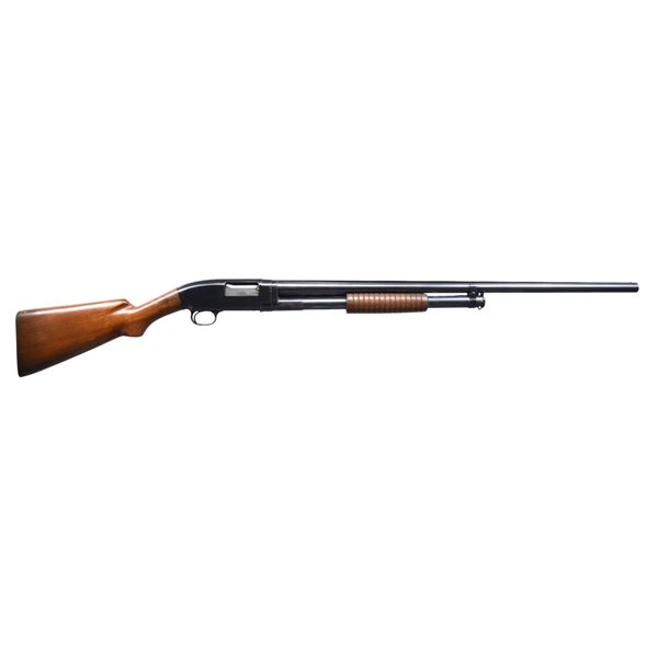Cal. 16 ga. . S#. 381786. Bbl. 28" Nickel Steel w/ solid rib & steel bead. Fixed Full choke. Small round grooved forend & early style pistol grip stock w/ original buttplate. Mfg. 1925. CONDITION: 90% lightly worn original blue showing slide & carry wear. Original wood finish shows wear spots with scratches & marks. Sound mechanics. Very good bore. PROVENANCE: The estate collection of Don "Duck" Combs. (24-2516/DS). CURIO. $700-1000.