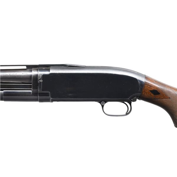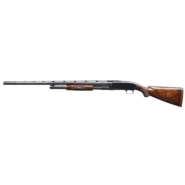 Cal. 12 ga. S# 389172. Bbl. 30" of Nickel Steel having 2 pin milled vent rib w/ buck bill extension. Steel front & mid bead. Fixed full choke. Small round forearm & hard rubber capped pistol grip trap stock of fancy walnut w/ trap grade hand checkering. Stock has black diamond inlays on both sides of wrist. LOP: 14" over a Hawkins pad. Mfg. 1924. CONDITION: over 80% lightly worn original blue showing slide & edge wear. Left side of receiver has takedown marks. Forearm has lightly worn original finish & checkering showing scattered marks. Refinished stock has thinned checkering w/ a few light handling marks. Sound mechanics. Very good bore. PROVENANCE: The estate collection of Don "Duck" Combs. (24-2521/DS). CURIO. $1,500-2,000.