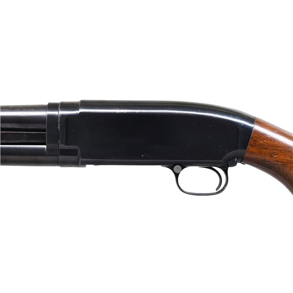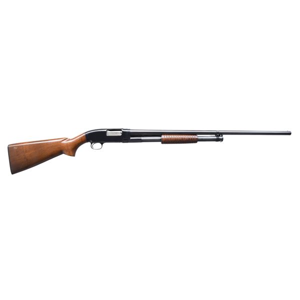 Cal. 16 ga. 2 3/4". S# 950221. Bbl. 28" plain of Winchester proof steel. Steel front bead. Fixed MOD. choke. Small round grooved forearm & pistol grip walnut stock w/ original buttplate. Mfg. 1942. CONDITION: over 95% original blue showing slide wear. Original stock finish shows scratches, marks & dents. Sound action. Very good bright bore. (24-6295/DS). CURIO. $400-600.