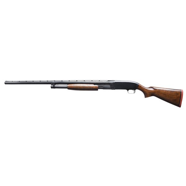 PUMP SHOTGUN. Cal. 12 ga. 2 3/4 & 3". S#. 1760586. Bbl. 30" w/ factory large round post Special vent rib & steel beads. Fixed Full choke. Large round grooved forend & heavy duck stock w/ lead. LOP. 13 1/2" over original solid red Winchester pad. Mfg. 1959. CONDITIOIN: over 97% original blue. Very good refinished wood. Sound mechanics Very good bright bore. (24-6293/DS). CURIO. $1200-1800.