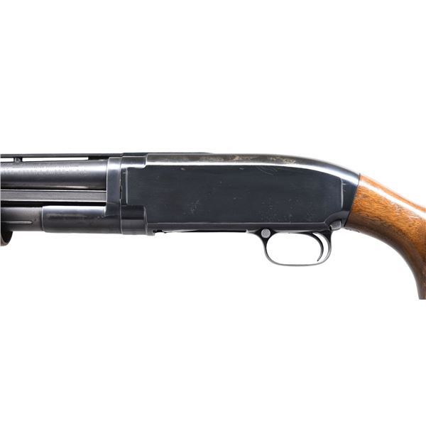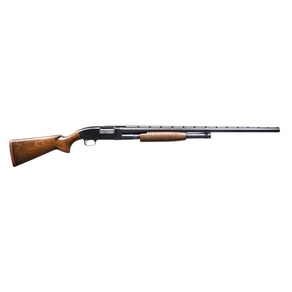 PUMP SHOTGUN. Cal. 12 ga. 2 3/4 & 3". S# 1788816. Bbl. 30" w/ factory large round post special vent rib & steel beads. Fixed full choke. Large round grooved forearm & heavy duck pistol grip stock w/ lead weight. LOP: 13 1/2" over original solid red Winchester pad. Mfg. 1959. CONDITION: over 90% original blue showing slide wear w/ small spots of corrosion. Original wood finish shows numerous scratches, marks & small spots of finish loss. Sound action. Very good bore. (24-6294/DS). CURIO. $700-1,000.