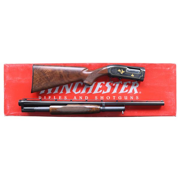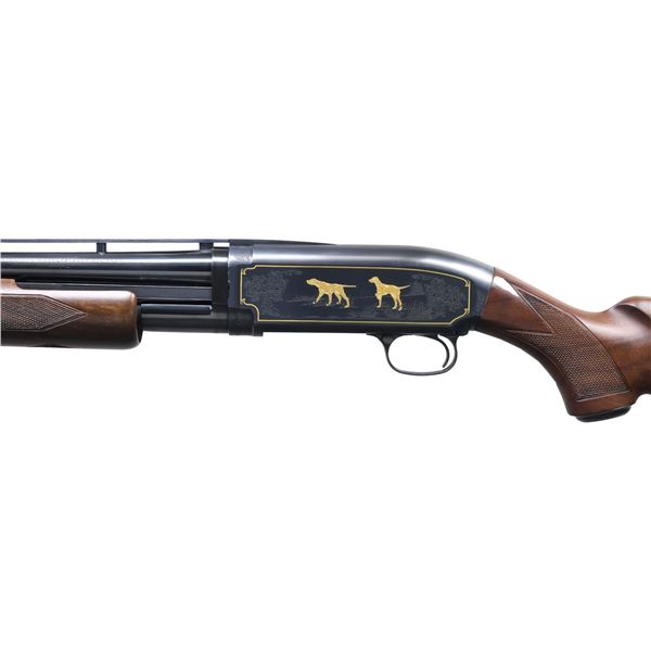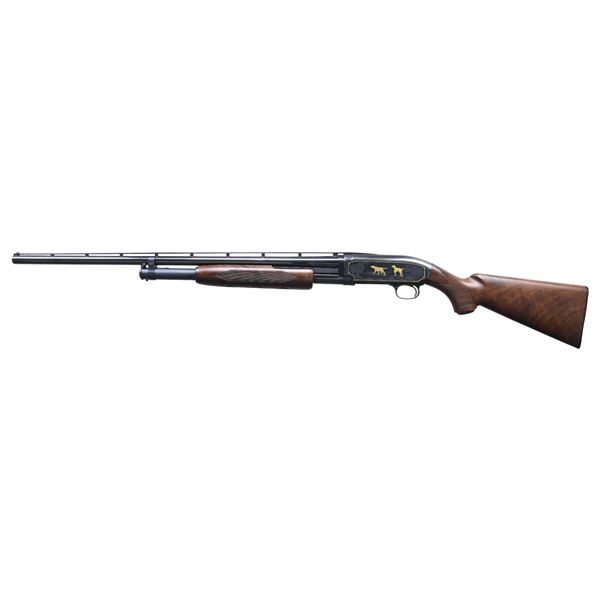 SHOTGUN. Cal. 20 ga. 2 3/4". S# WMT0704. Bbl. 26" vent rib w/ fixed Imp cyl. choke. White target front sight. Right side of action has gold plated ducks & borders. Left side of action has two gold plated pointing dogs w/ gold borders. Scenes are bordered by foliate scroll that continues to upper & lower receiver areas. Polished blue finish. Beavertail forearm & steel capped pistol grip stock of satin finished select walnut features 22 LPI cut checkering & plastic buttplate. Limited edition of 1,000 mfg. in Japan by Miroku 1993-1995. UNATTACHED ACCESSORIES: foam-lined red box containing instructions & hang-tag. CONDITION: as new, appears unfired, retaining over 99% original finish. (25-730/DS). MODERN. $1,800-2,500.