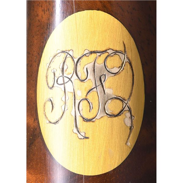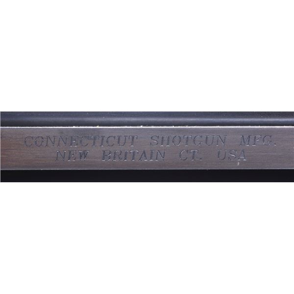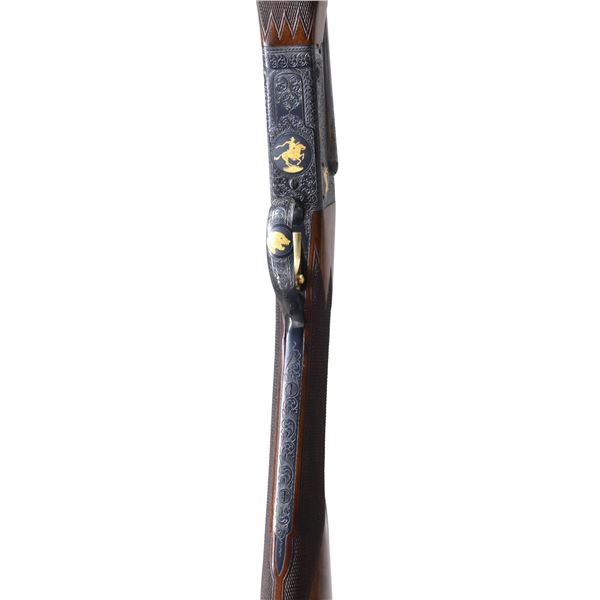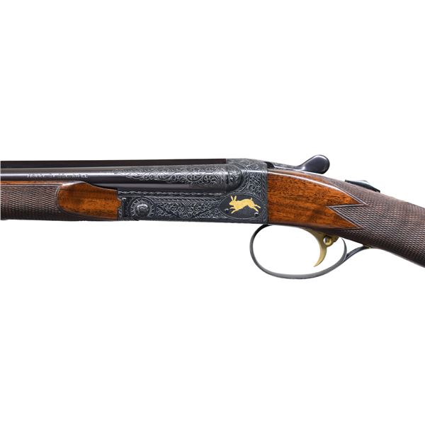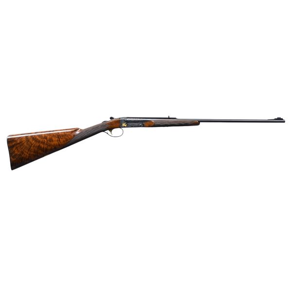 RIMFIRE RIFLE. Cal. 22 LR. S# SWR38663. CSMC is one of America's premier gunmakers known for their best quality O/U & SXS shotguns. The delightful small frame double rifle was introduced in 2006. Bbls. 22". Ramp mounted bead front sight w/ quarter-rib mounted fixed square notch rear sight having gold wire sighting border. Small frame boxlock action is scaled in proportion to the caliber. No.5 factory engraving featuring vignettes w/ gold figures. Right side shows a squirrel, left side a cottontail rabbit. Trigger guard shows a snarling ferret & the floorplate has the Winchester horse & rider emblem. Scenes are surrounding by full coverage arabesque scroll & fancy borders that extend to trigger guard tang & forearm iron. Gold plated SST. Selective ejectors. Breech face, receiver & bbl. water tables, inside of forearm & ejector hammers are machine-jeweled. Trim beavertail forearm w/ ebony insert & straight grip stock of fancy black walnut having fine point pattern hand checkering. Toeline of stock has an oval nameplate w/ initials that may be "RFD". LOP: 14 1/8" over checkered butt w/ skeleton steel buttplate engraved to match the action. DAC: 2 1/4". DAH: 3 3/8". Stock has approx. 1/8" cast on. WEIGHT: 5 lbs. CONDITION: near new, retaining virtually all wood & metal finish. Nameplate in toeline of stock shows spotted loss of finish. Bright near excellent bores. (25-201/DS). CURIO. $15,000-22,000.
