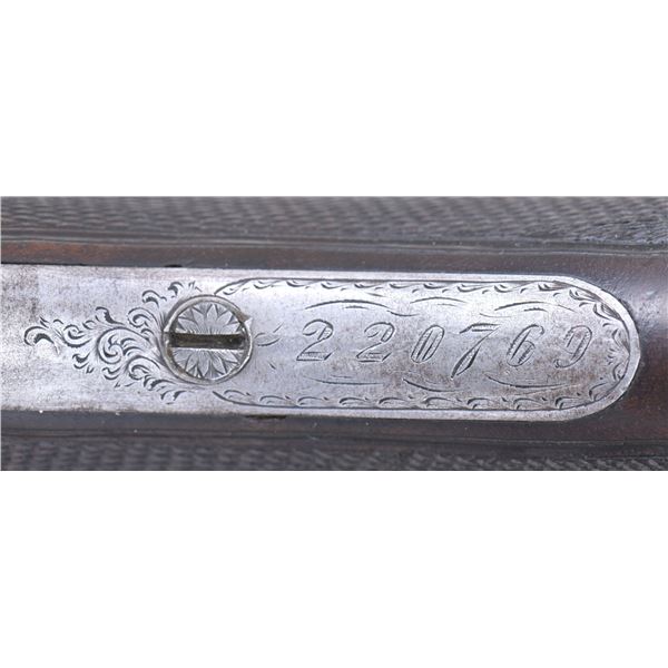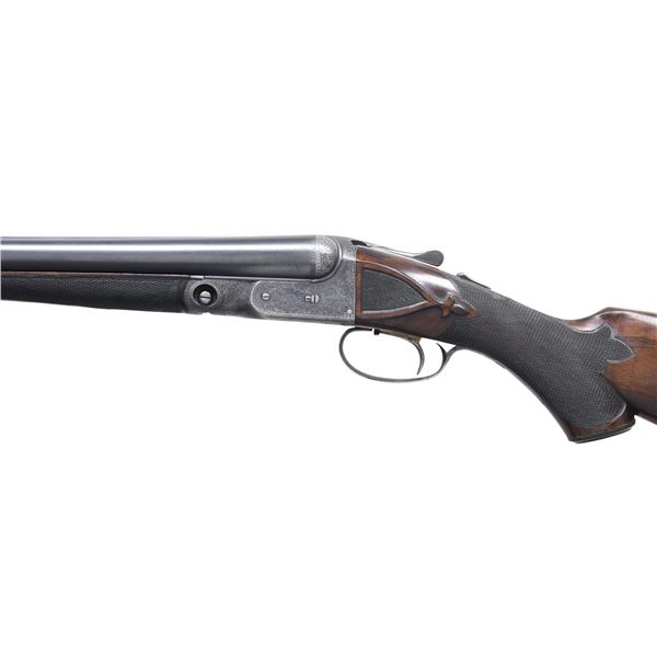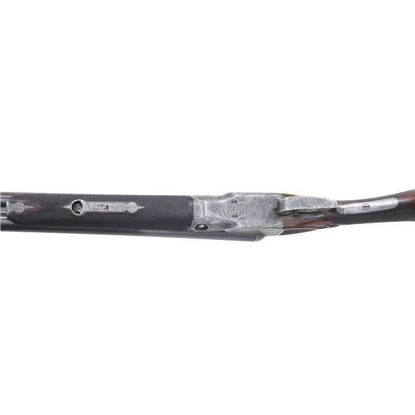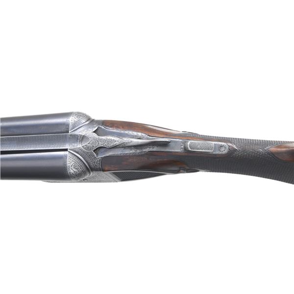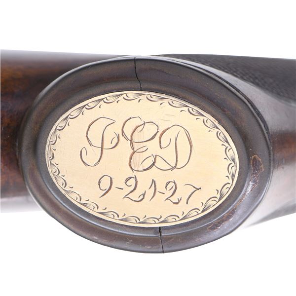 Cal. 12 ga. 2 3/4". S# 220769. Bbls. 28" of Acme Steel are marked "Overload Proved". Steel front bead. 1 1/2" frame. Case colored boxlock action w/ fancy fences & B grade factory engraving. Right side scene features two pointers. Left side features a setter & a pointer. Floorplate shows two flying geese. Balance of receiver has arabesque scroll engraving w/ fancy borders that continue to the trigger guard bow & forearm iron. Breech end of bbls. have borderline engraving. Aftermarket single selective trigger. Selective ejectors. Steel tipped splinter forearm & hard rubber capped pistol grip stock of nicely grained walnut w/ gloss finish & "B" grade hand checkering. Additional checkering on stock ears w/ fleur-de-lis finials. Brass plate on grip cap has an engraved border w/ initials "JED" over a date of "9-21-27". LOP: 13 3/16" over checkered butt w/ engraved skeleton steel buttplate. DAC: 1 5/8". DAH: 3". Stock has approx. 1/4" cast off. WEIGHT: 7 lbs, 5.6 oz. Mfg. 1927. Bore diameter: RT .729, LT .729. Choke constriction: RT .032, LT .010. Minimum wall thickness: RT .035, LT .033. CONDITION: bbls. retain 90% lightly faded blue showing small marks. Action has lightly visible case colors on its sides w/ fading in carry areas. Wood shows light finish & checkering wear w/ scattered small scratches & marks. Action is tight w/ top lever sitting right of center. Very good bright bores. (25-729/DS). CURIO. $9,000-11,000.