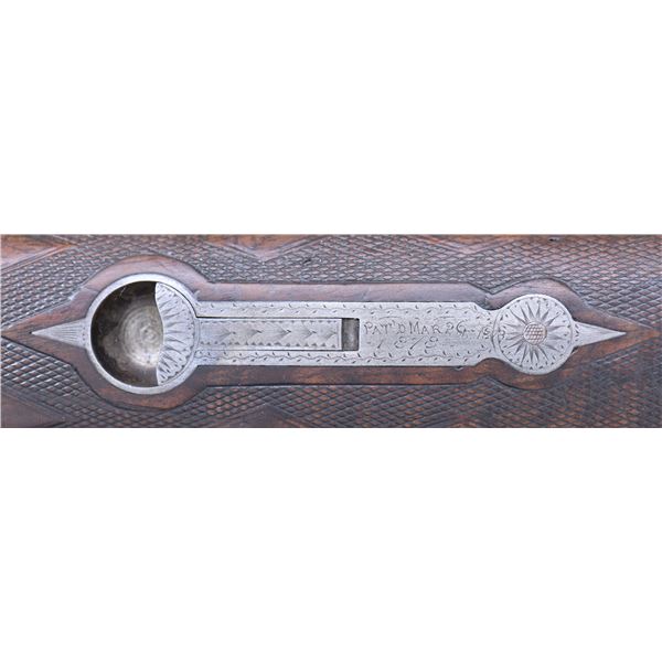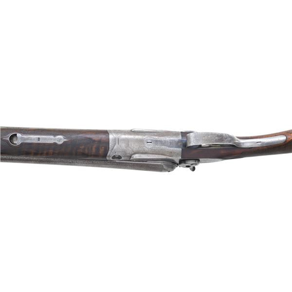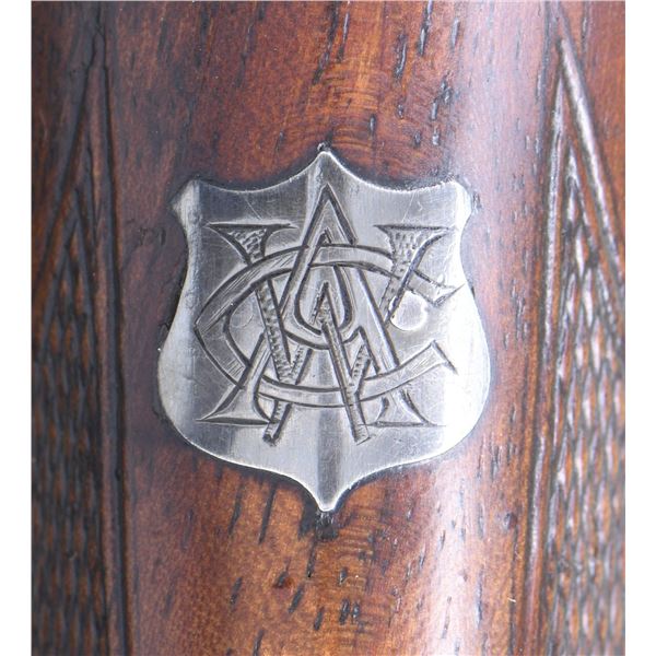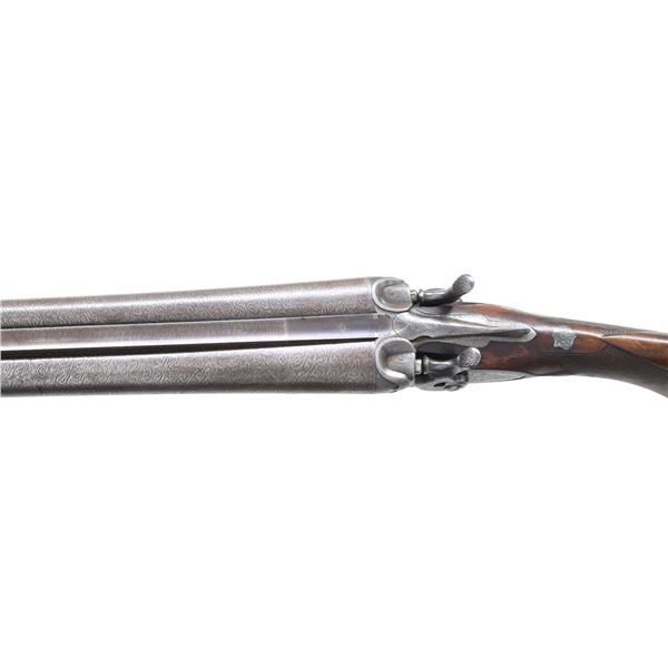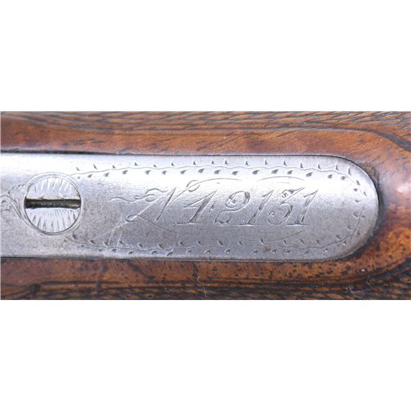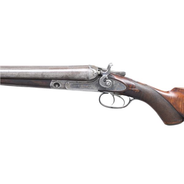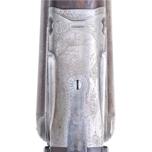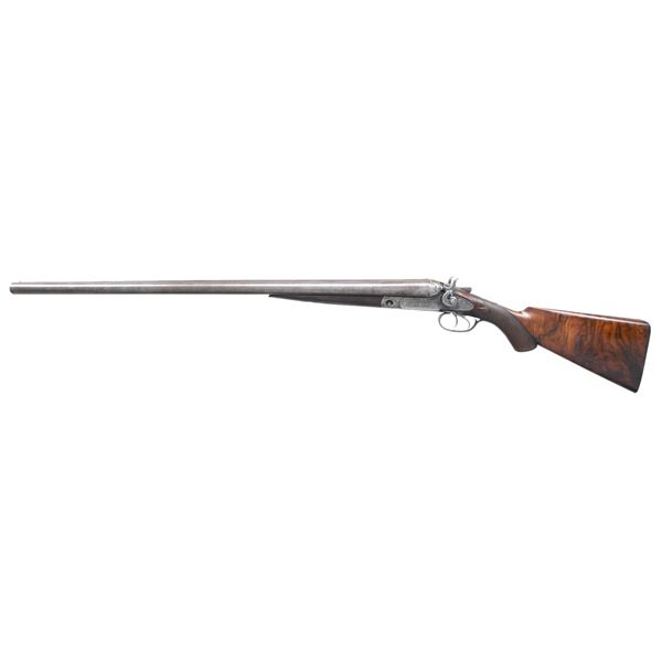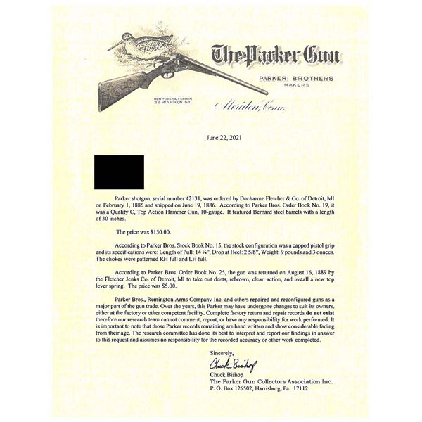 Cal. 10 ga. 2 7/8". S# 42131. Bbls. 30" w/ fixed Full & Full chokes. Rib is marked "BERNARD STEEL". Bbls. have a browned finish showing good damascus pattern. Steel front bead. Top lever hammer action w/ sculpted bolsters. Water tables of the bbl. & frame have clear "B" quality markings & "4" grade markings, showing one grade higher than listed in the Parker Gun Collector's Association letter. Action has B grade factory engraving featuring pointing dogs on the lockplates. Balance of action has delicate arabesque scroll engraving w/ fancy borders. Double triggers. Extractors. Steel tipped splinter forearm & hard rubber capped pistol grip stock of fancy European walnut, having drop points & B grade hand checkering. Top of wrist has German silver shield engraved w/ overlaid initials "CAW". LOP: 14 1/4" to a checkered butt w/ engraved skeleton steel buttplate. DAC: 1 15/16". WEIGHT: 9 lbs, 1.4 oz. UNATTACHED ACCESSORIES: The Parker Gun Collector's Association Inc. letter, "Parker shotgun, serial number 42131, was ordered by Ducharme Fletcher & Co. of Detroit, MI on February 1, 1886 and shipped on June 19, 1886. According to Parker Bros. Order Book No. 19, it was a Quality C, Top Action Hammer Gun, 10-gauge. It featured Bernard steel barrels with a length of 30 inches. / The price was $150.00. / According to Parker Bros. Stock Book No. 15, the stock configuration was a capped pistol grip and its specifications were: Length of Pull: 14 1/4", Drop at Heel: 2 5/8", Weight: 9 pounds and 3 ounces. The chokes were patterned RH full and LH full. / According to Parker Bros. Order Book No. 25, the gun was returned on August 16, 1889 by the Fletcher Jenks Co. of Detroit, MI to take out dents, rebrown, clean action, and install a new top lever spring. The price was $5.00.". CONDITION: bbls. retain 40% thinning browned finish showing a good damascus pattern. Action retains lightly faded case colors on lockplates & protected areas w/ balance of action having faded to gray. Stock & forearm have moderately worn finish & checkering, showing scratches, marks & small dents. Sound mechanics, top lever sits slightly left of center. Bore shows areas of light pitting. (01-26536/DS). ANTIQUE. $5,000-7,000.