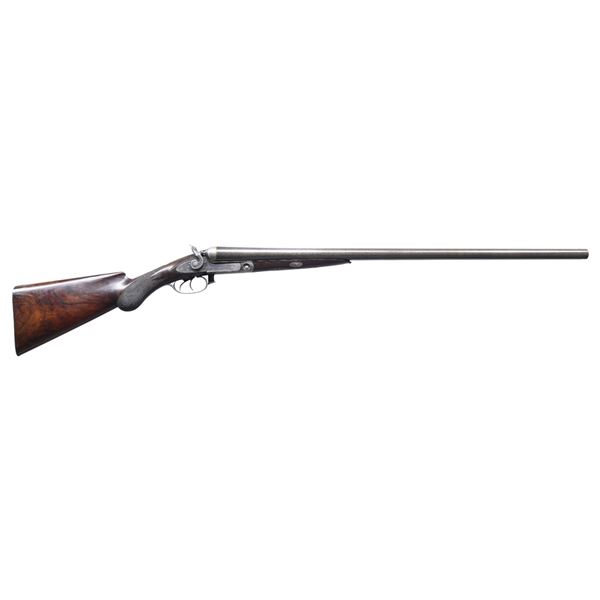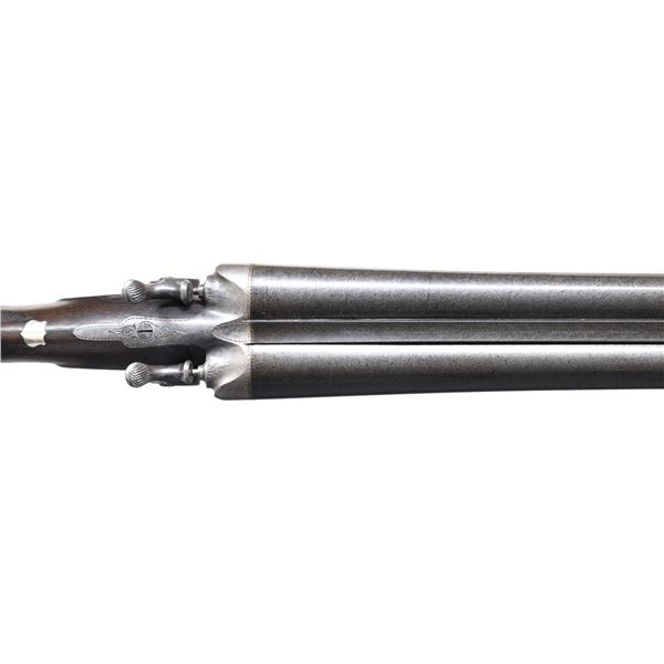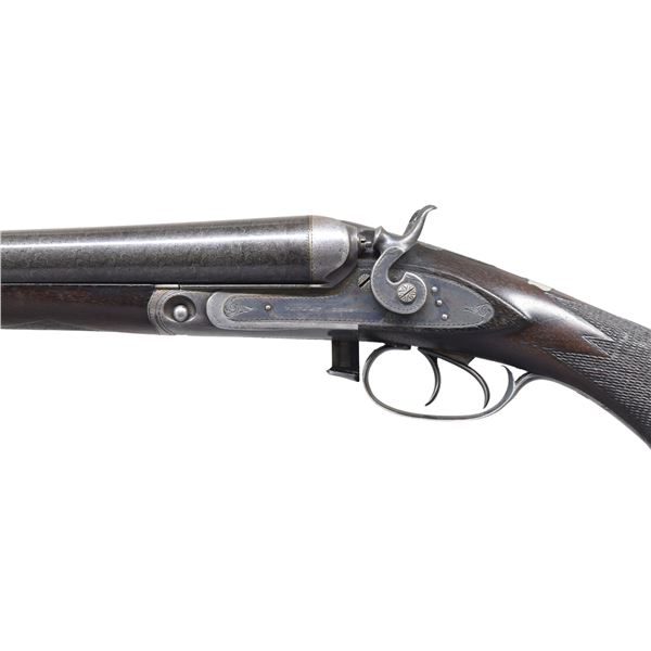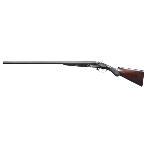 Cal. 10 Ga. 2-7/8". S#11080 (1877). The 30" damascus barrels are hand engraved "PARKER BROS MAKERS MERIDAN CONN. DAMASCUS STEEL" on narrow swamped game rib. Correct markings are on barrel flats and frame size is "3". Case hardened lifter action fitted with front spring rebounding locks is of early style with one piece hinge pin, off set firing pins and square juncture of watertable and standing breech. Fences are nicely fluted and action and lockplates are engraved with sprays of scroll and geometric borders. "1875" patent date is on trigger plate. S# is on trigger guard tang. Nicely crotch figured American walnut round knob pistol grip buttstock measures 14-1/4" over steel buttplate. Point pattern checkering is at grip and a German silver shield is at top of grip. Matching splinter forend with steel tip has sidebolt release. MEASUREMENTS: BBLS: Bore Diameter: L .796. R .796. Restriction: L .033 (full). R .033 (full). Wall thickness: L .050. R .050. STOCK: DAH: 3". DAC: 1-7/8". CAST: neutral. LOP: 14-1/4". WEIGHT: 9 lb. 4 oz. CONDITION: very fine; partially refinished. Barrels retaining nearly all of a well done black and white refinish. Action retains about 40% original color. Locks retain about 90%. Trigger guard is flaked to gray-brown. Stocks retain most of their original oil finish with some marks. Checkering is lightly worn. Bores are good to very good; shiny with some scattered pitting. Action is tight. Mechanically good. (01-26612/MGM). ANTIQUE. $2,000-3,000.