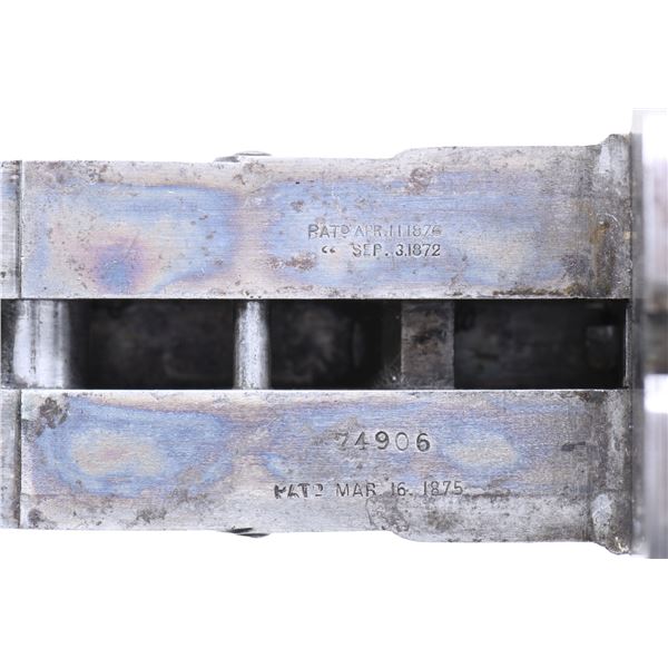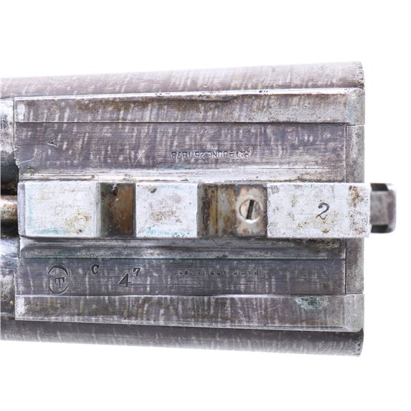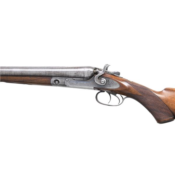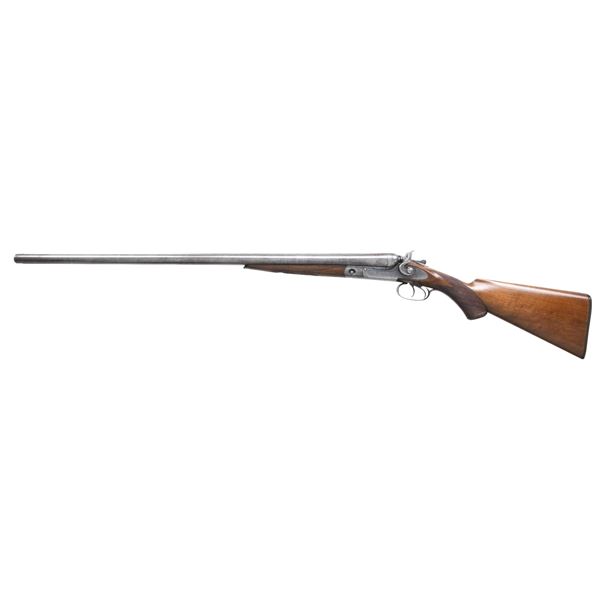 Cal. 12 Ga., 2 5/8". S# 74906. Mfg. 1892. Twist steel 30" barrels with matted rib having bright bead. Fixed Mod. chokes. Size 2 frame with double triggers, extractors & top lever offset to the left for right handed shooter. Splinter walnut checkered forearm with steel tip, patented release & matching numbered iron. Pistol grip walnut buttstock with hard rubber grip cap. LOP: 13 5/8" to dog's head buttplate. DAC: 2". DAH: 3". WEIGHT: 8 lbs., 3 oz. CONDITION: barrels have gray patina appears with scratches, peppery oxidation throughout along with prior cleaned pitting around breech end. Receiver has case colors in protected areas & locks show colors on edges with balance having a gray mixing with brown patina appearance. Wood has been lightly sanded & refinished showing recut checkering on wrist & forearm & scattered handling marks. Bores show pitting throughout with series of small & large dents approx. 9" from muzzle. (01-26610/MD). ANTIQUE. $2,000-3,000.