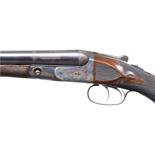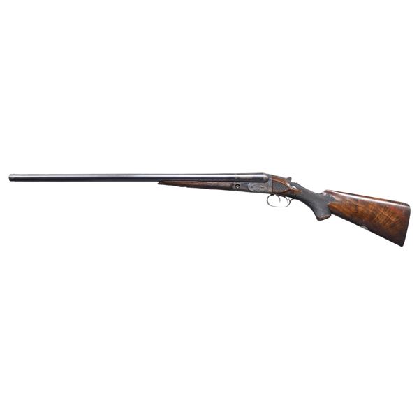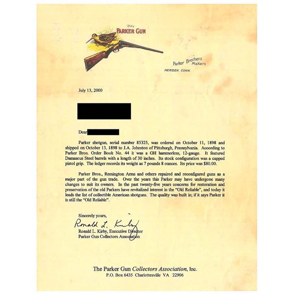 SHOTGUN. Cal. 12 ga. S# 85325. Bbls. 27" sleeved. Breech area of left bbl. is marked "WESTLEY RICHARDS / LONDON ENGLAND". IC & Mod chokes. Ivory front & mid beads. Case colored action has G grade hand engraving. Double triggers. Extractors. Splinter forearm & hard rubber capped pistol grip stock of nicely grained black walnut. Forearm has nearly full coverage hand checkering. Stock has fancy hand checkering w/ additional checkering on ears & fleur-de-lis drop points. Toeline of stock has a German silver nameplate. LOP: 14 1/2" to a checkered skeleton steel butt. DAC: 1 5/8". DAH: 3 1/4". Neutral cast. UNATTACHED ACCESSORIES: included is a Parker Gun Collector's Association letter detailing grade GH, original bbls., 30" of damascus steel, shipped Oct 13 1898 to J.A. Johnston of Pittsburgh PA. CONDITION: sleeved bbls. retain 98% finish. 90% restored case colors. Refinished wood shows scratches & marks. Forearm latch spring is broken. Very good bores. (01-26405/DS). ANTIQUE. $1,200-1,600.