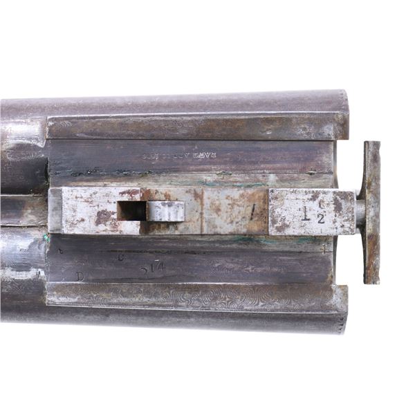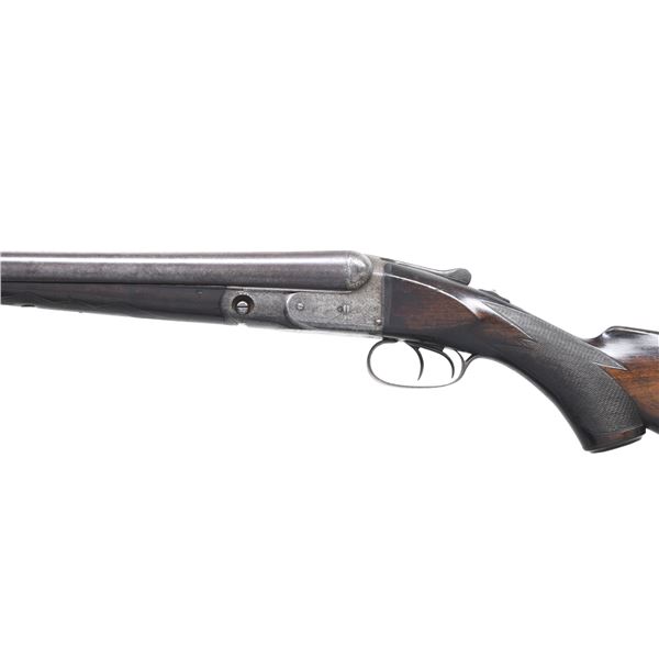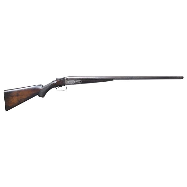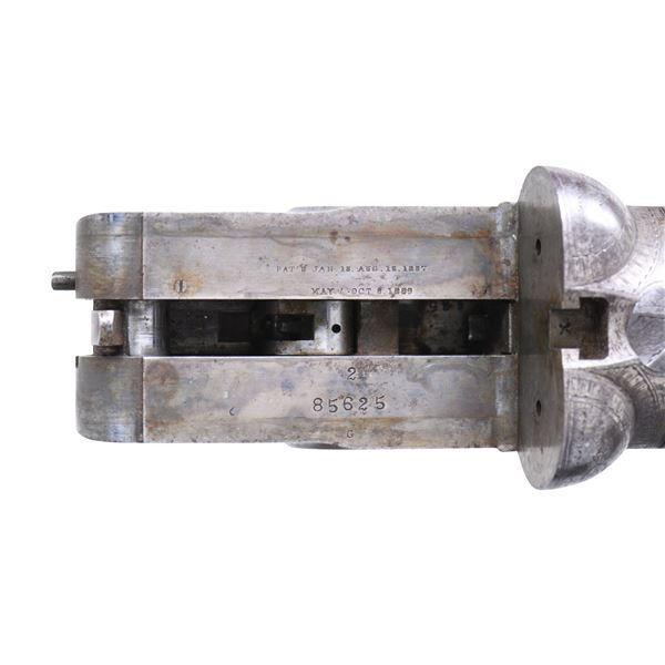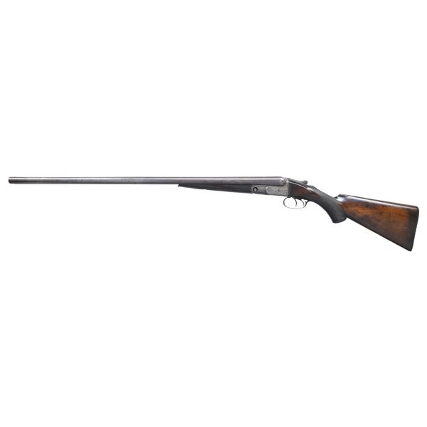 Cal. 12 Ga., 2 5/8". S# 85625. Mfg. 1897. The Damascus 30" barrels have matted rib with bright front bead. Full chokes. Receiver has acanthus scroll engraving highlight scene of quail on left side, ducks on right & pheasant on bottom. Engraving extends to fences, forearm release. Action features inletting for doll's head rib extension, double triggers, extractors & auto-safety. Splinter walnut forearm with point pattern checkering, patented release & matching numbered iron. Pistol buttstock with hard rubber grip cap & toeline name shield. LOP: 13 3/4" to dog's head buttplate. WEIGHT: 7 lbs., 5 oz. CONDITION: metal show brown / gray patina throughout with peppery oxidation & marks. Wood has an age related wear with checkering flattened to almost smooth appearance, large gouges & scattered sm. cracks. Bores show some shine with pitting forward of chambers, scratches & fouling. Barrels appear tight on face. (01-26970/MD). ANTIQUE. $1,200-1,800.