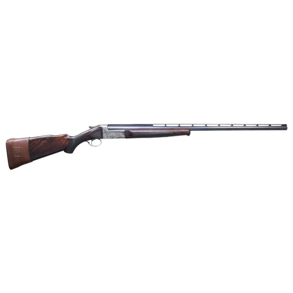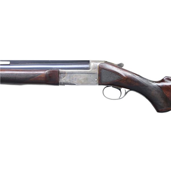 Cal. 12ga 2 3/4". S# S123601.S. Bbl is 32" vent rib w/ white front and mid beads. Choke is opened from FULL to MOD. Case colored boxlock action w/ rotary bolt locking. Automatic ejector. Engraving features a partridge on right side w/ portrait of hunting dog on left. Scenes are surrounded by open pattern vine type scroll w/ shaded backgrounds that continues to upper and lower receiver areas, trigger guard and forearm iron. Schnable tipped beavertail forearm w/ hard rubber capped pistol grip stock of fancy walnut. Bottom of forearm has added circular medallion marked "WGC/Inc". LOP: Altered to 14 5/8" over a poorly fit Hy-Gun pad and 1 1/4" of added wood spacers. LOP over a Redhead slip-on rubber pad is 15". Comb is cut and spliced with a gradual rise starting 1 3/4" behind the peak. DAC: 1 13/16". Drop at raised portion of comb: 1 7/8". DAH: 2 1/2". WEIGHT: 8lb 8 oz. CONDITION: 80% lightly worn bbl blue. Action retains 30% lightly visible case colors. Wood has added finish over checkering wear and handling marks. Bottom of forearm is dished between the release and forearm iron. Ejector is weak. Very good bore. (25-1552/DS). CURIO. $1,500-2,000.
