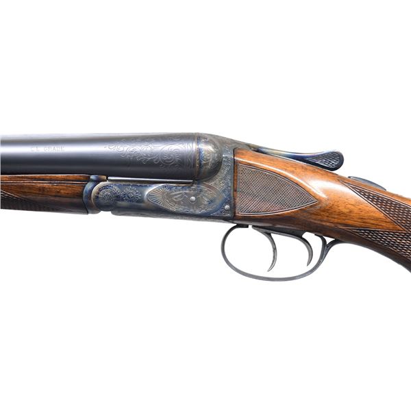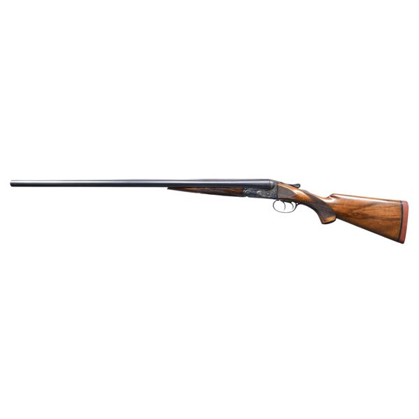 Please note as of 4/29/25 this item description has been updated. Please revisit this description and contact us with any questions. Cal. 12 Ga., 2 3/4". S# 33122A. Bbls. 28" with concave matted solid rib & steel front bead, choked IM & Mod. Case colored boxlock action features added fine scroll engraving with game bird vignettes on left and right plus pointing dog on bottom. Chambers of bbls decorated with matching fin scroll with straight and wavy borders at breech. Left bbl. marked on side "CE GRADE". Checkered walnut capped pistol grip stock & splinter forend. Stock ears have added checkering. Ejectors. Double triggers. Philadelphia Mfg. LOP: 14 1/4" over Old English pad. CONDITION: all finishes very good to near excellent as refurbished at time of upgrade. Bright shiny bores. Trigger pulls are a little strong. Ejectors are out of time. (25-1401/BH) CURIO. $1,200-1,800.