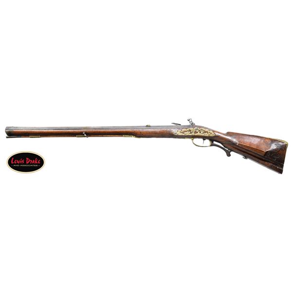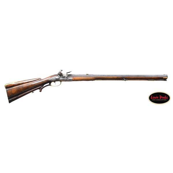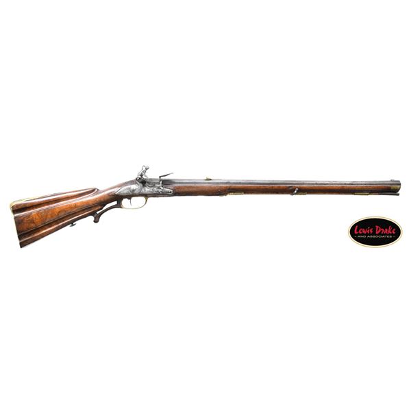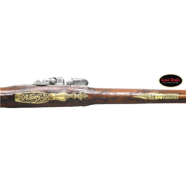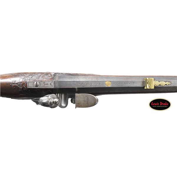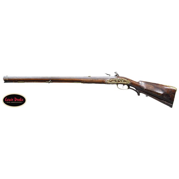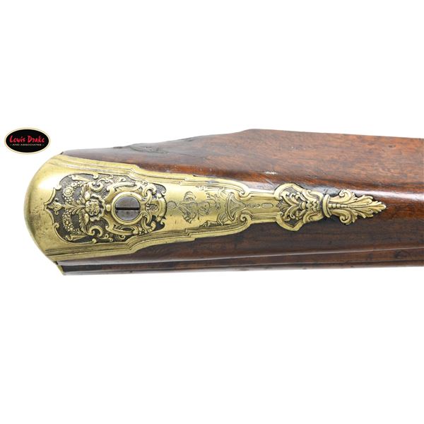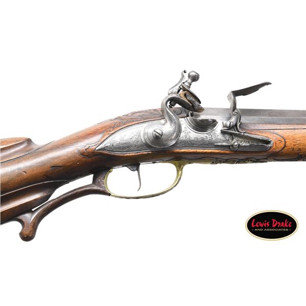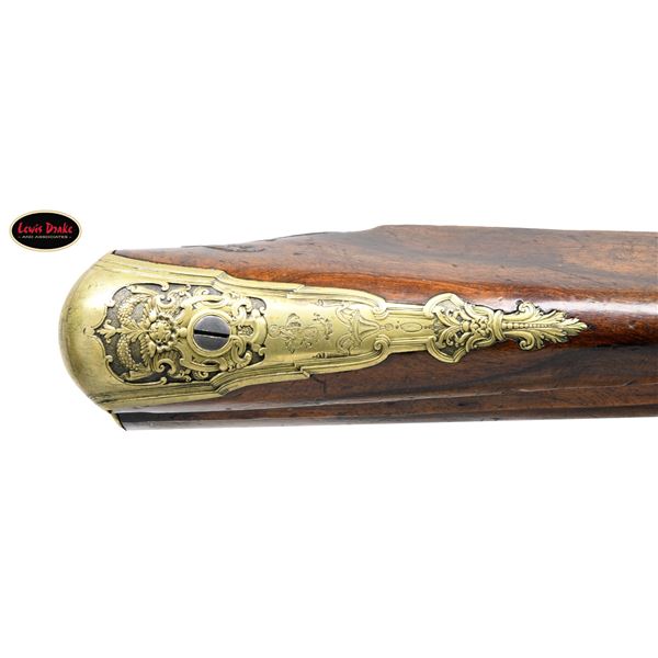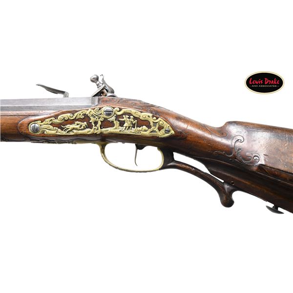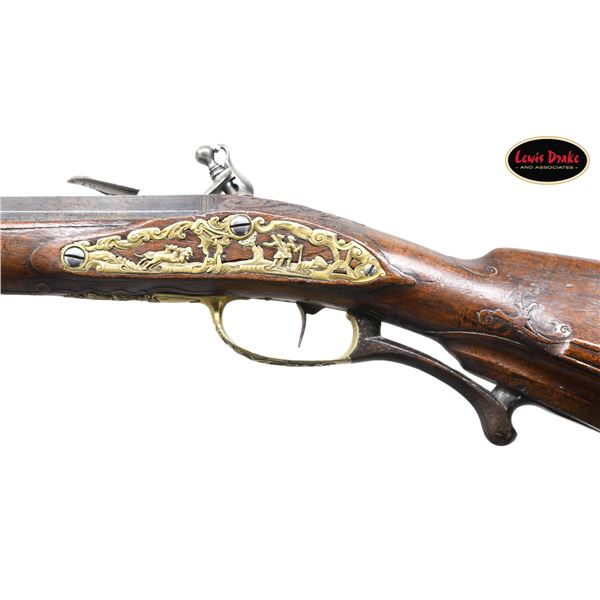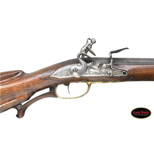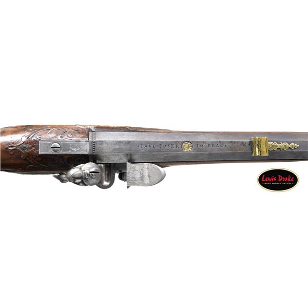 RIFLES BY PAUL POSER OF PRAGUE WITH WONDERFUL RAISED RELIEF ENGRAVED DETAILING BY FRANZ MATZENKOPF. Cal. 57. S# NSN. Paul Poser (1646-1730) ranked among the best craftsman working in the famed Bohemian area of iron production and gun making. Many surviving examples of his work are found in the finest arms collections throughout the world. His works include wheellock guns and rifles from the 1680's to early 1700's, as well as early flintlocks like this stunning pair. These rifles have 26-1/2" deeply swamped octagon barrels with dramatic flares at muzzles. Barrels are mounted with "V" notch bronze rear sights with two folding leaves and silver front beads. Top flats are engraved "Pavl. POSER (Gold poincon as shown on page 976 of Heer) IN. PRAG.". Barrel tangs are engraved with the numbers "1" & "2". Flint locks with rounded and slightly arched plates feature inset rounded pans, unbridled friction frizzens and feather springs with long filed spear finials. Serpentine cocks are also round bodied. Cocks and frizzens are neatly chased with some raised decoration. Feather springs are also decoratively filed. Locks are engraved with hunting scenes showing jaegers carrying guns being followed by dogs in front of cocks; stags run away on lockplate tails. The area framed by the feather springs is engraved "P. POSER". Stocks made of lightly marbled and figured European walnut extend to muzzles with horn caps and are pinned to barrels. Butts are deeply fluted reminicent of wheelock styling and moulded cheekpieces are on left sides. Areas behind barrel tangs as well as either side of cheekpieces are relief carved with open scrolls. Slightly raised mouldings surround locks and most furniture and extend along ramrod channels. Bronze ormolu furniture consisting of buttplates with large, long top tangs, pierced sideplates and trigger guards with foliate finials have engraved border mouldings and other incised work. This decoration frames superbly rendered relief chased carvings consisting of swags, ribbons and foliage surrounding grotesque faces on tops of buttplates. Full bodied statues of Diana goddess of the hunt, with her crescent coronet and hound at her side, are on trigger guard bows. Wonderful pierced sideplates are decorated with a border of relief carved scrolls outlining scenes of hunters at right and hounds retrieving a hare at left. Relief scroll is on octagonal ramrod pipes and grotesque faces are on thimbles. Original hickory ramrods with horn tips, sling loops and buttons are still in place. A rack or collection number "N3" is on each toeline. CONDITION: very fine with evidence of considerable use but meticulous maintence. Barrels show a good amount of original blue totalling as much as 10%. Locks retain most of their bright polish. Only traces of gold remain on furniture. Stocks show hand wear at carry points and also exhibit a large number of marks, dings and scratches. Frizzens show a considerable number of strikes, however pans remain free from any rust or pitting. Touch holes are normal size with some light pitting evident on rifle #2. Four groove rifle bores remain bright, sharp and shiny. Again, rifle #2 shows more wear. Locks and frizzens operate flawlessly. Although pairs of pistols were often made and remain together; the chance of finding a pair of rifles by a famous maker is very rare. PROVENANCE: from the renowned collection of quality sporting arms from Lewis Drake together with inventory of Lewis Drake Associates. (01-26149/MGM). ANTIQUE. $30,000-50,000.