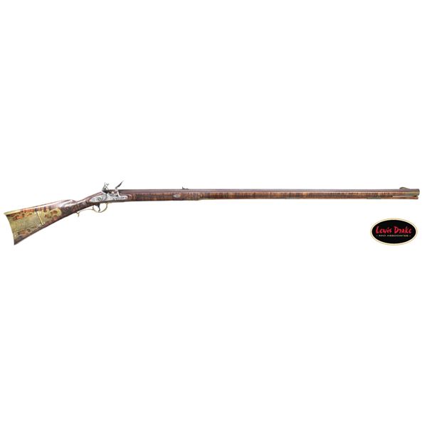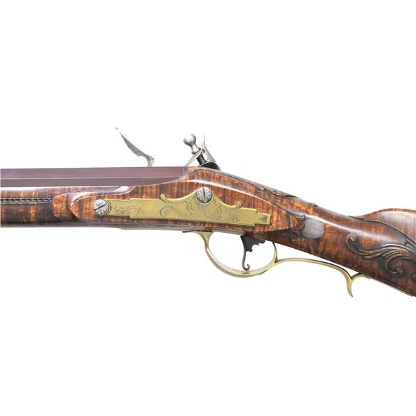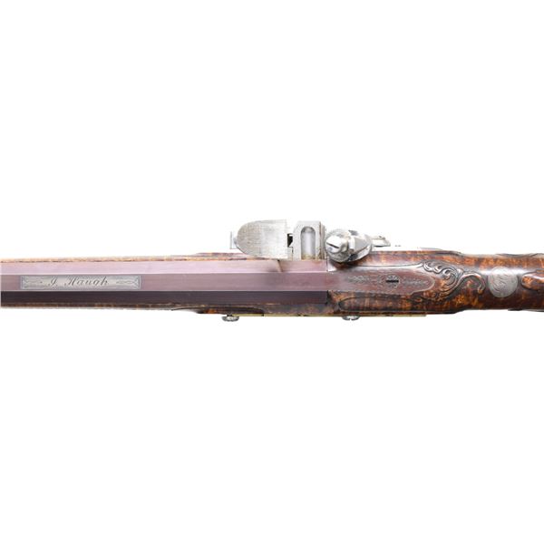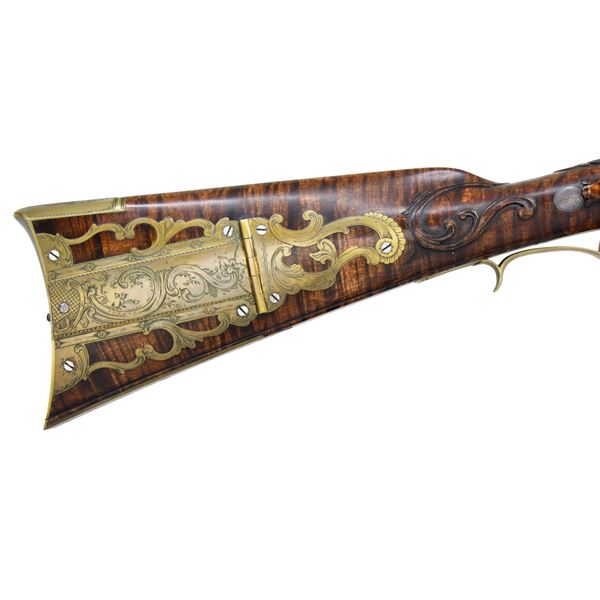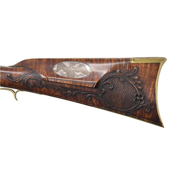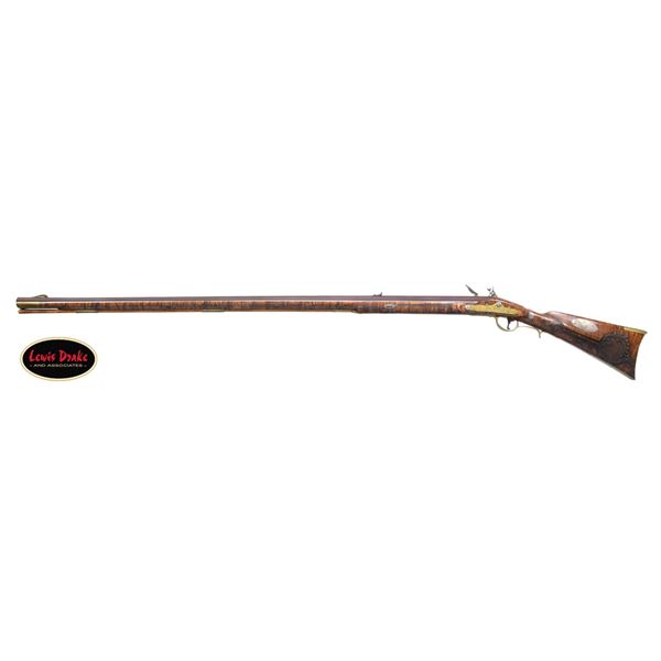 Cal. 50. S# NSN. Jack Haugh is rated among the top traditional rifle makers in this country. Although he does not forge his own barrels he completely hand makes locks, furniture, etc. This very fine raised carved Kentucky type rifle has 42" swamped octagon barrel with "V" notch rear and silver blade front sights. "J. Haugh" is engraved on silver poincon on top flat behind rear sight. Barrel has platinum lined touch hole. Hand made lock with slightly arched chamfered plate and file decorated rebated tail; is fitted with serpentine cock, inset faceted pan, bridled friction frizzen and file decorated feather spring with foliate finial. Lockplate, cock and frizzen show some well cut scroll engraving. Trigger is not set. Full length stock made of very fine curly maple is brass mounted and has some inlaid silver decoration. Buttplate with faceted top has button release for patchbox cover. Patchbox itself has many piercing with sideplates and finial in scrolled form. Trigger guard with chamfered bow has finger spur. Silver inlays are present behind lockplate at top of grip, behind sideplate and with large oval inlay above cheekpiece engraved with a heraldic American eagle. Other furniture is nicely scroll engraved. Stock extends to muzzle with 2" brass cap and is attached to barrel with three captive sidebolts without escutcheons and another toward rear that has oval silver escutcheons. Well executed raised carved foliate scrolls are behind barrel tang and on sides of butt. Raised mouldings are around lockplate, sideplate and along ramrod channel. Plain hickory ramrod mounts through two beaded and faceted pipes and matching thimble. CONDITION: exceptionally fine. Very close to "As New"; appears unfired with only one or two flint strikes on frizzen. Bores bright, sharp and shiny throughout. Lock is crisp. A very handsome handmade rifle by one of the best. PROVENANCE: from the renowned collection of quality sporting arms from Lewis Drake together with inventory of Lewis Drake Associates. (01-26122/MGM). ANTIQUE. $6,000-12,000.