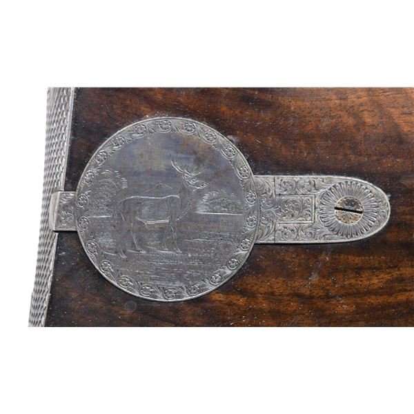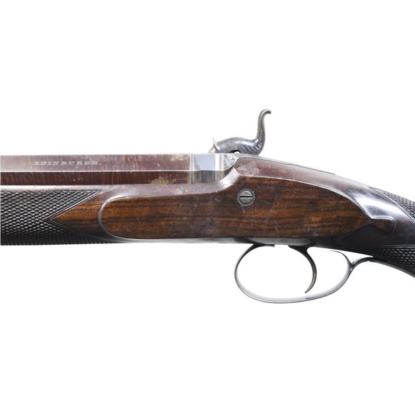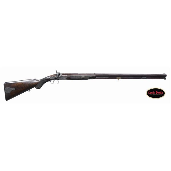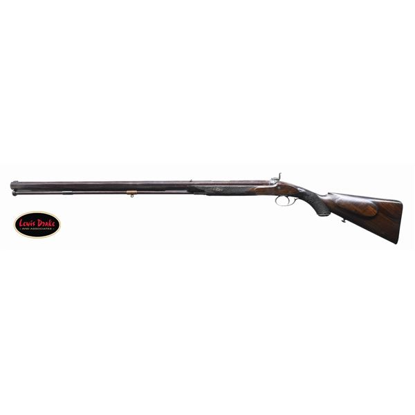STALKING RIFLE BY THOMAS GOULD OF EDINBURGH. Cal. 55. S# NSN. Thomas Gould is not listed in any of the common references as a gunmaker in Edinburgh or any other location. This rifle is beautifully made as are most Scottish guns and rifles of the period and closely resembles the work of Alexander Henry. Perhaps Gould was a journeyman gunmaker for Henry and this rifle was his masterpiece. It has 32" twist steel octagon barrel with under rib and is rifled with seven grooves. Top flat of barrel is file cut and fitted with square notch rear and sourdough front sights which appear to be later replacements. A 2-1/2" dovetail for express rear sight is filled. Barrel is engraved "THOMAS GOULD" on upper right flat and "EDINBURGH" on upper left. Bottom flat is stamped with Birmingham black powder proof and bore size "39". Case hardened breech plug with vented platinum blowout and scroll engraved breech iron are nicely filed in a style similar to that of Alexander Henry. Front spring percussion lock with flat faced serpentine hammer has front sliding stalking safety. Lock and hammer exhibit fine scroll engraving "THOMAS GOULD" is engraved at front under barrel. Trigger blade is checkered and steel trigger guard engraved with running stag on bow has checkered tang which extends to steel grip cap. Half stock of dense, dark, well figured European walnut measures 14-5/8" over checkered steel buttplate with short top tang. Tang is engraved with a recumbent stag. A standing stag graces spring loaded patchbox cover on right side of buttstock. Trigger plate has stylized pineapple finial reminiscent of that often found on Alexander Henry rifles. Stock also features beaded shadow line right hand cheekpiece, widely spaced point pattern checkering at grip and around forend, horn forend tip and a sling button along with a vacant silver oval on toeline. Original greenheart ramrod with horn tip and brass tail mounts through two plain pipes and nicely filed thimble. Stock attaches to barrel with captive side bolt through shaped and engraved steel escutcheons. CONDITION: exceptionally fine original finish, however stock has been broken through the wrist and repaired. Barrel retains over 90% original brown with fine definition to pattern. Nearly all original case hardening color remains on breech plug, iron and lock. Some bright blue remains on trigger guard. Trigger plate shows cleaning to silver. A large amount of original blue is on buttplate and patchbox exhibits over 90% color. Stock retains most of its original oil finish with a fair scattering of marks. Break through wrist shows evidence of repairs with some infill and re-cut checkering. Bore is bright and shiny. Lock is crisp. A very attractive well made rifle. PROVENANCE: from the renowned collection of quality sporting arms from Lewis Drake together with inventory of Lewis Drake Associates. (01-26129/MGM). ANTIQUE. $5,000-12,000.