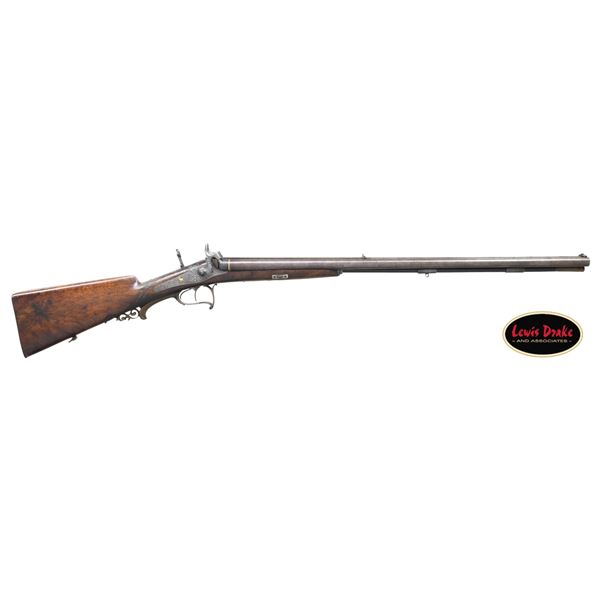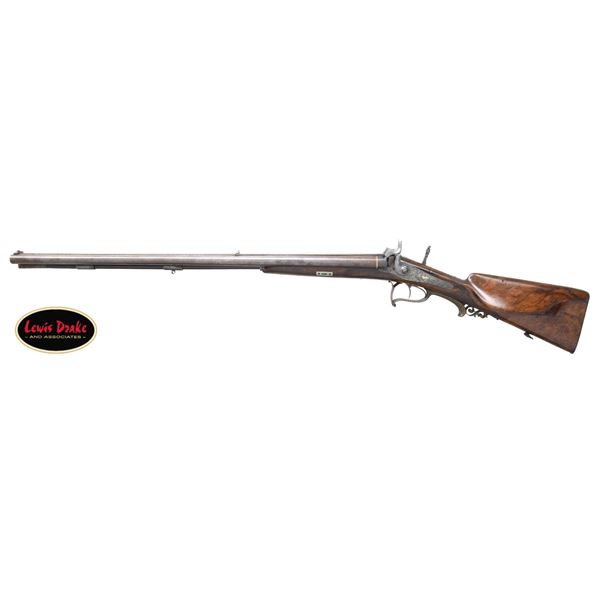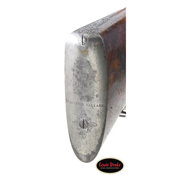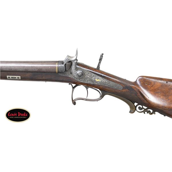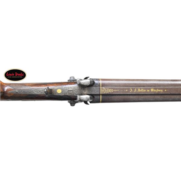 J.L. DOTTER, MADE FOR VALENTIN NEULAND OF WURZBERG. Cal. 54 (right barrel w/twist 8 groove rifling, left with straight rifling). S# NSN. Johann Leonhardt Dotter is known to have been working in Wurzburg, Bavaira around 1844. This finely made rifle is gold inlaid with his name and address on top rib of 27" Bernard damascus barrels. Gold bands and scrolls are also found at breech ends. Rib is fitted with one standing leaf rear and gold bead front sights dovetailed through. Breeches are not vented. Breech iron is very finely scroll engraved and fitted with folding aperture rear sight; adjustable for windage and elevation. Peninsula back spring locks with uniquely filed hammers are near fully engraved with more large shaded scroll matching that found on breech iron. This scroll is unusual in that the shaded infill of the whorls appears to be that of lettuce leaves, or perhaps lichen. This interesting scroll surrounds game scenes with gold inlaid subjects. A doe jumps over fence on left lock and a buck is standing in meadow on right. Trigger plate has long spear finial with matching open scroll engraving. Front trigger is set. Trigger guard with flat front and scroll to bow has carved horn grip extension. A gold inlaid dove is on bow. Buttplate is engraved "No. II" above the name "VALENTIN NEULAND" His obituary states he was born in Wurzburg 26 August 1795 and died 13 February 1873. He was a "privatier". (Man of independent means). More foliate scroll is on long top tang. Stock of well figured European walnut has right hand Bavarian cheekpiece and is checkered at grip. Stock attaches to barrels with captive side bolt through rectangular German silver escutcheons. An ebony ramrod with horn tip and steel tail with worm mounts through two plain pipes and scroll engraved thimble. UNATTACHED ACCESSORIES: photocopy of Valentin Neuland's obituary. CONDITION: good. Barrel retaining some original finish where protected; pattern difficult to see. Locks and other metal parts show light cleaning to overall silver gray. Engraving remains sharp and clear. Stock retains most of its original oil finish with many marks and has some added oil. Bores are very good to fine with strong rifling throughout. Right barrel showing scattered pitting. Locks are crisp. Trigger will not set (needs adjustment). PROVENANCE: from the renowned collection of quality sporting arms from Lewis Drake together with inventory of Lewis Drake Associates. (01-26113/MGM). ANTIQUE. $2,000-3,000.