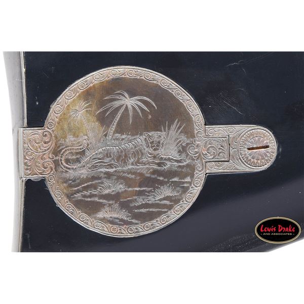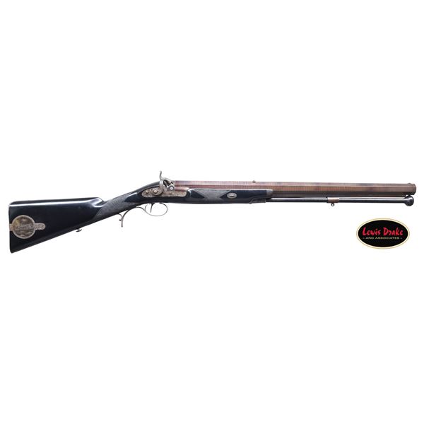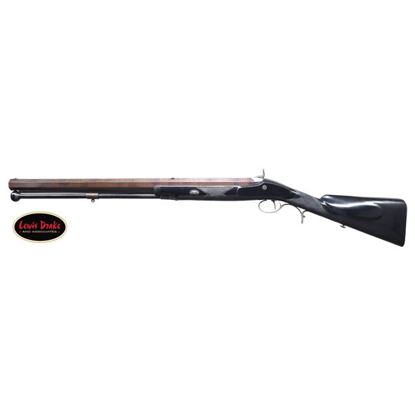 BARREL PERCUSSION RIFLE. Cal. 6 Bore (915 groove diameter. Multi-groove rifling). S# 2991. The Purdey records indicate that this rifle was built as an 8 bore with 33" barrel, sold on 13 July 1837. It presently has 26" octagon barrel of twist steel with under rib and measures as a 6 bore. Top flat is newly re-engraved with maker's name and address. Bottom of barrel is stamped with London black powder proof, "J.P." & S#. Rifle is sighted with single standing leaf "u" notch rear and front white bead. Scroll engraved breech iron has tigers face on top. Front spring lock with back sliding safety is fitted with flat face serpentine hammer. Lock is engraved "Purdey" and with some scroll. Trigger plate with set trigger has shell motif pineapple finial. Trigger guard with tiger on bow has spur forming pistol grip. S# is behind grip. Iron butt plate with long top tang is scroll engraved. Patchbox on left side of butt is engraved with tiger laying under palm trees on spring loaded cover. Newly made stock is of ebonized walnut and features shadow line right hand cheekpiece and checkering at grip and forend. A large ebony ramrod with brass tail (worm under cap) mounts through single plain pipe and iron thimble. CONDITION: good as restored. Barrel retaining nearly all of a good re-brown with fine pattern definition. Other metal parts show light pitting, cleaning to gray brown and some re-engraving especially lock which also shows considerable work. Bore is good with strong rifling, lightly pitted throughout. Lock is operable as is set trigger. PROVENANCE: from the renowned collection of quality sporting arms from Lewis Drake together with inventory of Lewis Drake Associates. (01-26131/MGM). ANTIQUE. $1,800-4,000.