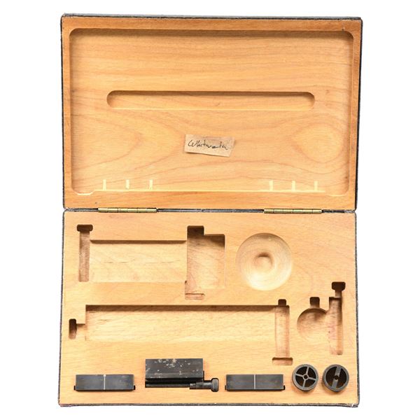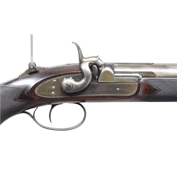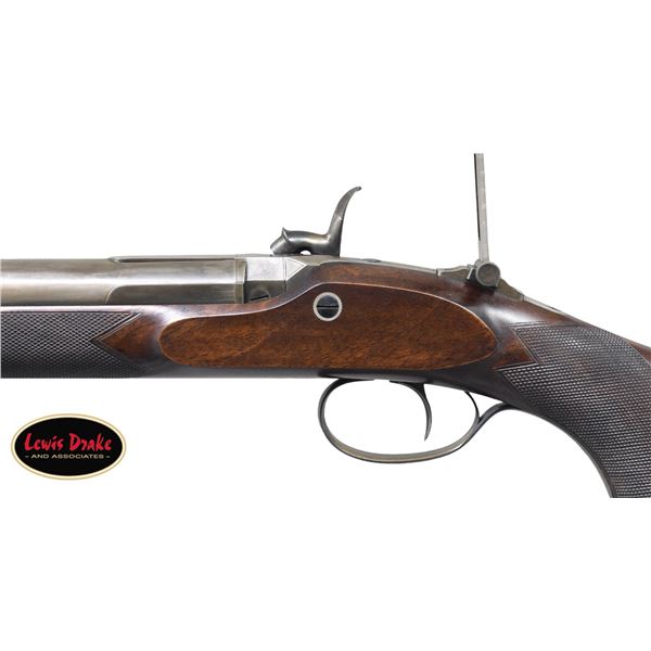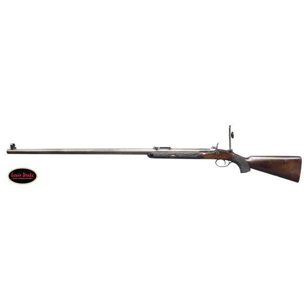 TARGET RIFLE. Cal. 45. S# DA115453. Bbl. 35" round w/ Rigby flats measuring 7/8" across the muzzle. Globe front sight & graduated leaf rear sight w/ long range Vernier tang sight. Top of rib is marked "Davide Pedersoli-Gibbs". Plain lock has straight line border engraving. Plain trigger. Ebony tipped key fastened capped pistol grip stock w/ point-pattern hand checkering & case colored long tang steel shotgun buttplate. Toeline of stock has German silver nameplate. UNATTACHED ACCESSORIES: wooden sightbox containing spare inserts & parts. CONDITION: metal has gray coloration from cold blue finish. Sound lock. Bright near excellent bore. PROVENANCE: from the renowned collection of quality sporting arms from Lewis Drake together with inventory of Lewis Drake Associates. (01-26132/DS). ANTIQUE. $1,000-1,500.