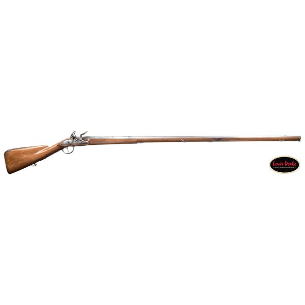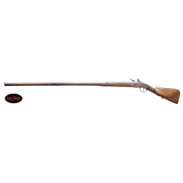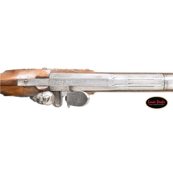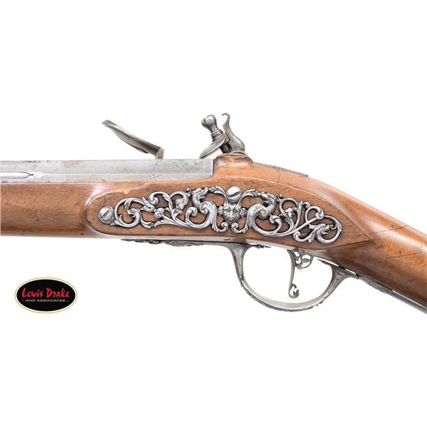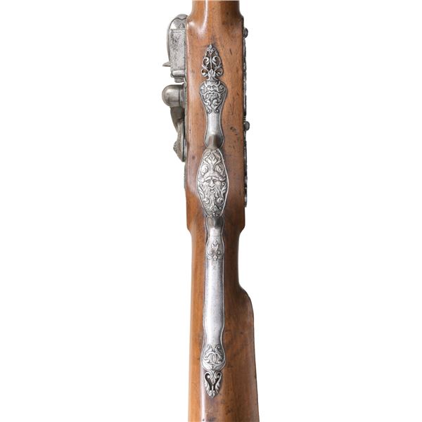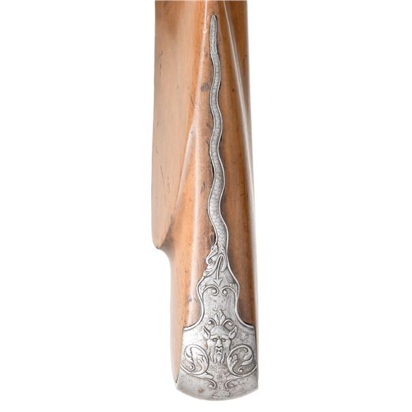 PAUL POULCE OF SEDAN, ARDENNES, FRANCE. Cal. 16 Bore. S# NSN. Paul Poulce is a member of a gun making family working in North Central France from the 1680's to about 1720. This beautifully decorated flintlock fowler has 47-1/2" barrel with concave octagon breech section with flute carved transition to sixteen sided; then to round through two wedding bands, front with relief carving of leaves and a face. Octagonal section shows some light engraving of warrior and cherubs. Lock with rounded and slightly arched plate is fitted with inset round pan, non bridled friction frizzen and feather spring with bulbous finial. Round bodied serpentine cock mounts with bolt having head in the form of a grotesque face. Lockplate is deep relief chased with open flowing scrolls in front of and on the cock. A large Green Man face with two serpent tendrils of hair is on tail. Front of lock on chamfer around feather spring is engraved "PAVL POVLxx A SEDAN". Lock internals show file decoration plain. Fruitwood stock extends to muzzle and features large dished right hand cheekpiece and is pinned to barrel. Beautifully full relief engraved iron mounts include large buttplate with devil's face surrounded by scrolls at heel and long tang in the form of a serpent with arrow shaped tongue. Trigger plate and trigger have multi-pierced decoration of flowers and scrolls. Terminal curl of trigger is in the form of a sea monster. Trigger guard has Green Men on bow and front finial. Multi-pierced sideplate has central Green Man flanked by scrolling dogs heads, grotesque faces and sea monsters. A hickory ramrod with horn tip is held by two multi-beaded pipes with matching thimble with finial depicting a Green Man and full bodied imp. The quality of all this work borders on incredible considering the amount of work required and the tools available at the time. CONDITION: good. All metal cleaned to pewter gray over some very light scattered pitting. Stock with old refinish has wood somewhat under metal especially on comb and shows repairs at wrist with lateral cracks and later inlet patch at top of grip. Bore is dark and rusted. Lock is good; fully operable. PROVENANCE: from the renowned collection of quality sporting arms from Lewis Drake together with inventory of Lewis Drake Associates. (01-26103/MGM). ANTIQUE. $4,000-7,000.