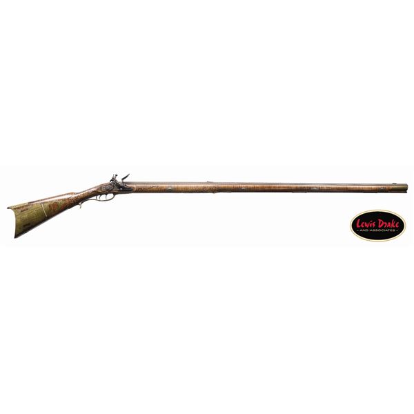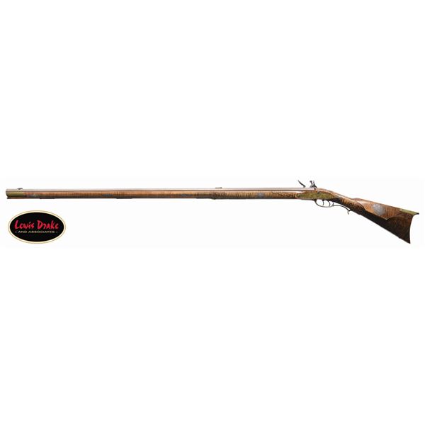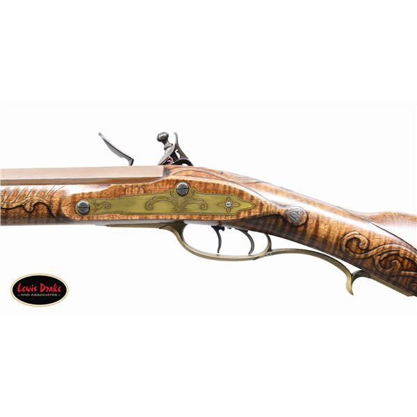 FLINTLOCK RIFLE. Cal. 54. NSN. Bbl. 42" octagon measuring 7/8" across flats at muzzle. German silver blade rocky mountain front sight w/ fixed rear sight having a fine V notch. Top flat has an inlayed brass plate engraved "Alexander". Lockplate is engraved "SA". Stephen Alexander of Tucson, Arizona was a prolific & highly skilled gunsmith who built & restored high-end muzzle loading rifles. Steven passed on July 31st, 2023 at age 70. Double set triggers. Full length curly maple stock held by four brass keys. Brass fittings include a pierced segmented rectangular lid patch box, crescent buttplate, finger curl trigger guard, sideplate & nose cap. Fittings have floral & geometric hand engraving. Cheekpiece has a German silver oval plate engraved w/ an American eagle under thirteen stars. Other German silver fittings include wedge escutcheons w/ the rear escutcheon being 8-pointed stars. Tear drop points behind lock & sideplate have engraved German silver hearts. Areas around cheekpiece, wrist, top tang, lockplate, sideplate & thimble have ornate foliate relief carving. Ramrod channel is highlighted by incise carving. Hardwood ramrod is held by an engraved faceted brass thimble & 2 faceted brass pipes. WEIGHT: 8 lbs, 5 oz. CONDITION: metal has a pleasing light browned finish. Stock has very good finish. Sound lock & trigger. Bright near excellent bore. PROVENANCE: from the renowned collection of quality sporting arms from Lewis Drake together with inventory of Lewis Drake Associates. (01-26126/DS). ANTIQUE. $4,000-6,000.