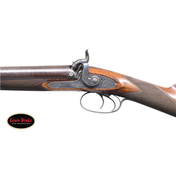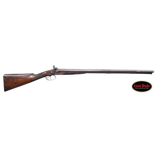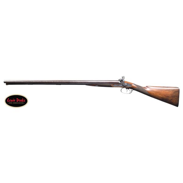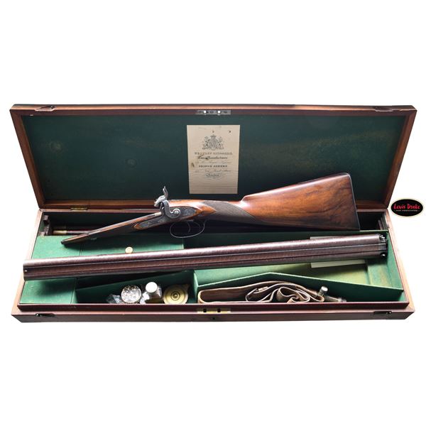 PERCUSSION SHOTGUN WITH ORIGINAL CASE AND ACCESSORIES. Cal. 10 Ga. S# 7139. The 30" skelp twist barrels are engraved "Westley Richards. 170. New Bond St. London." on broad game rib. Bottoms of barrels are stamped with Birmingham black powder proofs, S#'s and barrel maker's initials "GT". Breech plugs with vented platinum blowouts have platinum bands at rear and scroll engraving on rib extension. Front spring island type locks are fitted with tall flat faced serpentine hammers with stylized dolphin heads. Locks and breech iron are engraved with sprays of large open scroll that is very nicely cut. Trigger plate has pineapple finial. Trigger guard is engraved with scroll on bow and with S# on tang. Stock of well marbled and lightly figured European walnut measures 14-1/2" over steel buttplate with scroll engraved long top tang. Stock attaches to barrels with captive side bolt through oval silver escutcheons and is checkered at grip and forend. Stock also features silver flash guards under breech iron and a vacant silver oval on toeline. An ebony ramrod serial numbered to this gun on face of brass tip has brass tail with worm under cap. Ramrod mounts through two plain pipes and pineapple type thimble. MEASUREMENTS: BBLS: Bore Diameter: L .761. R .761. Restriction: L .000. R .000. STOCK: DAH: 1-3/4". DAC: 1-1/2". CAST: about 1/2" off. LOP: 14-1/2"WEIGHT: 7 lb. 13 oz. UNATTACHED ACCESSORIES: gun is housed in its original mahogany case with dual pivoting hook and keylock closure with brass corners and circular "D" ring handle. Interior is lined in green cloth and paper Westley Richards label is in lid. Frame of lid is marked with this guns S# in usual Westley Richards fashion. What appear to be original accessories include: two piece cleaning rod with short type handle, crystal oil bottle by Hawksley, circular brass capper by Sykes, a shot snake marked "Patent" and a tin of Eley percussion caps. There are two covered compartments with bone handles; one holds pig skin covered flask with German silver head by James Dixon, the other contains an 11 bore wad punch, main spring vice and combination "T" shaped nipple wrench and pricker with brass caps covering compartments for spare nipples (not present). CONDITION: exceptionally fine. Barrels retaining over 90% original brown with a scattering of marks and some minor loss of lustre from cleaning of flash rust. Left blowout shows scratches; right has been peaned; possibly replaced. Breech iron and locks retain nearly all their case hardening color; breech iron shows some pitting inside fence area which is cleaned to brown. Trigger guard has 85-90% original bright blue. Buttplate has most of its blue. There are only 4-5 marks in the original oil finish of stock. Checkering with minimal wear. Bores are bright and shiny. Locks are crisp. Case exterior shows some scratches and rubs and a repaired crack full length along hinge side of top. Interior cloth is very good to fine with bleaching in proximity to buttstock. There are also some rubs and marks from contact with barrels. Label is lightly foxed and has three small rubs through. Interior partitions are good; accessories are fine. PROVENANCE: from the renowned collection of quality sporting arms from Lewis Drake together with inventory of Lewis Drake Associates. (01-26446/MGM). ANTIQUE. $3,500-6,500.
