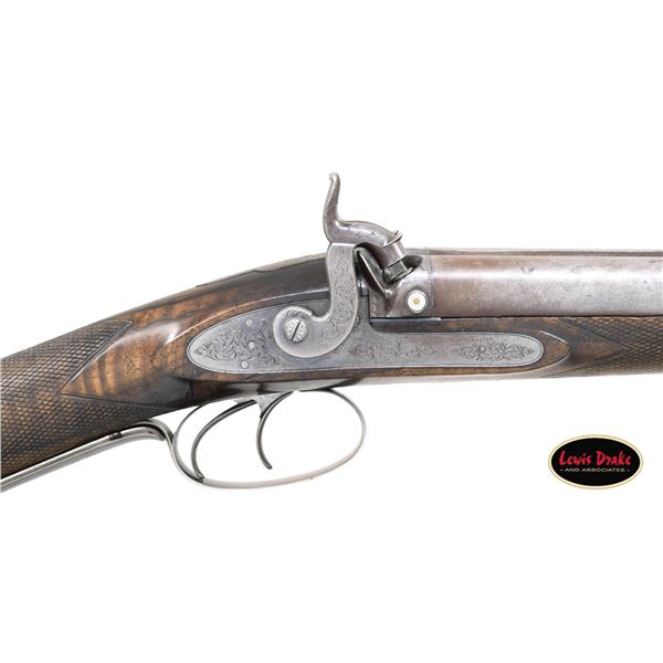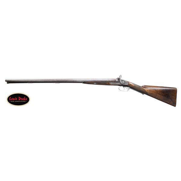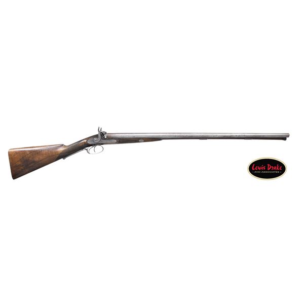 Cal. 16 Bore. S# 9703 (Circa 1858). The 30" laminated steel barrels are engraved "WESTLEY RICHARDS 170. NEW BOND St. LONDON" on broad game rib. Bottoms of barrels are stamped with Birmingham black powder proofs and S#. Breeches have platinum blowouts. Breech iron is nicely scroll engraved and stock has silver flash guards. Front spring island type locks with tall flat faced serpentine hammers are engraved with well cut open scroll. 'WESTLEY RICHARDS" is on each lockplate. Trigger plate has pineapple finial and steel trigger guard is fitted with grip safety device which locks triggers until squeezed. Straight grip stock of fiddle figured and lightly streaked European walnut measures 14-3/8" over steel buttplate with long scroll engraved top tang. Stock attaches to barrels with single side bolt through oval silver escutcheons and has point pattern checkering at grip and forend. A vacant silver oval is on toeline. Original walnut ramrod with horn tip and brass tail mounts through two plain pipes and pineapple type thimble. MEASUREMENTS: BBLS: Bore Diameter: L .669. R .669. Restriction: L .000. R .000. Wall thickness: L .037. R .033. STOCK: DAH: 2-1/4". DAC: 1-5/8". CAST: neutral. LOP: 14-3/8". WEIGHT: 6 lb. 4 oz. CONDITION: very good. Barrels retaining about 40% original brown. About 30% case hardening color remains on locks. There are traces of blue on trigger guard and buttplate tang. Stocks show considerable wear to their original surfaces with many scattered marks. Bores are exceptional; smooth, bright and shiny. Locks are crisp. Consignor states that this was Lynton MacKenzie's favorite shotgun. Lynton was possibly the most gifted engraver of our time and had a genuine love of muzzleloaders; especially flintlocks. He died in 1999 at the age of 59. PROVENANCE: from the renowned collection of quality sporting arms from Lewis Drake together with inventory of Lewis Drake Associates. (01-26125/MGM). ANTIQUE. $3,000-5,000.