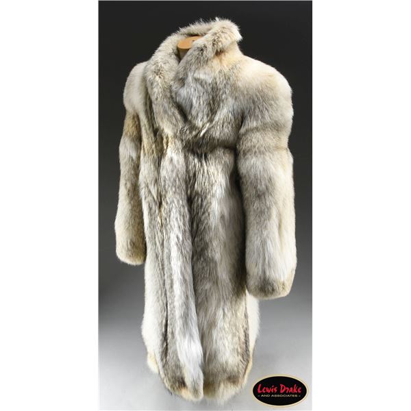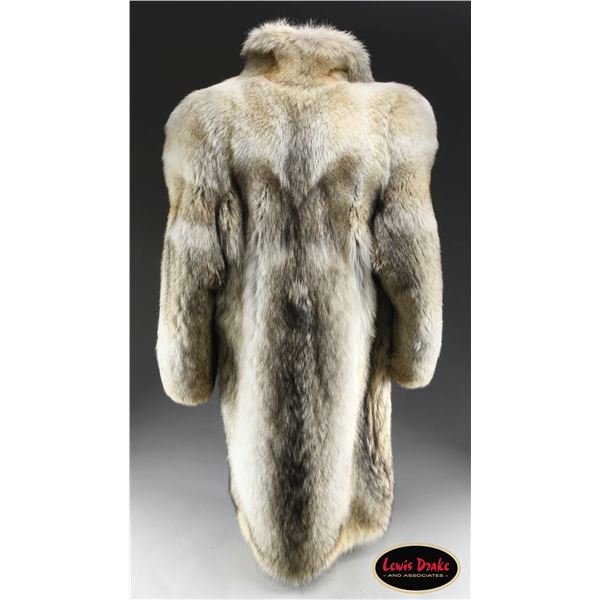 This coat is made of superior Canadian coyote pelts and shows truly exceptional workmanship. The individual pelts are beautifully color-matched and finely finished. The size of the 3/4 length coat is estimated to be a large and would likely fit a woman of average stature. The lining is a taupe satin with floral damask embellishments. Full-length sleeves are lined with the same material. There is an interior belt on the right side to secure the coat to the body. An intensely visually attractive coat suitable for wear in a variety of venues. CONDITION: the coat appears to never have been worn and remains in pristine condition. PROVENANCE: from the renowned collection of quality sporting arms from Lewis Drake together with inventory of Lewis Drake Associates. (02-23545/BF). $1,000-1,750.