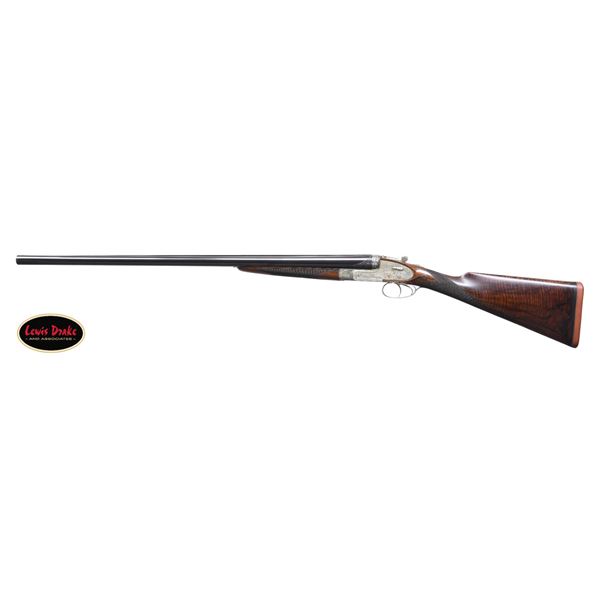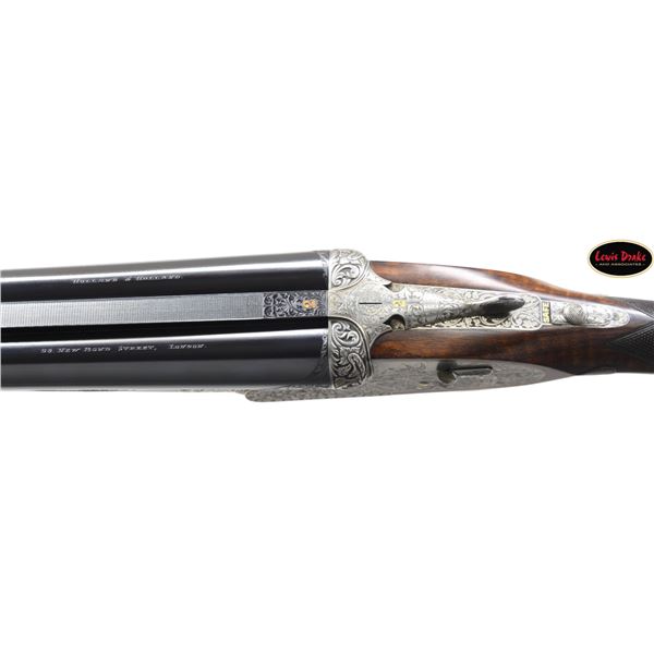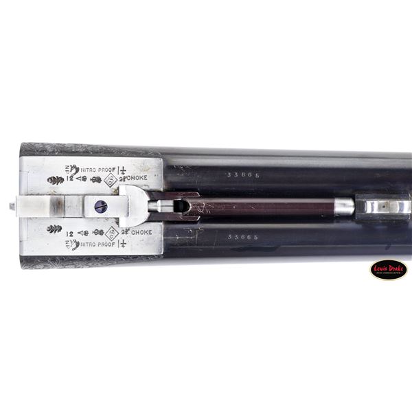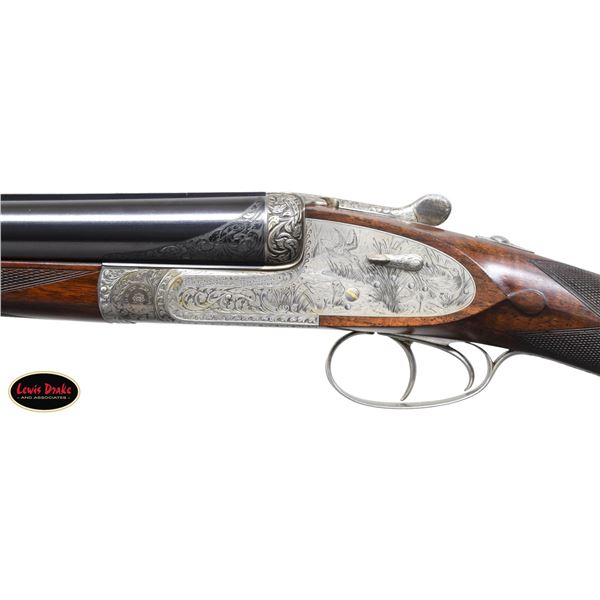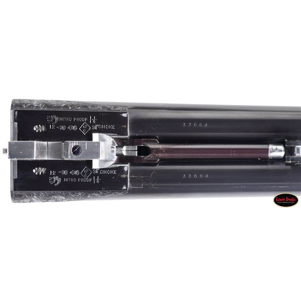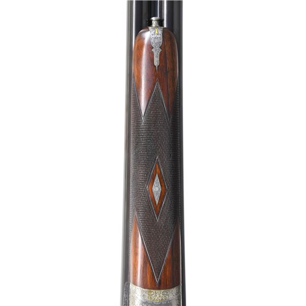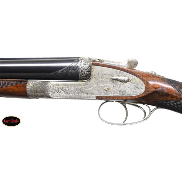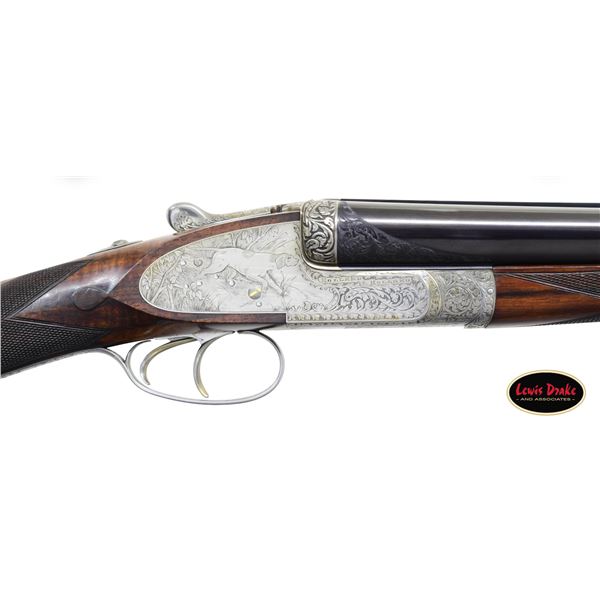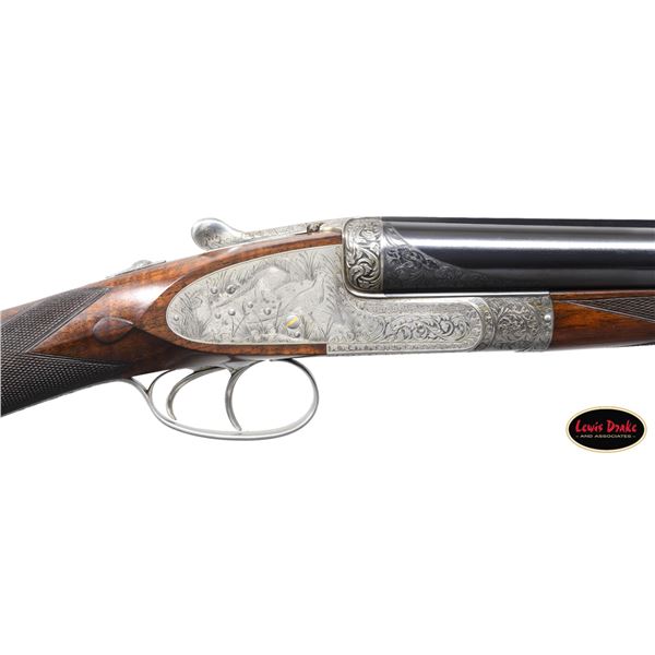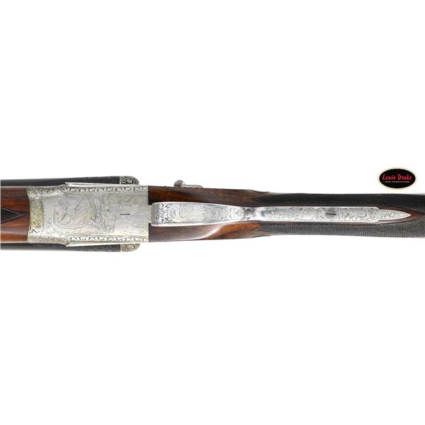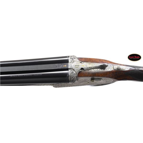 SIDELOCK EJECTOR DOUBLE TRIGGER HEAVY PROOF GAME GUNS MADE FOR R.A.F. WING COMMANDER WOJCIECH KOLACZKOWSKI WITH ORIGINAL CASE & ACCESSORIES. Cal. 12 Ga. 2-3/4" (BOTH). 1. S# 33664 & 2. S# 33665 (1948). Wojciech Kolaczkowski was born in 1908 in Moszenki, Poland to a wealthy noble family. He excelled at skiing, horse riding, shooting, etc., representing Poland at clay pigeon shooting. He joined the Polish Airforce in 1929 and became commander of the 303rd squadron of the Polish Airforce in England. He was also commander of the #2 Polish wing and then took command of the #1 Polish wing in 1943. He won the distinguish Flying Cross in June of 1943. In 1944 he became Deputy Attache to the Polish Embassy in London until the end of the war. After WWII he emigrated to America where he was sales manager for Jaguar and British Leyland in NYC. He had these guns made in 1948. They have 28" chopper lump barrels with raised matted ribs. Rear portions are gold inlaid with the numbers "1" & "2" which also appear on top levers and forend tips denoting a true pair. The exception being the theme of the engraving; dogs & birds on Gun #1; birds only on Gun #2. Maker's name and address are engraved on tops of barrels. 2-1/2" of well cut acanthus scroll tapers from breech ends downward to fronts of actions. Barrel flats are stamped with London nitro proofs for 1-1/4 oz. of shot & "2-3/4" chamber length. S#'s are on bottoms of barrels. Bottom ribs are engraved "Made in England" & "Modele De Luxe". Barrels are fitted with H&H patent self-opening assist springs. Coin finished hand detachable sidelock actions are stocked to the fences and feature automatic safetys ("SAFE" inlaid in gold), hidden third fasteners, bushed strikers, gold band tumbler end cocking indicators, gold plated cocking levers and double triggers (fronts articulated). Actions and lockplates are special order engraved with shaded scroll highlights surrounding game and dog scenes; most likely executed by the revered Harry Kell whose relatively large eyed birds and superb shaded scroll are essentially a signature. Gun #1 depicts a setter retrieving a grouse on bottom of action while possibly the same setter retrieves a pheasant on left lockplate. Right lockplate has a scene of a pointing pointer. Gun #2 shows a nye of three pheasant on bottom (two on ground with one taking wing). Left lockplate has a group of four snipe in grass along brook side. Right lockplate shows three feeding pheasant. Both guns are engraved "Holland & Holland" on each side along with "Made in England" on hinge pin covers and "Modele De Luxe" on top levers. Fences are beautifully relief carved with scrolling acanthus; another Kell feature. Trigger guards with single right hand beads are engraved with standing partridge on gun #2 and setter retrieving on gun #1. S#'s are on short tangs. Straight grip stocks are made of very well matched European walnut with spectacular fiddle back grain and very fine marbling. They measure 14-3/8" over tan pig skin covered pads and also feature classic point pattern checkering on diamond hands and well shaped drop points. The individual gold initials "WK" are inlet on toeline where they are surmounted by the crown of a baron. Matching splinter ejector forends have Anson releases. MEASUREMENTS: Gun #1. BBLS: Bore Diameter: L .729. R .729. Restriction: L .031 (full). R .033 (full). Wall thickness: L .030. R .032. STOCK: DAH: 2-1/8". DAC: 1-7/16". CAST: about 1/2" off. LOP: 14-3/8" WEIGHT: 7 lb. 9 oz. Gun #2. BBLS: Bore Diameter: L .730. R .729. Restriction: L .028 (IMod). R .032 (Full). Wall thickness: L .032. R .032. STOCK: DAH: 2-3/16". DAC: 1-7/16". CAST: about 1/2" off. LOP: 14-3/8". WEIGHT: 7 lb. 8 oz. UNATTACHED ACCESSORIES: guns are housed in their original oak and leather two gun case with leather trimmed canvas outer cover. Top of case has later inset leather rectangle gold embossed "J.S.T.". Outer cover has later stitched on leather label embossed "Made for RAF Wing Cmd." "W. Kolaczkowski in 1948" "currently owned by" "Dr. John Thalgott". Interior is lined in burgundy cloth. Top has gold embossed H&H black Morocco leather label flanked by gun cleaning instruction label at left and charge card for this pair of guns at right. Accessories include: one pair of older H&H marked snap caps along with a newer pair. An older H&H marked pewter oil bottle along with a newer one, a empty bone striker bottle, two piece cleaning rod. Also included are two uncheckered walnut buttplates interchangeable with recoil pads. A covered compartment holds another bone striker bottle holding four screws for attachment of wooden buttplates. Another compartment holds a bottle of "303 Cleaning and Rust Preventer". CONDITION: exceptionally fine. Very close to "as new". Barrels retaining about 98% original blue with some minor marks and light scratches. Actions remain bright with now evidence of cleaning. Stocks show evidence of very light use with some loss of finish on drop points and grips. There are some minor handling marks on left side of Gun #1 buttstock. Checkering on both guns has very light wear and is dark. Pads are relatively new as are wooden buttplate. Bores are superb, bright and shiny with no visible imperfections. Both guns are mechanically fine with tight actions and crisp well timed ejectors. Case leather is very fine with some creases and marks as protected by its outer cover which shows rubs and scuffs. Straps and handle are good although a bit tender. Interior cloth is very fine with some minor rubs and marks. Labels are very fine, very lightly foxed. Accessories are fine. A truly superb pair of guns. A similar pair if ordered today would cost well in excess of $300,000, but would not exude the history and hand craftsmanship exhibited by these fine guns. PROVENANCE: from the renowned collection of quality sporting arms from Lewis Drake together with inventory of Lewis Drake Associates. (24-6560 & 25-246/MGM). CURIO. $50,000-75,000.