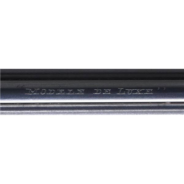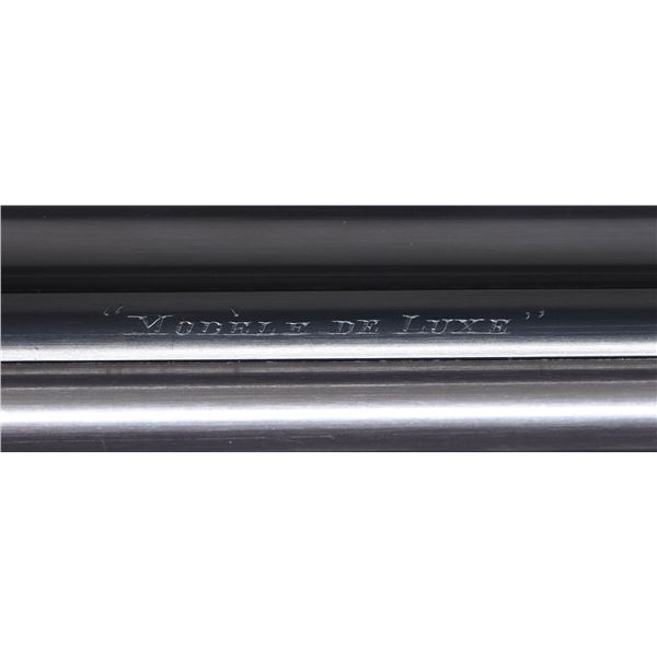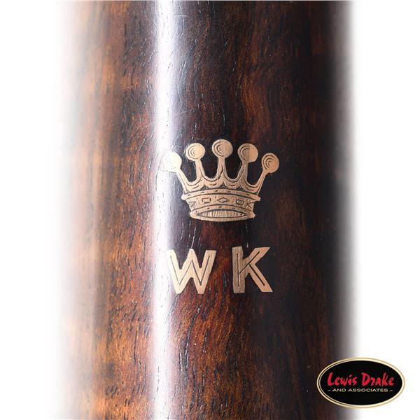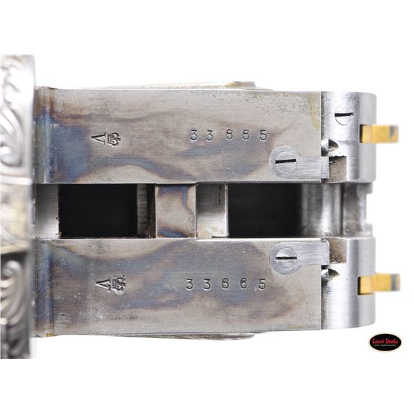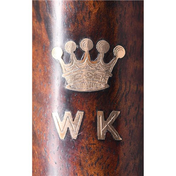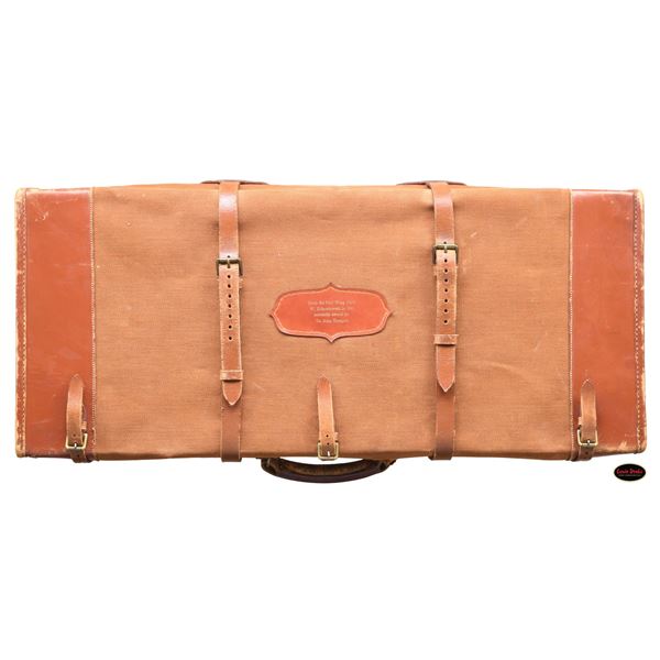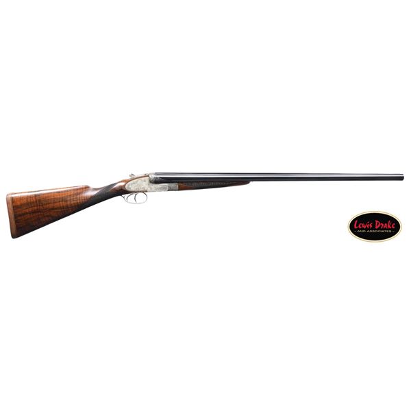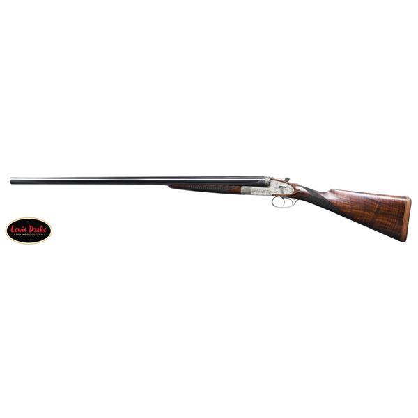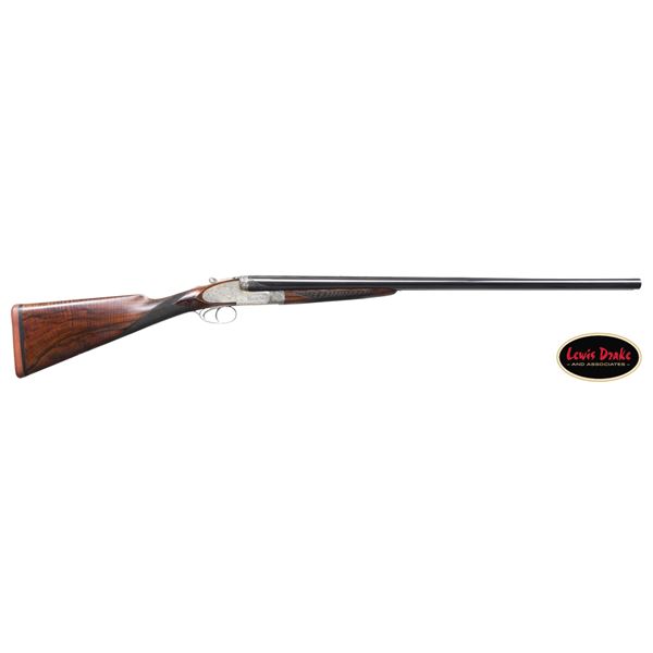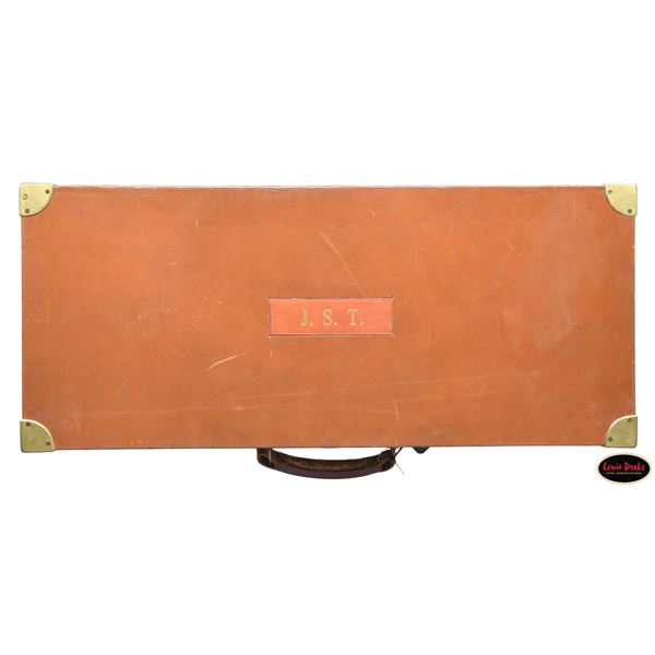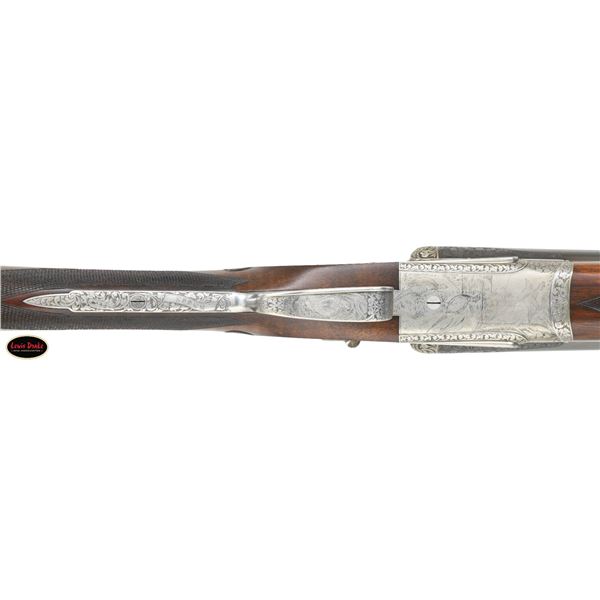 SIDELOCK EJECTOR DOUBLE TRIGGER HEAVY PROOF GAME GUNS MADE FOR R.A.F. WING COMMANDER WOJCIECH KOLACZKOWSKI WITH ORIGINAL CASE & ACCESSORIES. Cal. 12 Ga. 2-3/4" (BOTH). 1. S# 33664 & 2. S# 33665 (1948). Wojciech Kolaczkowski was born in 1908 in Moszenki, Poland to a wealthy noble family. He excelled at skiing, horse riding, shooting, etc., representing Poland at clay pigeon shooting. He joined the Polish Airforce in 1929 and became commander of the 303rd squadron of the Polish Airforce in England. He was also commander of the #2 Polish wing and then took command of the #1 Polish wing in 1943. He won the distinguish Flying Cross in June of 1943. In 1944 he became Deputy Attache to the Polish Embassy in London until the end of the war. After WWII he emigrated to America where he was sales manager for Jaguar and British Leyland in NYC. He had these guns made in 1948. They have 28" chopper lump barrels with raised matted ribs. Rear portions are gold inlaid with the numbers "1" & "2" which also appear on top levers and forend tips denoting a true pair. The exception being the theme of the engraving; dogs & birds on Gun #1; birds only on Gun #2. Maker's name and address are engraved on tops of barrels. 2-1/2" of well cut acanthus scroll tapers from breech ends downward to fronts of actions. Barrel flats are stamped with London nitro proofs for 1-1/4 oz. of shot & "2-3/4" chamber length. S#'s are on bottoms of barrels. Bottom ribs are engraved "Made in England" & "Modele De Luxe". Barrels are fitted with H&H patent self-opening assist springs. Coin finished hand detachable sidelock actions are stocked to the fences and feature automatic safetys ("SAFE" inlaid in gold), hidden third fasteners, bushed strikers, gold band tumbler end cocking indicators, gold plated cocking levers and double triggers (fronts articulated). Actions and lockplates are special order engraved with shaded scroll highlights surrounding game and dog scenes; most likely executed by the revered Harry Kell whose relatively large eyed birds and superb shaded scroll are essentially a signature. Gun #1 depicts a setter retrieving a grouse on bottom of action while possibly the same setter retrieves a pheasant on left lockplate. Right lockplate has a scene of a pointing pointer. Gun #2 shows a nye of three pheasant on bottom (two on ground with one taking wing). Left lockplate has a group of four snipe in grass along brook side. Right lockplate shows three feeding pheasant. Both guns are engraved "Holland & Holland" on each side along with "Made in England" on hinge pin covers and "Modele De Luxe" on top levers. Fences are beautifully relief carved with scrolling acanthus; another Kell feature. Trigger guards with single right hand beads are engraved with standing partridge on gun #2 and setter retrieving on gun #1. S#'s are on short tangs. Straight grip stocks are made of very well matched European walnut with spectacular fiddle back grain and very fine marbling. They measure 14-3/8" over tan pig skin covered pads and also feature classic point pattern checkering on diamond hands and well shaped drop points. The individual gold initials "WK" are inlet on toeline where they are surmounted by the crown of a baron. Matching splinter ejector forends have Anson releases. MEASUREMENTS: Gun #1. BBLS: Bore Diameter: L .729. R .729. Restriction: L .031 (full). R .033 (full). Wall thickness: L .030. R .032. STOCK: DAH: 2-1/8". DAC: 1-7/16". CAST: about 1/2" off. LOP: 14-3/8" WEIGHT: 7 lb. 9 oz. Gun #2. BBLS: Bore Diameter: L .730. R .729. Restriction: L .028 (IMod). R .032 (Full). Wall thickness: L .032. R .032. STOCK: DAH: 2-3/16". DAC: 1-7/16". CAST: about 1/2" off. LOP: 14-3/8". WEIGHT: 7 lb. 8 oz. UNATTACHED ACCESSORIES: guns are housed in their original oak and leather two gun case with leather trimmed canvas outer cover. Top of case has later inset leather rectangle gold embossed "J.S.T.". Outer cover has later stitched on leather label embossed "Made for RAF Wing Cmd." "W. Kolaczkowski in 1948" "currently owned by" "Dr. John Thalgott". Interior is lined in burgundy cloth. Top has gold embossed H&H black Morocco leather label flanked by gun cleaning instruction label at left and charge card for this pair of guns at right. Accessories include: one pair of older H&H marked snap caps along with a newer pair. An older H&H marked pewter oil bottle along with a newer one, a empty bone striker bottle, two piece cleaning rod. Also included are two uncheckered walnut buttplates interchangeable with recoil pads. A covered compartment holds another bone striker bottle holding four screws for attachment of wooden buttplates. Another compartment holds a bottle of "303 Cleaning and Rust Preventer". CONDITION: exceptionally fine. Very close to "as new". Barrels retaining about 98% original blue with some minor marks and light scratches. Actions remain bright with now evidence of cleaning. Stocks show evidence of very light use with some loss of finish on drop points and grips. There are some minor handling marks on left side of Gun #1 buttstock. Checkering on both guns has very light wear and is dark. Pads are relatively new as are wooden buttplate. Bores are superb, bright and shiny with no visible imperfections. Both guns are mechanically fine with tight actions and crisp well timed ejectors. Case leather is very fine with some creases and marks as protected by its outer cover which shows rubs and scuffs. Straps and handle are good although a bit tender. Interior cloth is very fine with some minor rubs and marks. Labels are very fine, very lightly foxed. Accessories are fine. A truly superb pair of guns. A similar pair if ordered today would cost well in excess of $300,000, but would not exude the history and hand craftsmanship exhibited by these fine guns. PROVENANCE: from the renowned collection of quality sporting arms from Lewis Drake together with inventory of Lewis Drake Associates. (24-6560 & 25-246/MGM). CURIO. $50,000-75,000.