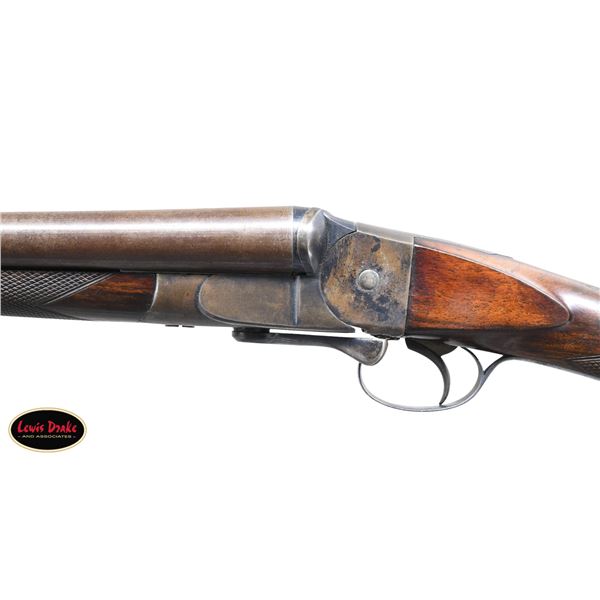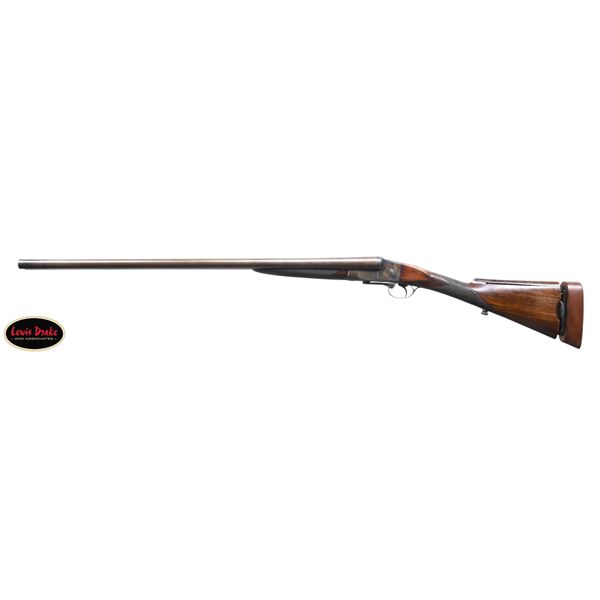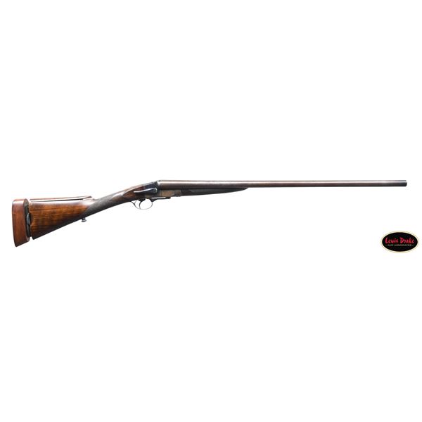 Cal. 12 Ga. barrels. S# NSN. Made up by an innovative gunmaker to fit his custom guns to his prospective client this useful tool is adjustable for drop at heel with locking lever on right side. Drop at comb has screw adjustment at rear of trigger guard tang. Length of pull is set using large wheel at rear of buttstock. Pitch is adjusted with two screws through butt piece. Cast is set across breech end of barrels with locking lever at bottom of action. Action parts and trigger guard are blued. Damascus barrels are browned and wood parts are oil finished. CONDITION: fine. Metal retaining about 40% original finishes. Wood with 80% original oil finish. Checkering considerably worn. A new butt piece has been added replacing original which probably was cracked, battered, or too short. PROVENANCE: from the renowned collection of quality sporting arms from Lewis Drake together with inventory of Lewis Drake Associates. (02-23611/MGM). $2,000-4,000.