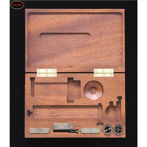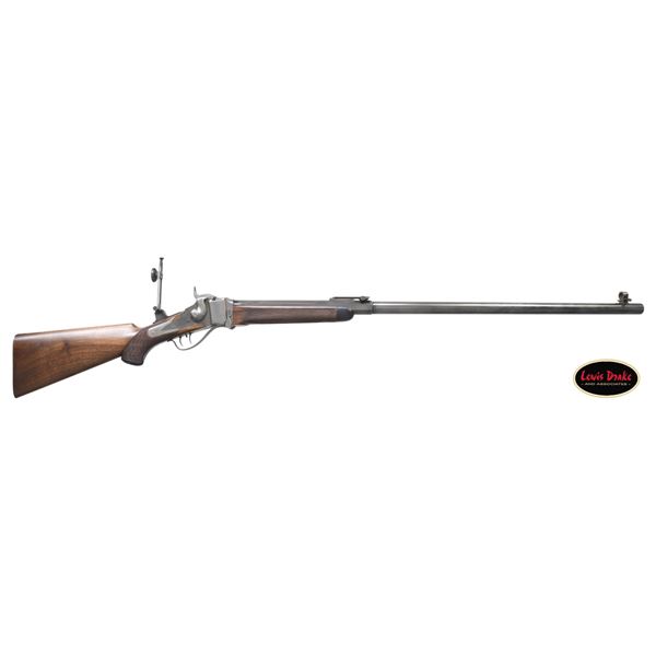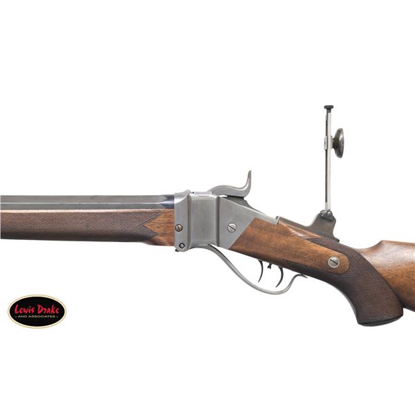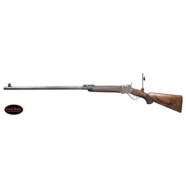 RIFLE. Cal. 45-70. S# SH27909 (under forend). Bbl. 34" octagon to round. Globe front sight, graduated leaf rear sight w/ long range Vernier tang sight. Double set triggers. Blue finished bbl. Action is finished in the white. Rosewood tip forearm & capped pistol grip walnut stock w/ point pattern hand checkering & steel shotgun buttplate. Mfg. in Italy. UNATTACHED ACCESSORIES: wood sight box containing additional front sight inserts & parts. CONDITION: bbl. has gray appearance indicating cold-blue finish. Action shows areas of light tarnish. Wood has very good finish & checkering. Sound trigger & mechanics. Bright near excellent bore. PROVENANCE: from the renowned collection of quality sporting arms from Lewis Drake together with inventory of Lewis Drake Associates. (24-6575/DS). MODERN. $1,750-2,500.