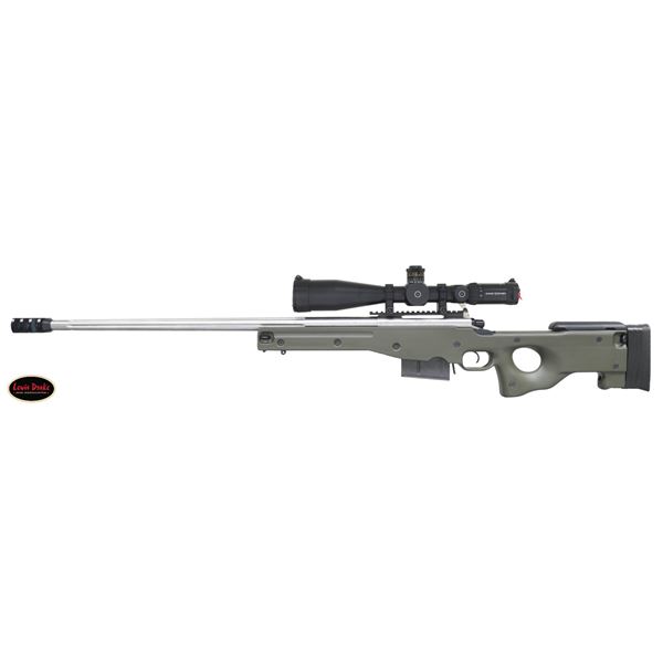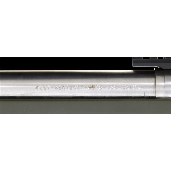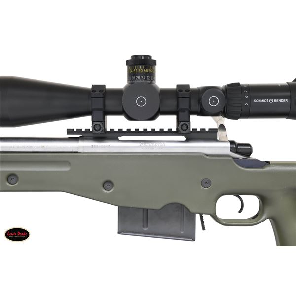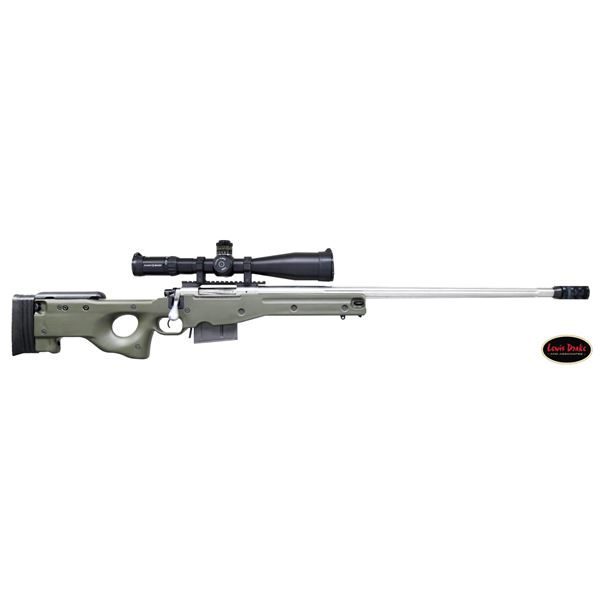 RIFLE. Cal. 338 Lapua Mag. S# S6548027. Bbl. 28" fluted stainless with blued triple baffle muzzle brake giving 30 1/4" overall; 1.22" at rear and .88" at muzzle. Consignor states built by Gerald Boyd (2046-2014) who worked for, and was close friend of, Kenny Jarrett who is famous for his long range "bean field" rifles. Consignor further states that Boyd used a Shilen barrel that is marked "WEST KENTUCKY GUNS" along with its caliber; all Boyd barrels similarly marked. Bolt handle with ground scope clearance and added pear shaped aluminum knob giving longer overall length for positive operation with greater leverage. Stock is unmarked but appears to be a green (black trim) Accuracy International Chassis of L96 style as used by English and German snipers. Forend tip allows use of a pivoting bipod. Multiple ports for push button release sling swivels plus rail in forend. Thumbhole stock has adjustable buttplate and comb. Action appears to have factory adjustable trigger set for 4 pounds (gauge measured). Unmarked Picatinny one piece scope base with unmarked heavy duty 34mm scope rings; all matte finished. Superb Schmidt Bender 5-25X56 matte finished scope with P4FL first focal plane reticle that has variable illumination. Side parallax, fine 1/4 MOA adjustments and Euro fast focus eyepiece. Scope introduced in 2022; MSRP of $4,120. MAGS: 1 unbranded 10 rd. appears by Accuracy International. UNATTACHED ACCESSORIES: Heavily constructed Hunting Classics lockable airline style aluminum transport case in good condition with outlined foam liner and Harris SLM Bipod. CONDITION: all aspects near excellent to include bore and optics. PROVENANCE: from the renowned collection of quality sporting arms from Lewis Drake together with inventory of Lewis Drake Associates. (24-6631/NW). MODERN. $4,000-5,500.