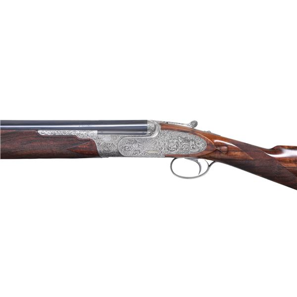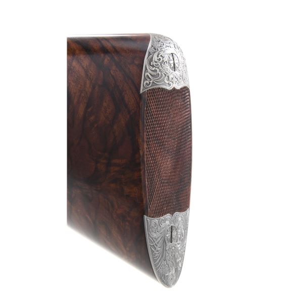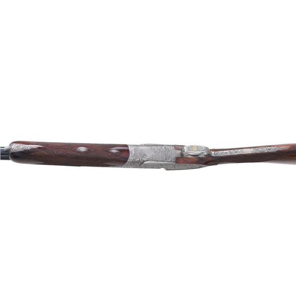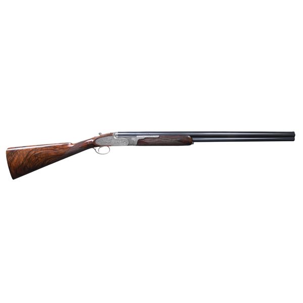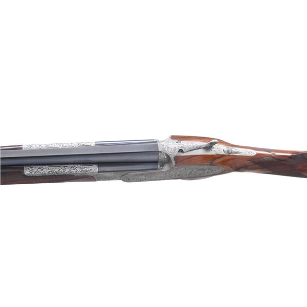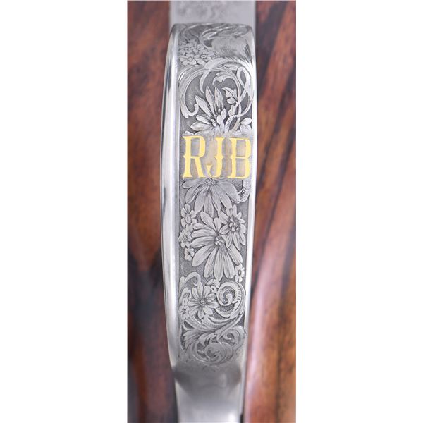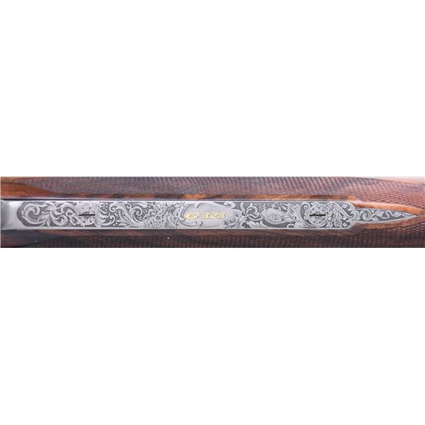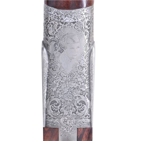 WITH TRULY SUPERB BULINO ENGRAVING BY V. PELI OF CREATIVE ART. Cal. 20 Ga. 2-3/4". S# G323. A. Galazan and his CSMC company continue to amaze the world by creating some of the most beautiful guns ever, mostly highlighted by his line of bespoke over and under guns. This wonderful example has 28" demi-block barrels fitted with solid matted rib. Top barrel is marked "A. GALAZAN." on left side of rib and "CONNECTICUT MFG. CO." "N.B. CT U.S.A." on right. Barrel flats are engraved with S# and caliber. Coin finished Boss style O/U action with non-automatic safety and non-selective single trigger is completely pinless. The only screw slots seen in all the metal work on this gun are the two that attach trigger guard tang to stock. This resulted in a blank canvas upon which master engraver Valerio Peli of Creative Art worked his magic. His exquisite composition consists of a full coverage sweeping array of foliage, flowers and scrolls which are given depth with fine shading. Flower blossoms include sunflowers, hibiscus and an array of other wildflowers along with a few roses that terminate in larger scrolls. The shaded niches of these scrolls are occupied by song birds perched in various poses. It appears that this fine work was commissioned for a women who had a love of these things and her portrait is found on bottom of action rendered in photographic Bulino style. A banner across bottom rear of action is engraved "CREATIVE ART" "V. PELI". "GALAZAN" is gold inlaid on left lockplate. Single beaded trigger guard is gold inlaid with the initials "RJB" surrounded by more flowers, foliage and a few birds. This coverage continues onto trigger guard tang which is also gold inlaid with S#. Straight grip buttstock is made from a piece of exhibition quality crotch figured and beautifully marbled European walnut which measures 14-1/2" over checkered wood butt with steel heel and toe plates engraved with flowers and scrolls matching action. Full one piece matching ejector forend with Anson release has shaped ejector housing iron inspired by Boss which is also engraved en suite. MEASUREMENTS: BBLS: Bore Diameter: O .619. U .619. Restriction: O .019 (mod). U .014 (IC). Wall thickness: O .032. U .031. STOCK: DAH: 2-1/8". DAC: 1-1/2". CAST: abut 1/2" off. LOP: 14-1/2". WEIGHT: 7 lb. 3 oz. CONDITION: exceptionally fine. Appears to be essentially "As New" with no firing halos seen on breech face. Metal surfaces retain virtually all of their original factory finishes. There are only a very few barely visible handling marks in wood finish. Bores are bright and shiny. Mechanically crisp. A few years ago these superb guns had a base price of over $50,000 without engraving. (25-1474/MGM). MODERN. $45,000-65,000.