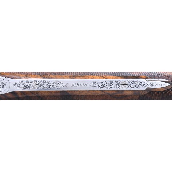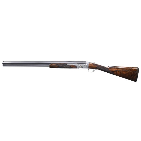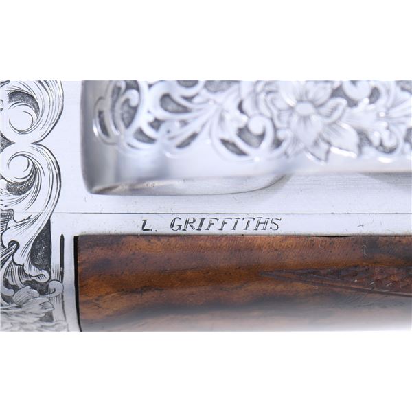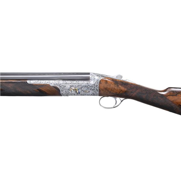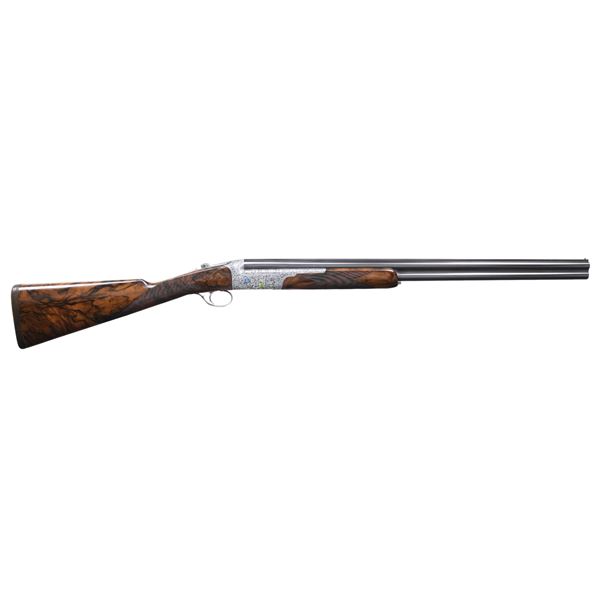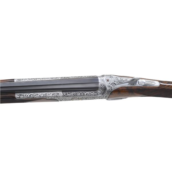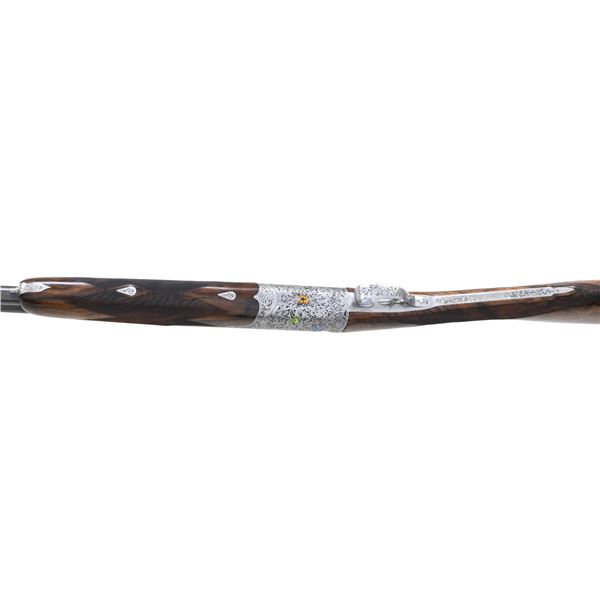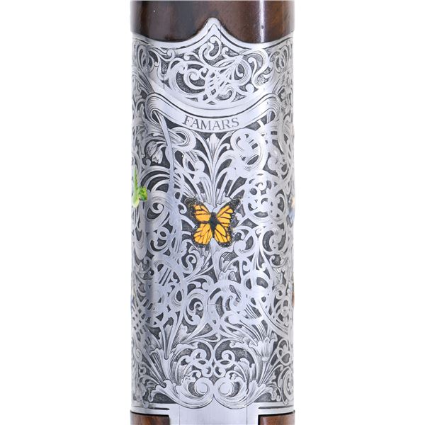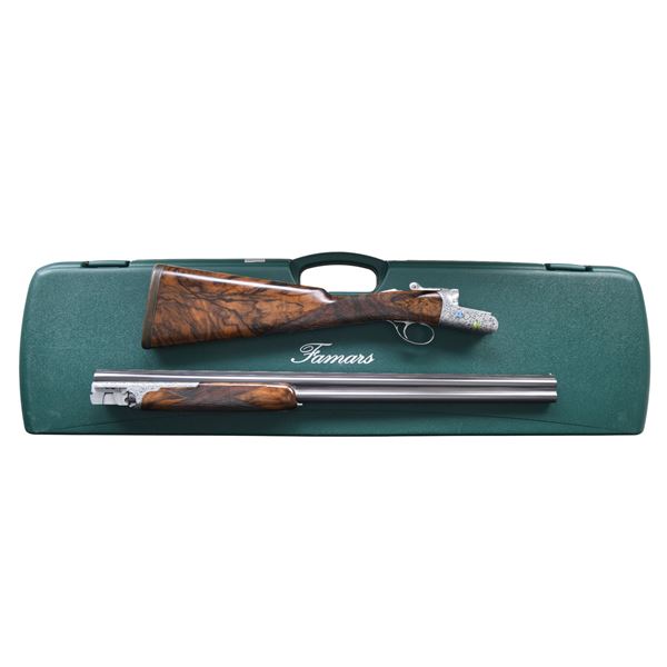 20 GA. A&S POSEIDON O/U SINGLE TRIGGER GAME GUN. Please note as of 4/29/25 this item description has been updated. Please revisit this description and contact us with any questions. Cal. 20 Ga. 2-3/4". S# K0028. This shotgun was awarded "Best Engraved Shotgun" at the January 2016 FEGA Convention in Las Vegas, NV. The strikingly attractive decoration on this fine little gun is reminiscent of the intriguing paintings by Martin Johnson Heade featuring hummingbirds and orchids. It has 26-1/8" demi-block barrels fitted with matted solid game rib. Bottom flats are stamped with 2011 Italian nitro proofs for 2-3/4" chambers. S# and maker's initials (A&S). Coin finished round bodied low profile O/U action with removable trigger group features non-automatic safety and single non-selective trigger. Action is engraved with near full coverage stylized scrolling vines with central orchid blossoms and with smaller blossoms flanking. This beautifully cut and shaded engraving is overlaid by multi-colored enamel work renderings of hummingbirds and insects. A large blue, green and red bird is on left side flanked by honeybees. Two hummingbirds are on right side; one is blue the other is green. A honeybee is entering orchid flower under blue hummingbird. A monarch butterfly is a center on bottom of action. Ladybugs are at center of top lever pivot and right side of thumb piece. Maker's name "FAMARS" is on bottom of action behind forend iron. Engraver's signature "L. GRIFFITHS" is on trigger plate. (Lee Griffiths of Hyde Park, Utah. Once a farmer; now a world class engraver.) His fine flowers and scroll continue onto trigger guard bow and long tang, which is engraved with S#. Very attractive darkly marbled and stump figured Circassian walnut straight grip buttstock measures 14-5/8" over brown leather covered pad. Well cut point pattern checkering is at grip. Matching slim forend with Boss style ejector bolsters has Anson type release. MEASUREMENTS: BBLS: Bore Diameter: O .622. U .622. Restriction: O .017 (mod). U .010 (IC). Wall thickness: O .035. U .035. STOCK: DAH: 1-3/4". DAC: 1-7/16". CAST: cast on about 1/4". LOP: 14-5/8". WEIGHT: 6 lb. 11 oz. UNATTACHED ACCESSORIES: gun is accompanied by a green ABS "Famars" marked case lined with green foam which contains: proof certificate, Famars inventory sheet, spare parts kit and bags for barrels and action. CONDITION: exceptionally fine; has possibly seen 50 shots with slight firing halos on breech face. Metal retaining essentially all original factory finish with a few minor marks. Stocks have some light scratches and rubs. Checkering remains light in color. Bores are bright and shiny. Mechanically crisp. Case is also very fine. (25-1491/MGM). MODERN. $30,000-50,000.