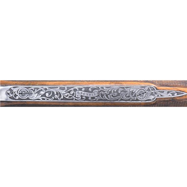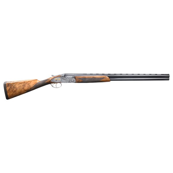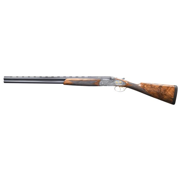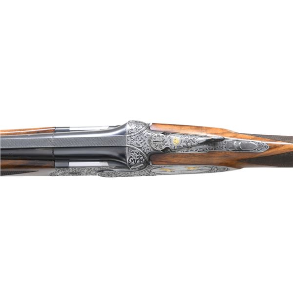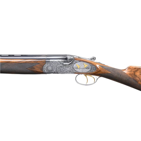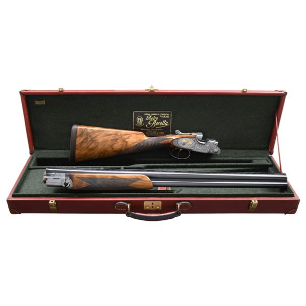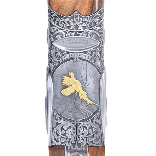 GAME GUN ENGRAVED BY D. CANDITO WITH CASE & ACCESSORIES. Cal. 12 Ga. 2-3/4". S#.C11831B. This unusual near top of the line Beretta features 28" mono-block screw choke barrels with wide matted ventilated rib. "P. Beretta-ITALY" is on left side of barrel. "Beretta USA CORP, ACKK, MD." is engraved on right. Bottom of mono-block is stamped with grade, S# and 1989 Italian nitro proofs. Coin finished sidelock low profile action with Beretta's proven locking system features gold plated double triggers, with non-automatic safety and double beaded trigger guard. Action and lockplates are engraved with full coverage, well laid out and executed semi-relief large open flowing acanthus scroll with attractively shaded backgrounds. This fine scroll surrounds oval vignettes of bird scenes with major subjects relief inlaid in gold. Backgrounds have fine Bulino detail. A cock pheasant rises from meadow with tree in background on bottom. A pair of pintails rise from a marsh on right sidelock and a pair of mallards are settling in to some cattails on left lockplate. Pierced top lever is gold inlaid with a sovereign's crown. Engraver's signature "D. Candito" (well known Beretta engraver) is on trigger plate. Trigger guard is engraved with matching scroll and has grade engraved in scroll on tang. Straight grip buttstock made of attractively marbled and stump figured European walnut measures 14-1/2" over brown leather covered pad. Point pattern checkering is at grip. Matching one piece slim forend has Deeley type release. MEASUREMENTS: BBLS: Bore Diameter: O .724(screw choke). U .724(screw choke). Wall thickness: O .035. U .037. STOCK: DAH: 2-1/16". DAC: 1-3/8+"+. CAST: about 1/2" off. LOP: 14-1/2". WEIGHT: 7 lb. 4 oz. UNATTACHED ACCESSORIES: gun is housed in its original dark brown leather case with leather corners by Nizzoli. Interior is lined in olive green felt and has brown Beretta label stitched in lid. Bottom compartment is semi-French fitted and contains three piece walnut and brass cleaning rod, 3 walnut handled turn screws (2 in original packaging), a key, 8 Briley thin wall choke tubes (2 in gun for a total of 10). CONDITION: exceptionally fine with evidence of very little firing however, cartridge halos on breech face are distinct. Barrels retaining about 95% blue with sharp edge wear and some fading. Coin finish of action remains clean and bright however, with some darkening evident on tangs. There is a fair scattering of light marks and scratches found on buttstock. Checkering shows very light wear. Bores are bright and shiny without noted problems. Action is tight; ejectors slightly out of time. Case is also very fine with a few minor marks in leather. Interior and accessories are also fine. These custom order guns retail well in excess of $75,000 today. (25-1530/MGM). MODERN. $17,500-27,500.