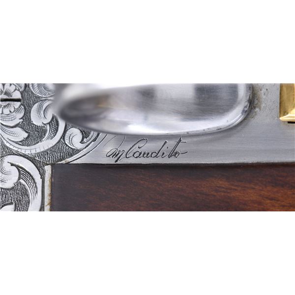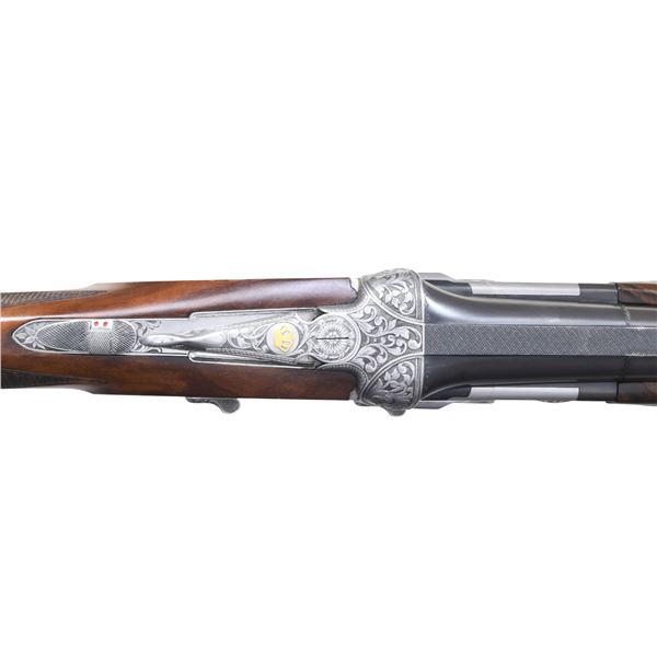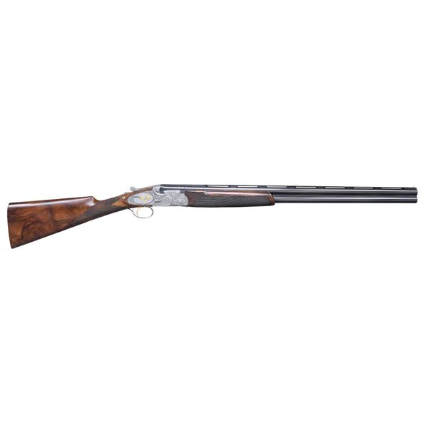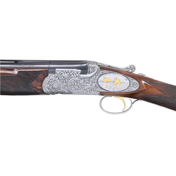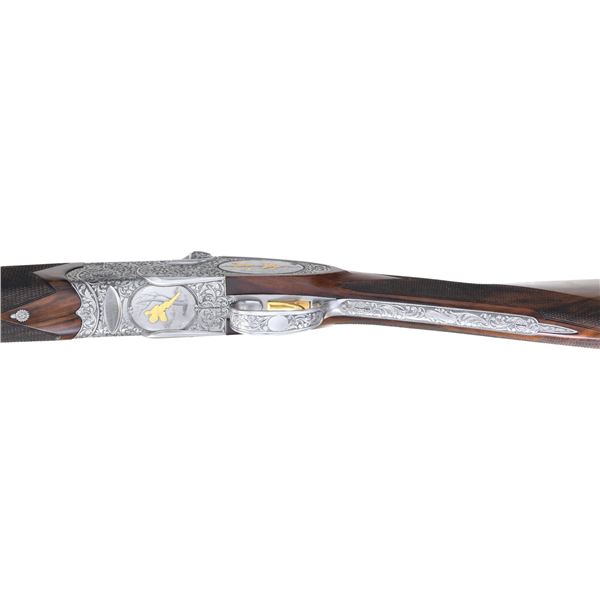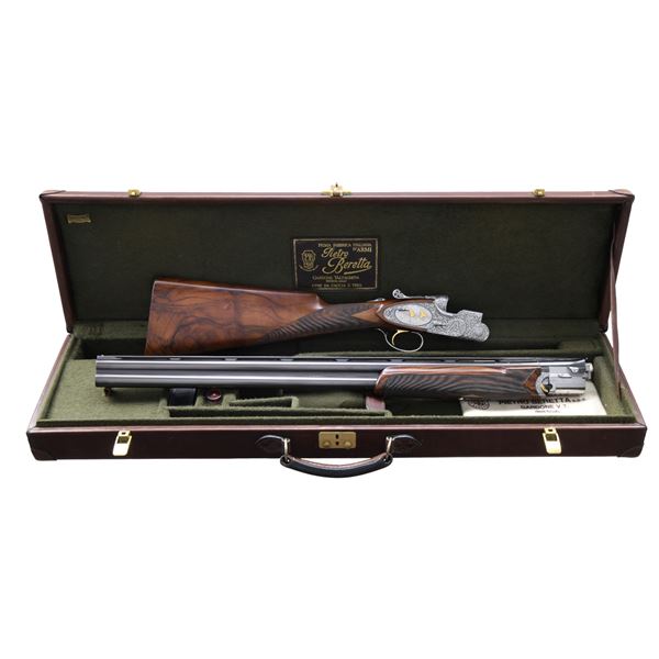 GAME GUN WITH CASE. Cal. 12 Ga. 2-3/4". S#. C13075B (1991). This attractive near top of the line Beretta features 28" mono-block fixed choke barrels with wide matted ventilated rib. "P. Beretta-ITALY" is on left side of barrel. Bottom of mono-block is stamped with grade, S# and 1991 Italian nitro proofs. Coin finished sidelock low profile action with Beretta's proven locking system features gold plated single selective trigger, with non-automatic safety, detachable sidelocks with levers on right side and double beaded trigger guard. Action and lockplates are engraved with full coverage, well laid out and executed, semi-relief large open flowing acanthus scroll with attractively shaded backgrounds. This fine scroll surrounds oval vignettes of bird scenes with major subjects relief inlaid in gold. Backgrounds have fine Bulino detail. A cock pheasant rises from meadow with tree in background on bottom. A pair of pintails rise from a marsh on left sidelock and a pair of mallards are settling in to some cattails on right lockplate. Pierced top lever is gold inlaid with a sovereign's crown. Engraver's signature "D. Candito" is on trigger plate. Trigger guard is engraved with matching scroll and has grade engraved in scroll on tang. Straight grip buttstock made of attractively marbled and lightly figured European walnut measures 14-3/4" over fully checkered wood butt. Point pattern checkering is at grip. Matching one piece full forend has Deeley type release. MEASUREMENTS: BBLS: Bore Diameter: O .723. U .727. Restriction: O .036 (full). U .004 (mod). Wall thickness: O .036. U .031. STOCK: DAH: 2-1/8". DAC: 1-5/16"+. CAST: about 1/4" off. LOP: 14-3/4". WEIGHT: 7 lb. 10 oz. UNATTACHED ACCESSORIES: gun is housed in its original dark brown leather case with leather corners by Nizzoli which has leather trimmed canvas outer cover. Interior is lined in olive green felt and has brown Beretta label stitched in lid. Bottom compartment is semi-French fitted and contains three piece walnut and brass cleaning rod, brushes etc in black wallet and two plastic snap caps marked "PB" and a Beretta bench cloth. CONDITION: exceptionally fine with scant evidence of ever being fired since proof. Retaining essentially all factory finishes on wood and metal with only a few very minor, scattered handling and assembly marks. Bores are bright and shiny; mechanically crisp. Case is also very fine however, there are marks and compressions on leather. Outer cover is fine as is interior and accessories. This fine gun presently retails at about $80,000. (25-942/MGM). MODERN. $14,000-20,000.