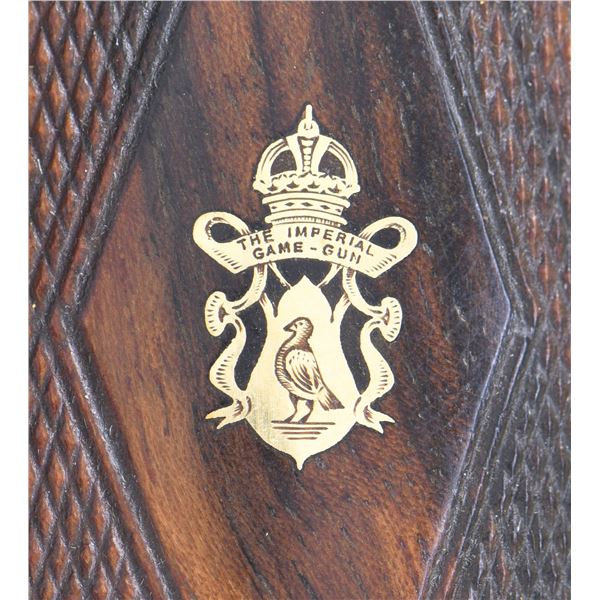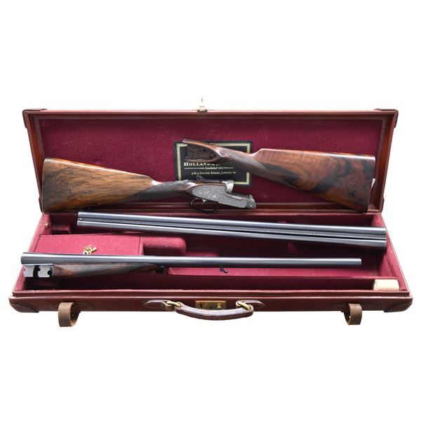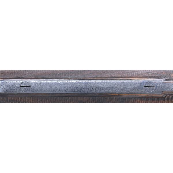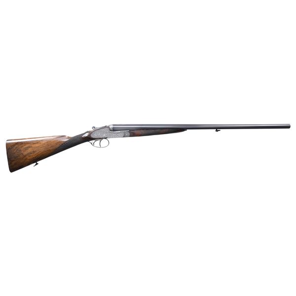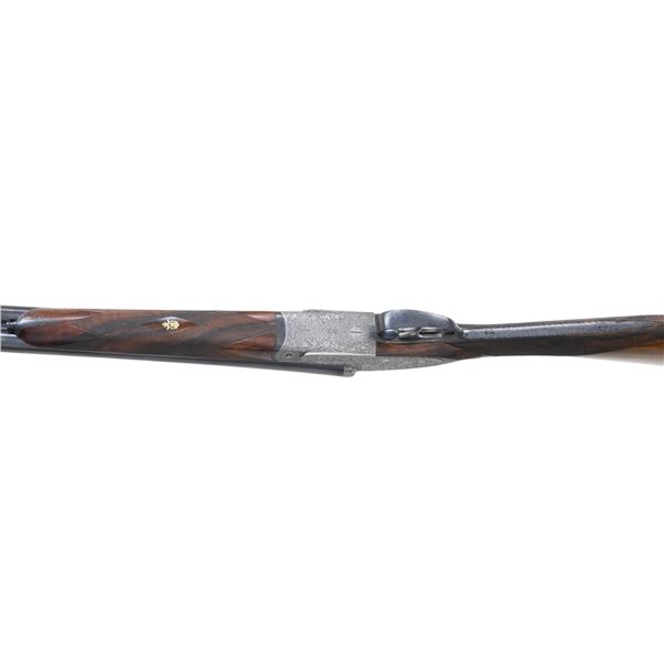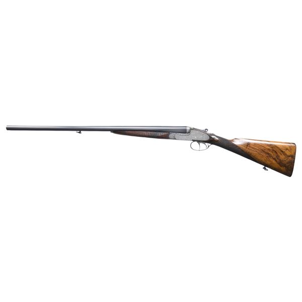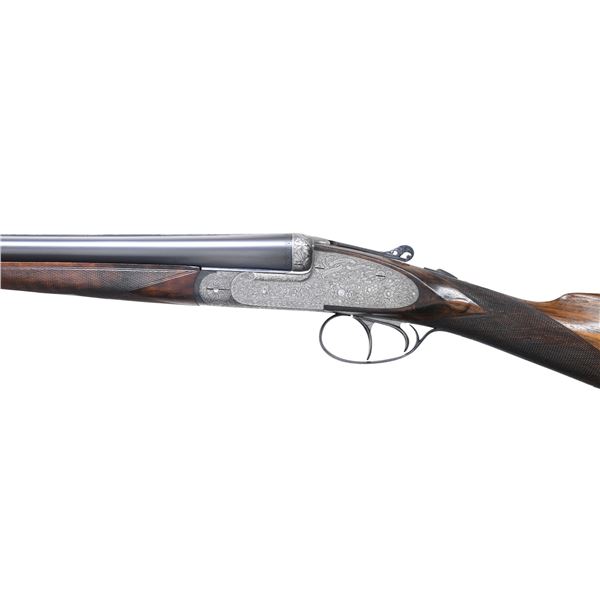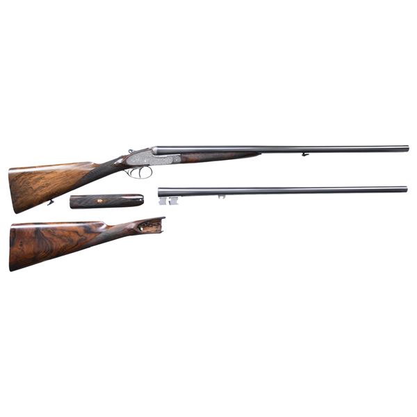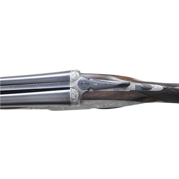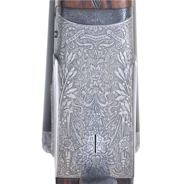 OPENING IMPERIAL GRADE SIDELOCK EJECTOR GAME GUN WITH NEWLY MADE STOCKS, EXTRA BARRELS AND CASE. Cal. 20 Ga. 2-3/4". S# 42276 (1930). Original chopper lump barrel set measures 25-5/8" and is fitted with narrow matted game rib. Tops of barrels are engraved "Aug. Lebeau-Courally FOURNISSAUR" "DES PRINCIPALES Cours de l' Europe". Barrel flats are stamped with 1930 Italian nitro proofs for 2-3/4" chambers and 1956 Spanish re-proofs. Bottoms of barrels are stamped with Wahlreyne steel and choke info. A sling loop is soldered to bottom rib. Second set of barrels also measure 25-5/8" and have no maker's marks. Barrel flats are stamped with 1976 Italian nitro proofs and are of chopper lump construction. These barrels fit action perfectly and are of high quality. Coin finished reinforced sidelock action features non-automatic safety, hidden third fastener, bushed strikers, Purdey type self-opening system and double triggers (front articulated). Action is engraved in classic Renaissance pattern with ribbons and flower bursts surrounded by a sea of small scroll. The scrolled ribbon on left lockplate is engraved with maker's name and address. Right ribbon is engraved "FAIT POUR S. CORTE A GENES". Relief engraved olive leaves with olives are on bottom of action and fences. Blued top lever has pierced and sculpted thumb piece and is gold inlaid "1". Engraver's signature "M. Hannay" (well known Liege engraver) is on trigger plate. Trigger guard with matching floral engraving has S# on tang. Gun is fitted with original straight grip buttstock of classically marbled and figured Circassian walnut. It measures 13-7/8" over checkered wood butt and features drop points, point pattern grip checkering, vacant gold oval and sling loop. (A newly factory made buttstock is included which has an approx. length of pull of 14-3/4".) Stock maker's name "MAURO SABATTI" is in trigger guard channel. Splinter ejector forend with Anson release has newly fashioned wood matching new buttstock. Original forend wood is included. Both are inlet with gold Lebeau Courally crest on uncheckered central diamonds. MEASUREMENTS: (Original) BBLS: Bore Diameter: L .623. R .634. Restriction: L .030 (full choke). R .030 (full choke). Wall thickness: L .026. R .025. STOCK: DAH: 2-1/16". DAC: 1-1/2". CAST: about 5/8" off. LOP: 13-7/8". WEIGHT: 5 lb. 10 oz. MEASUREMENTS: (Second set) BBLS: Bore Diameter: L .622. R .622. Restriction: L .025 (mod). R .014 (light mod). Wall thickness: L .029. R .029. STOCK: DAH: 2-1/16". DAC: 1-1/2". CAST: LOP: 13-7/8". WEIGHT: 5 lb. 12 oz. UNATTACHED ACCESSORIES: gun is housed in a brown leather VC case with stitched leather corners which is lined in burgundy cloth. A Holland & Holland label is in lid. Case is configured for action and two barrel sets that measure 28-1/2". No accessories are present, except the key. CONDITION: very fine as reconditioned. Both barrel sets retain most of their black; original set of course being re-blacked. Action and lockplates have been lightly re-polished restoring attractive coin finish and engraving remains sharp and clear. Original buttstock has wood surface slightly under metal and shows considerable wear on drop points. It has an oil refinish and checkering has been re-cut. Original forend which is not mounted on iron appears to be the same condition. Recent stocks show only a few minor marks in their original finish. Bores are bright and shiny without any visible imperfections except for one or two pits that did not polish out of original barrels. Action is tight (very tight with second set of barrels) ejectors are strong and in time. Case leather is very fine with some marks. Interior is fine. Straps and handle are good. (25-931/MGM). CURIO. $7,000-12,000.