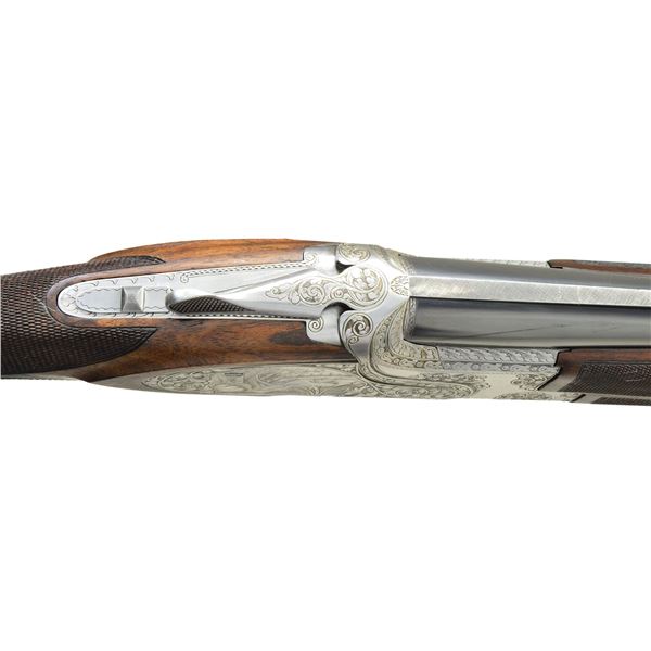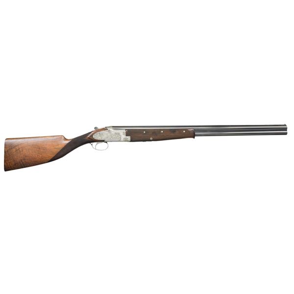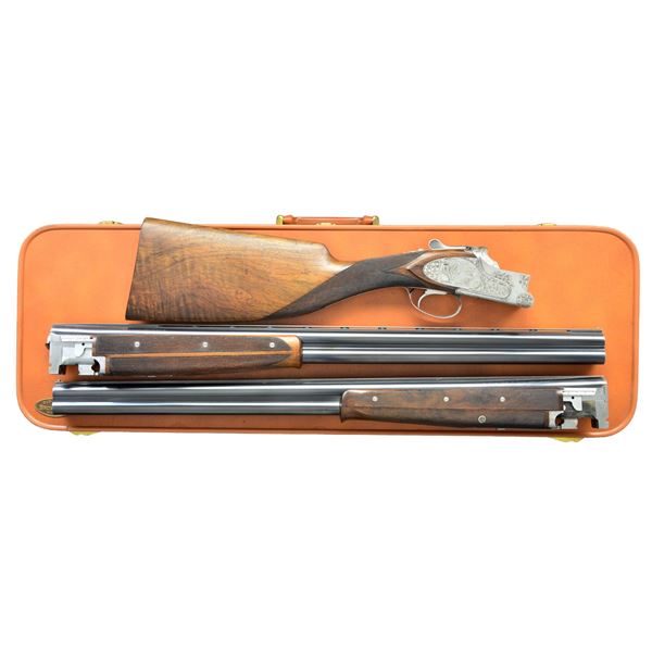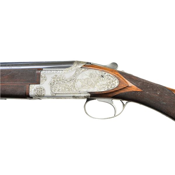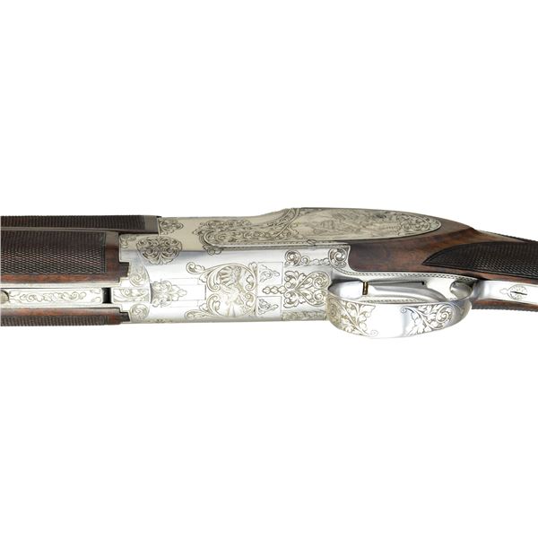 SUPERPOSED SIDE PLATED O/U SHOTGUN. Cal. 12 Ga. S# 78483S7. Spectacular 2 bbl. set shotgun with Chambord (F1) Royal style engraving. This is the finest European style engraving pattern offered by FN. Game scenes feature flying mallards on right side plate with flushing pheasants on right side plate and flushing quail on floorplate. Scenes are surrounded by foliate scroll and chain stitched borders that extend to top lever, trigger guard, forearm iron and breech section of bbls. Satin silver finished action features a single selective trigger and selective ejectors. Wood and checkering are the finest that FN offered. Schnable tipped 3 piece forearm and long tang swan neck stock have an oil type finish on dark European walnut having fiddle figure with prominent dark streaking. Elegant hand checkering wraps over the top of the wrist. Forearm has extensive checkering on upper and lower sections. LOP: 14 3/8" to a wood butt with French style skip line hand checkering. DAC: 1 5/8". DAH: 1 7/8". Stock has approx. 3/8" cast off. Both bbls. are 27 5/8" with narrow 5mm hand matted vent ribs. Original choke markings on both bbls. are 2 stars under and 1 over, signifying M & F. (Bbl. No. 1) Small steel front bead. Bore diameter: U .723, O .727". Choke constriction: U .017", O .038". Minimum wall thickness: U .040", O .036". (Bbl. No. 2) Large steel front bead. Bore diameter: U .727", O .728". Choke constriction: U .016", O .021". Minimum wall thickness: U .030", O .028". WEIGHT: 6 lbs, 14 ozs. Mfg. in Belgium for the European market in 1967. UNATTACHED ACCESSORIES: Hartman 2 bbl. set case with white plastic handle insert, fleece lining and original key. Case is in very good condition. CONDITION: near excellent showing little if any use. Bbls. and action retain over 98% original finish. Bbl. set no. 2 shows light slide wear from forearm with small mark on right side of bottom bbl. Stock has excellent wood finish. Checkering on left side of wrist has a few bruised diamonds. Forearm 2 has small handling marks on left side at tip. All bores are bright and near excellent. (23-650/DS). CURIO. $5,000-8,000.