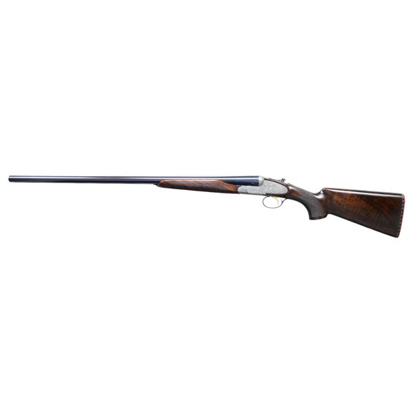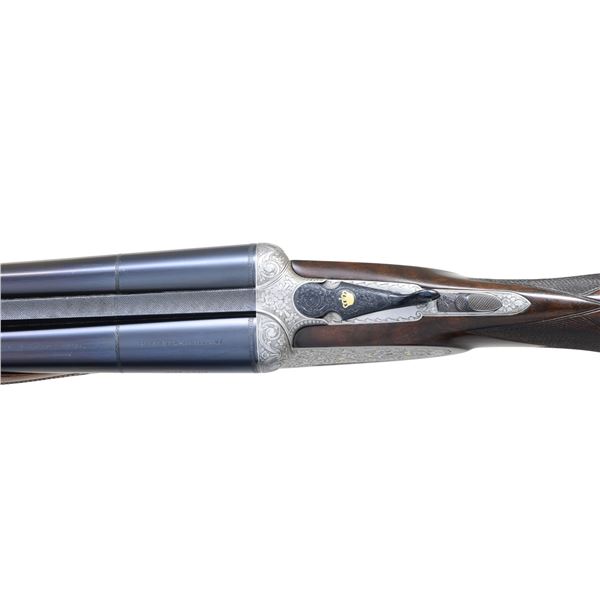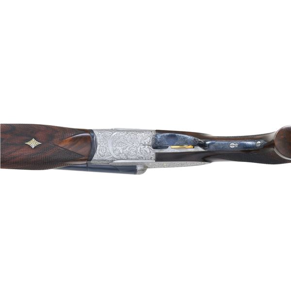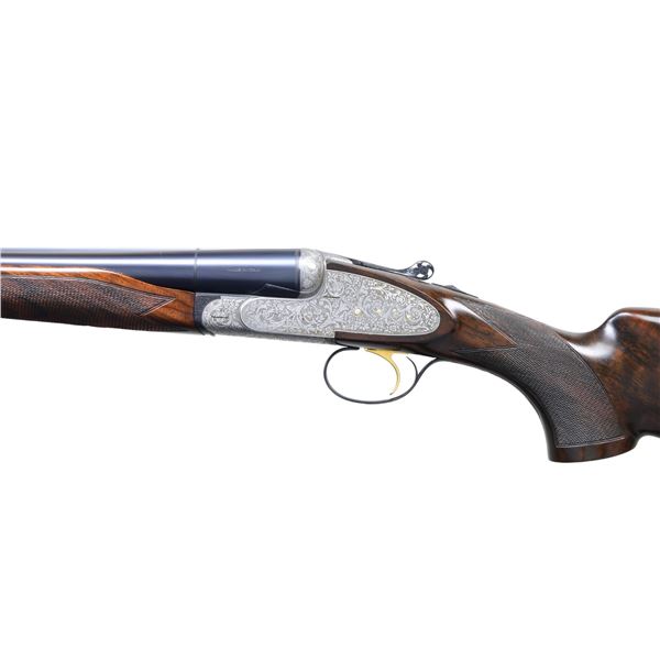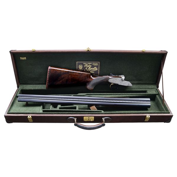 SIDELOCK EJECTOR SINGLE TRIGGER GAME GUN WITH CASE. Cal. 12 Ga. 2-3/4". S# H0409. Top of the Beretta 451 line; this gun has 27-7/8" mono-block barrels fitted with narrow matted game rib. Steel and Beretta info are on top of left barrel. Barrel flats are stamped with 1973 Italian nitro proofs and grade. Coin finished sidelock action features non-automatic safety, bushed strikers and gold plated non-selective single trigger. Action and lockplates are engraved with nearly full coverage of nicely cut and delicately shaded large open scrolling, acanthus with rose bouquet highlights. Maker's name and address are in an arched banner on bottom of action. This well done engraving is signed "Pedersoli" on trigger plate. (The highly regarded Gianfranco who has worked for many best quality makers.) Blued top lever with pierced thumb piece is gold inlaid with a crown. Trigger guard with scroll engraving on bow has S# on tang. Pistol grip buttstock made of a dense piece of fiddle figured and dark streaked European walnut measures 14-3/8" over thin brown Beretta pad. Point pattern checkering is at grip and a gold oval on toeline is engraved with the monogram "AP". Matching beavertail ejector forend has Anson release. MEASUREMENTS: BBLS: Bore Diameter: L .729. R .728. Restriction: L .040 (extra full). R .021 (mod). Wall thickness: L .030. R .032. STOCK: DAH: 1-15/16". DAC: 1-1/4". CAST: about 1/2" off. LOP: 14-3/8". WEIGHT: 7 lb. 4 oz. UNATTACHED ACCESSORIES: gun is housed in it's original dark brown leather case by Nizzoli, which features stitched leather corners and brass latches. Interior is lined in olive green felt and a brown leather Beretta label is stitched into lid. Bottom compartment is semi-French fitted for barrel and action. A covered compartment contains a key. CONDITION: exceptionally fine. Essentially "as new"; appears unfired. There are a few minor handling and assembly marks on wood and metal most notable are some silver rub marks which are only visible with forend removed. Bores are bright and shiny; mechanically crisp. Case is also very fine with some minor rubs on exterior and some compressions in interior cloth. This attractive gun retails at nearly $20,000. (25-941/MGM). CURIO. $6,500-9,500.