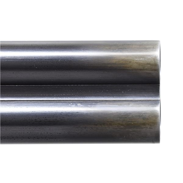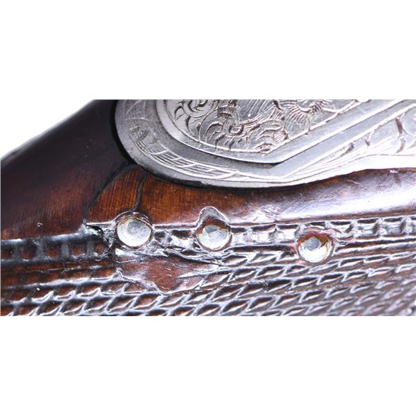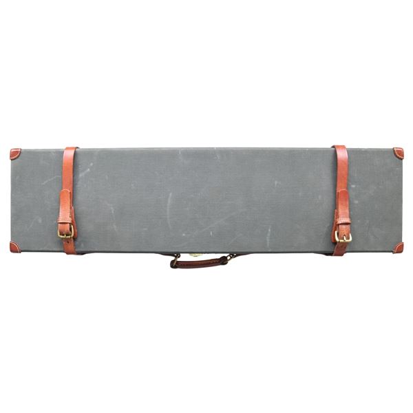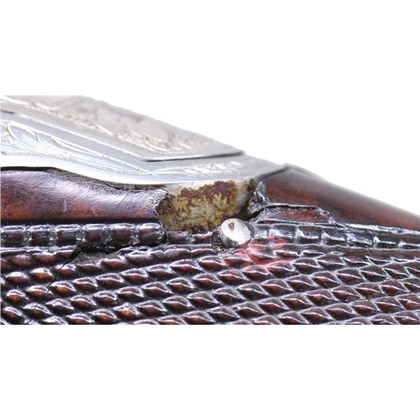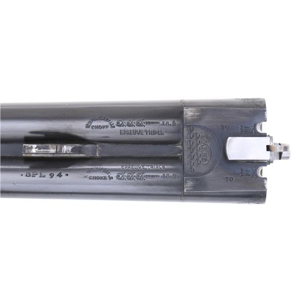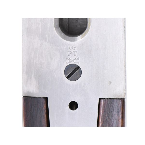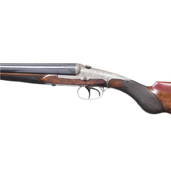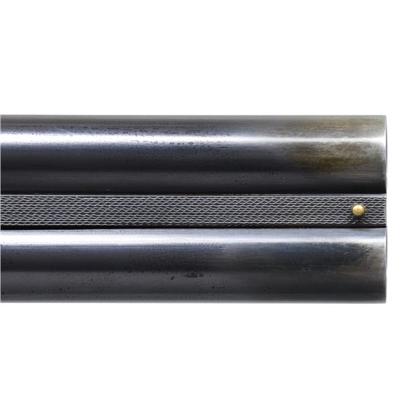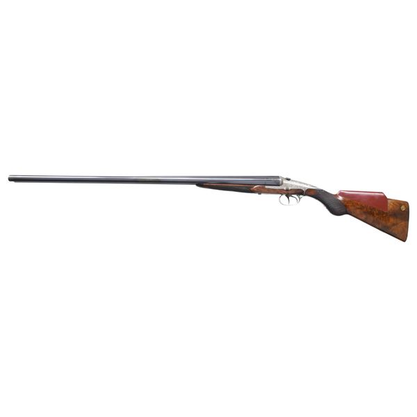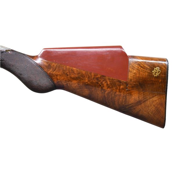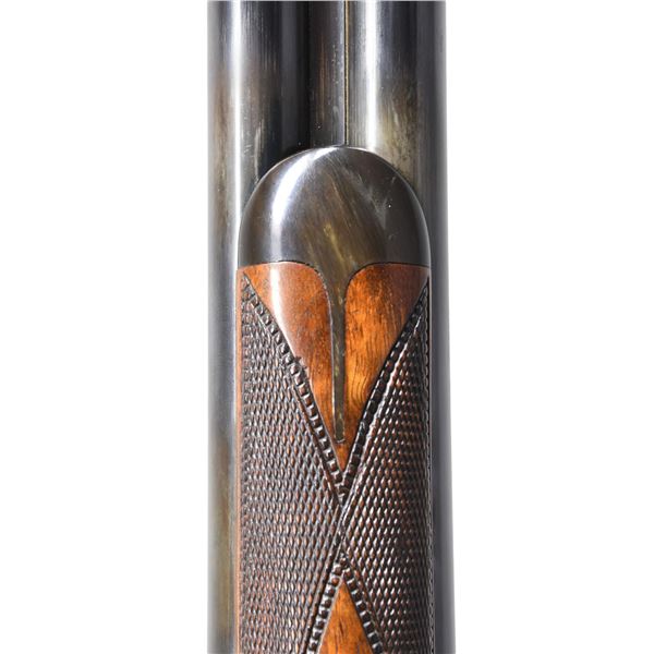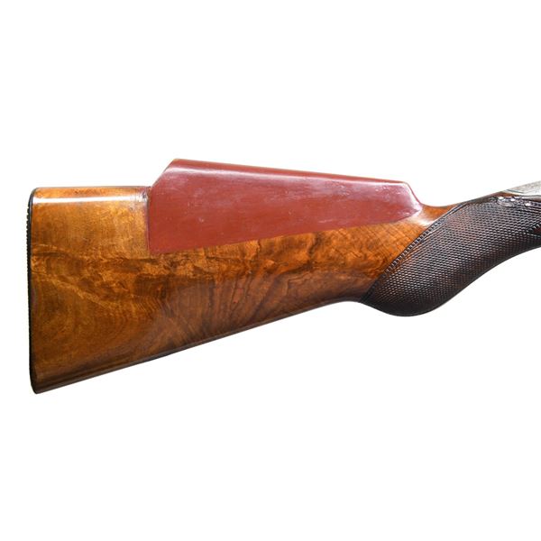 Cal. 12 Ga, 2 3/4". S# SPL94. The 31 1/2" barrels have slightly raised matted rib with front bead. Fixed Full chokes. Breech end of barrels & rib have oak leaf engraving. Grey sliding breech action with generous coverage of floral scroll engraving; fences show deep relief carving of floral scroll. Two piece walnut stock set with point pattern checkering. Replacement triggerguard bow has epoxy fill in previous inletting in tang & in front of triggerguard is added push button barrel release surround by epoxy filler. Forearm tip is ebony. Added piece of wood painted red on top of comb. LOP: 14" to grooved buttplate. Left side of buttstock has gold inlaid initials that appear to be "PGR". Left side of buttstock has numerous hand scratched writing appearing to be related to the added comb. DAC: 1 5/8". DAH: 2 1/4". WEIGHT: 7 lbs., 7 oz. UNATTACHED ACCESSORIES: canvas luggage case with leather reinforcements. Case contains leather sling that attaches around barrels & slot on toeline. CONDITION: balance of barrel blue is good overall with scattered large areas of worn finish having cold reblue finish applied around muzzle, sling contact areas & carrying areas. Very good receiver finish. Stock has 3 pin repair at top of wrist with extra finish applied to wood over numerous small handling marks. Shiny bores. (24-6934/MD). CURIO. $2,000-3,000.