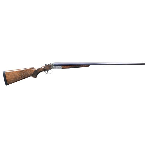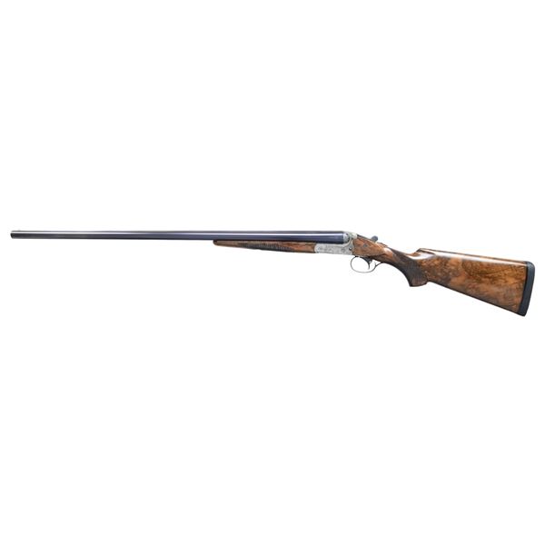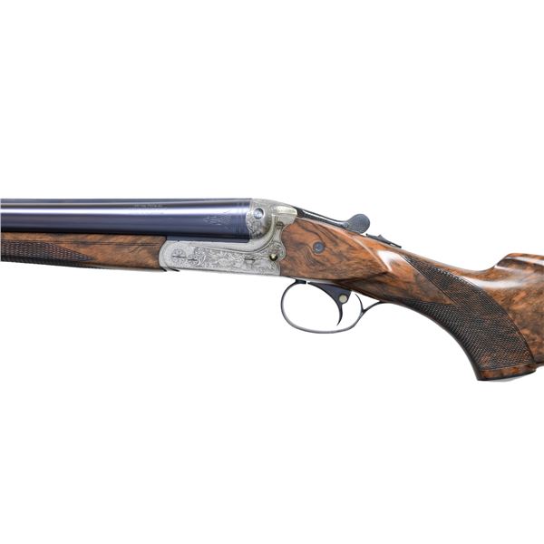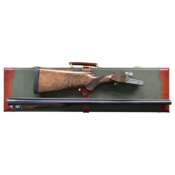 AND CASE. Cal. 12 Ga. 3". S# 383879. This well made model retails for over $7,000. This gun has 30" shoe lump barrels with model and gauge marked on slightly raised matted rib. Barrels are marked with steel type, importer and maker's name and address. Barrel flats are stamped with 2001 German nitro proofs for 3" chambers. Coin finished ogee backed boxlock action features non-automatic safety, cross bolt third fastener, bushed strikers, side clips, pin cocking indicators on sides and single selective trigger. Action is engraved with some geometric borders and scrolls with game scenes on sides. Feeding quail on left and flying quail on right. Left quail scene has engraver's signature "GL". Blued top lever has silver inlay "EL". Trigger guard has scroll engraving on bow. Capped pistol grip buttstock made of well marbled and lightly figured European walnut measures 15-1/4" over black Kick-ezz pad. Point pattern checkering is at grip. Matching splinter ejector forend has Deeley release. MEASUREMENTS: BBLS: Bore Diameter: L .729. R .729. Restriction: L (screw chokes). R (screw chokes). Wall thickness: L .033. R .034. STOCK: DAH: 2-5/8. DAC: 1-1/2". CAST: about 1/4" off. LOP: 15-1/4". WEIGHT: 7 lb. 1 oz. UNATTACHED ACCESSORIES: gun is accompanied by its original green vinyl case with leather corners, lined in green cloth by Emmebi. A leather Merkel label is in lid. Case contains: 2 Briley extended choke tubes, removal tool and two keys. Also included is a plastic box containing 8 matching choke tubes (for a total of 10). CONDITION: very fine retaining nearly all original factory finishes on wood and metal. Buttstock shows a considerable number of fairly heavy marks. Bores are bright and shiny. Mechanically fine. Case is very fine, with some marks. Interior is good. (25-551/MGM). MODERN. $3,700-5,500.