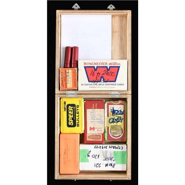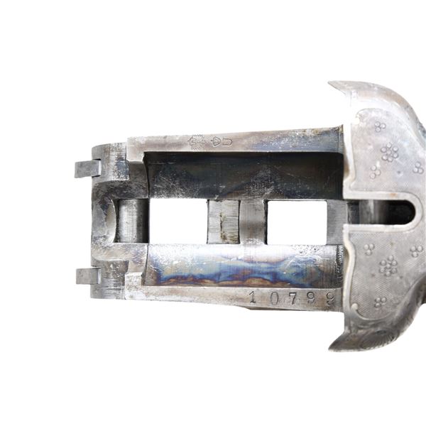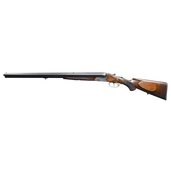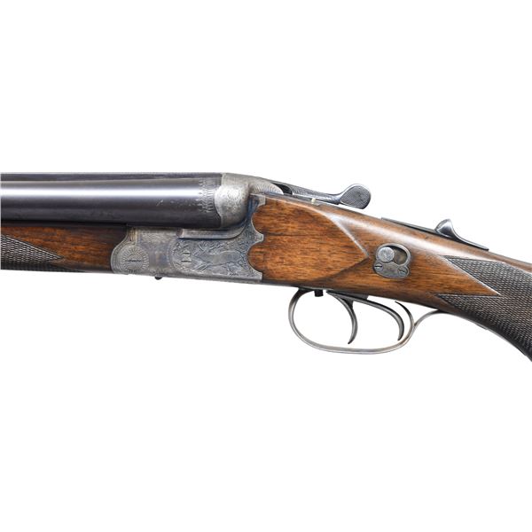 Cal. 16 Ga. / 7.8x57R (or 8x57JR). S# 10799. The Flussstahl 26" barrels have July 1926 German Nitro proofs. Matted top rib has blade front sight & flip up rear sight. Case hardened sculpted boxlock action with deep relief woodland scene engraving having elk on left side & 2 deer on right. Engraving also includes geometric pattern & acanthus scroll throughout. Action features double set triggers, Greener style safety, crossbolt third fastened, side clips, extractors, & top tang rifle barrel selector. Splinter checkered walnut forearm with Deeley release & matching numbered iron. Walnut pistol grip buttstock with hard rubber grip cap, Bavarian cheekpiece, & toeline 3 rd. rifle cartridge trap with sling eye. LOP: 13 3/4" to replacement black Decelerator pad. WEIGHT: 7 lbs., 10 oz. UNATTACHED ACCESSORIES: Letter of prov. states the gun was bought 50 years ago in Essex, Mass. The gun had the skeleton buttplate replaced with a rubber recoil pad. Comes with wooden box containing 2 snap caps, paper on reloading data, 20 fired Win. cases, partial box of Speers 32 cal. 170 gr. .321" flat nose, partial box of 8mm soft nose .321" 170 gr. bullets, partial box of Lyman lead 170 gr. .321" bullets, partial box of 236 gr. Herters .323" soft point. Lyman 32-40/8mm bullet mold, Lyman 8mm GC bullet mold & 2 snap caps. CONDITION: good blue mixing with brown patina shows worn finish around muzzle, marks, & scratches. Action has good vivid case colors in protected areas with balance being a dull gray with areas of patina. Forearm has good finish with deep dents. Buttstock has been lightly sanded & refinished with scattered marks, large crack at top of wrist left side. Replacement pad top screw sits through 1 cartridge trap. Shiny shotgun bores with light pitting forward of chamber. Rifle bore shiny with strong rifling & worn lands. (25-1561/MD). CURIO. $2,000-2500.