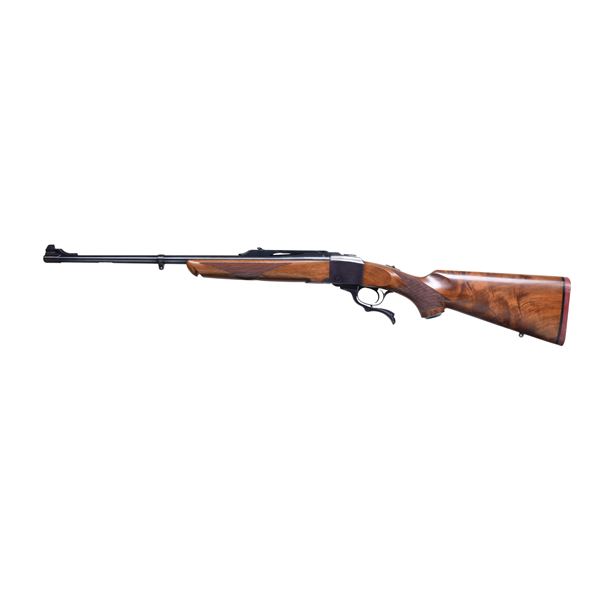 Cal. 243 Win. S# 132-97457 (1994). This Ruger No. 1 features a 22-inch blued barrel with Warning markings. It is equipped with a bead front sight and a flip-up rear sight on quarter rib. The frame has a blued finish with a falling block action. The rifle is fitted with a checkered Alex Henry forearm and a pistol grip buttstock, both made of walnut, with a red rubber pad. CONDITION: The overall condition is near excellent. The barrel retains approximately 98% of its original finish, with the frame retaining about 95% of its blued finish. The forearm and buttstock are in excellent condition with minimal handling marks. The bore is bright and sharp. MODERN (23-6531/MD) $1,000-1,500.