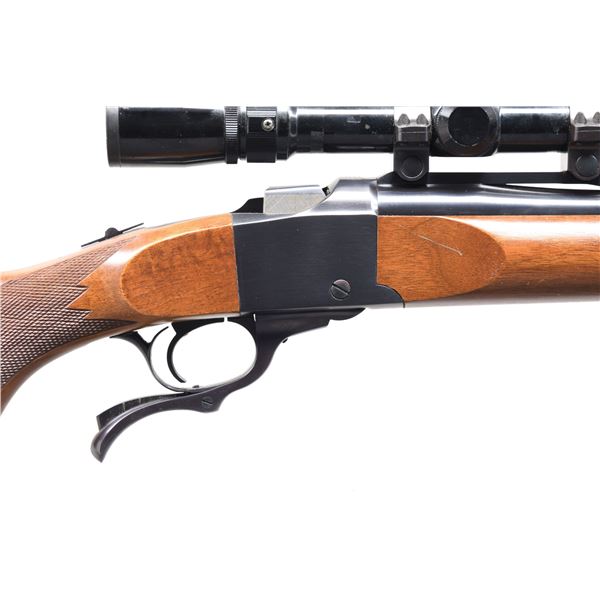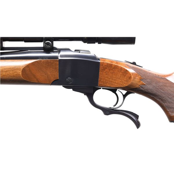 Cal. 243 Win. S# 132-88297. Bbl. 26" round w/ quarter rib. Nikon 3-9x40 gloss finished scope w/ duplex reticle on Ruger rings. Semi-beavertail forearm & pistol grip stock of fancy walnut w/ cut checkering, steel grip cap, solid red pad & swivel bases. CONDITION: over 97% blue. Original wood finish shows small dents & marks. Near excellent bore. Scope has clear optics. (24-5825/DS). MODERN. $1,000-1,400.