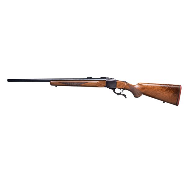 RIFLE. Cal. 25-06. S# 130-28067 (1976). This Ruger No. 1 rifle features a blued finish. It has a 24-inch barrel Liberty marking; drilled & tapped for Ruger bases The frame is blued with a checkered walnut stock set. The forearm is checkered and configured as a standard forearm. The buttstock is a pistol grip design with a checkered finish and a red rubber pad. CONDITION: Overall, this rifle is in near excellent condition. The barrel retains approximately 98% of its original finish. The frame retains about 95% of its finish turning plum tone. The forearm and buttstock are in excellent condition with minimal handling marks. The bore is bright with strong rifling. MODERN (23-6412/MD) $800 - $1,200.