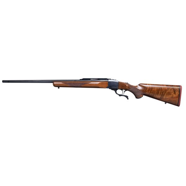 Cal. 257 Roberts S# 132-49359 (1982). This Ruger No. 1 rifle features a blued finish. It has a 26-inch barrel with Warning marks, & quarter rib. The frame is blued with a checkered walnut stock set. The forearm is checkered and configured as a standard forearm. The buttstock is a pistol grip design with a checkered finish and a red rubber pad. CONDITION: Overall, this rifle is in near excellent condition. The barrel retains approximately 95% of its original finish. The frame retains about 90% of its finish having plum tone. The forearm and buttstock are in excellent condition with minimal handling marks. The bore is bright with strong rifling. MODERN (23-6372/MD). $900 - $1,400.