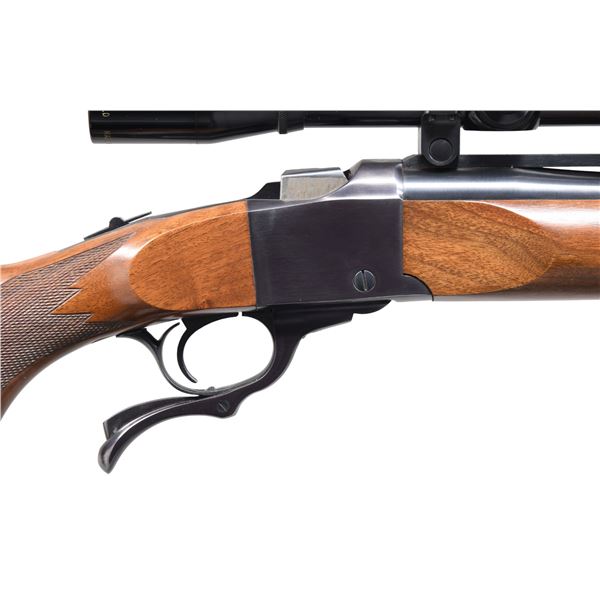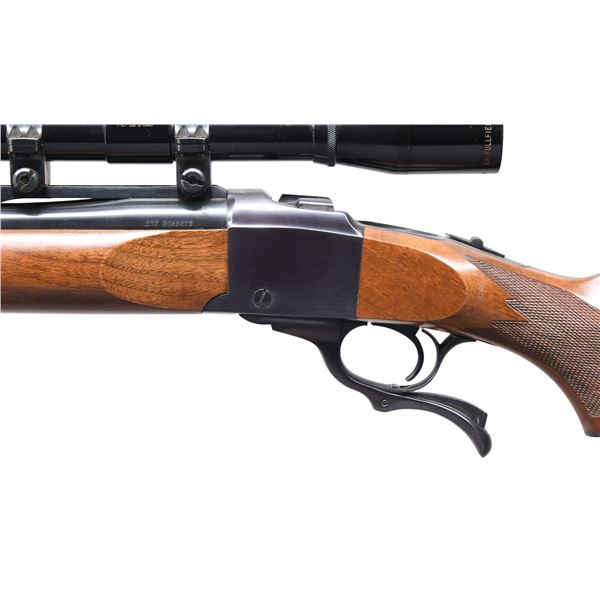 Cal. 257 Roberts. S# 132-69416. Bbl. 26" round w/ quarter rib. Burris Fullfield 6x40 gloss finished scope w/ duplex reticle on Ruger rings. Semi-beavertail forearm & pistol grip stock of nicely grained walnut w/ cut checkering, steel grip cap, solid red pad & QD swivels. CONDITION: over 98% blue. Very good wood finish shows a few very small marks. Bright near excellent bore. Scope has clear optics. (24-5824/DS). MODERN. $1,000-1,400.